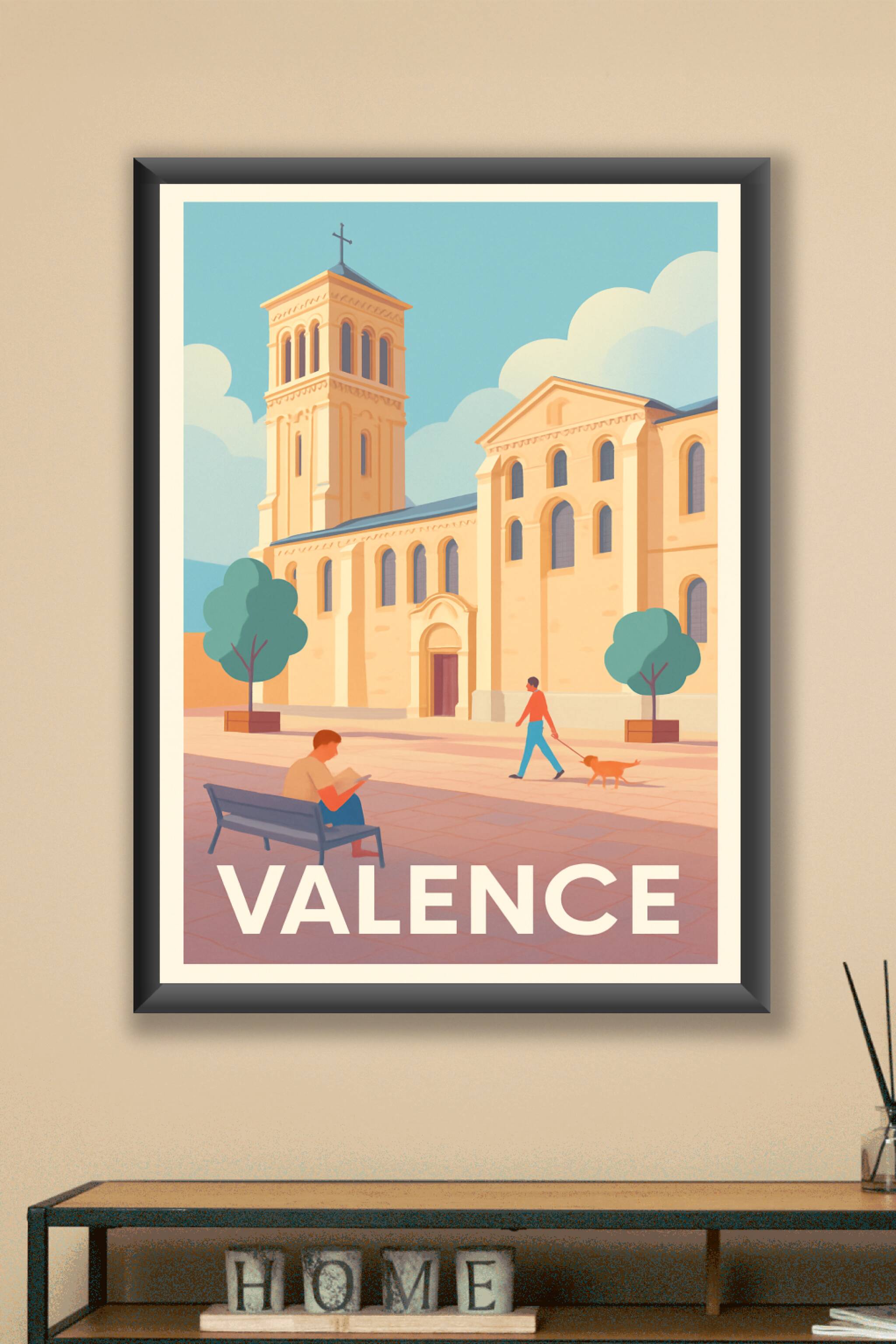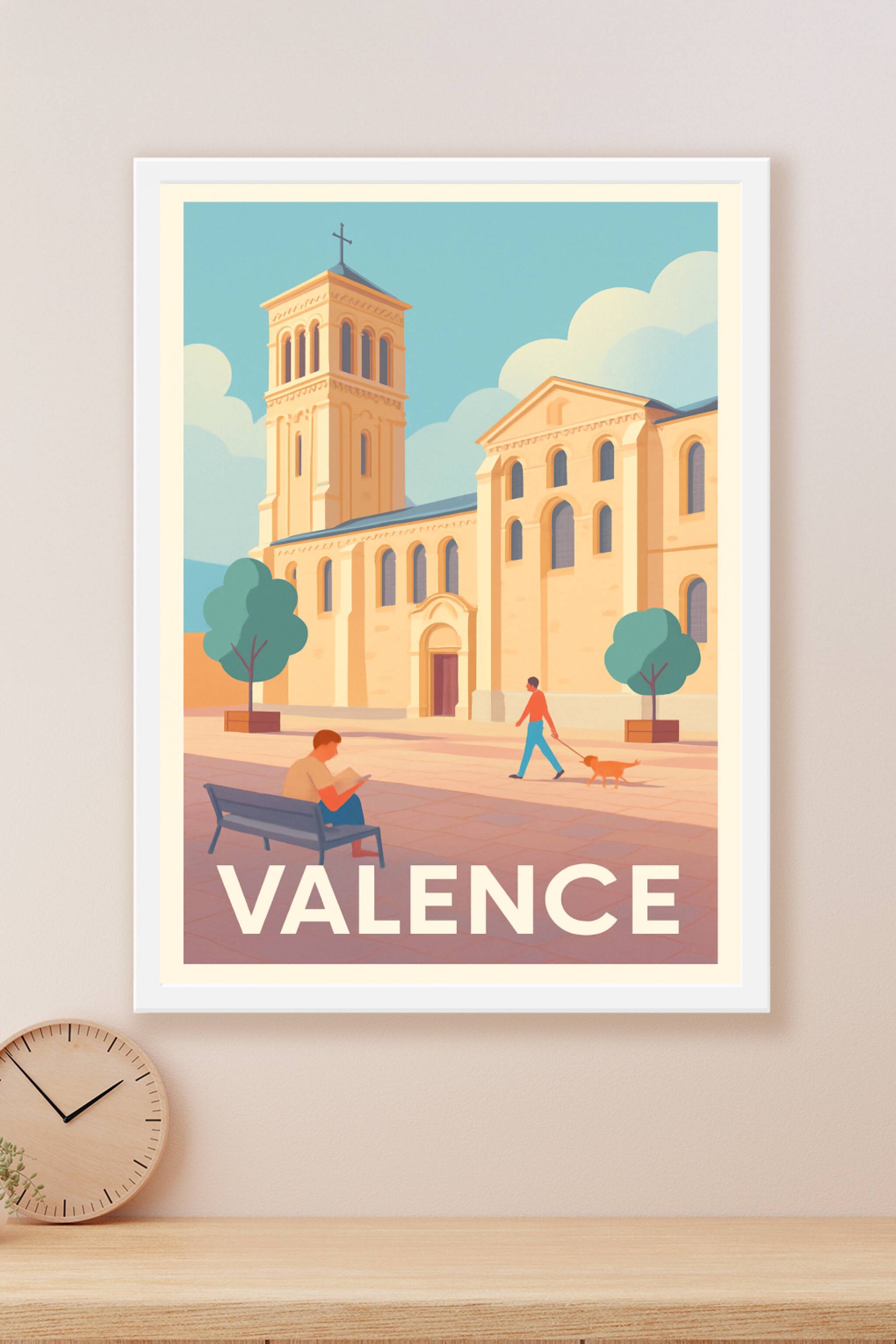 Découvrez l'atmosphère paisible et lumineuse de Valence avec cette affiche illustrée au charme intemporel. Le poster met en scène un bâtiment emblé...