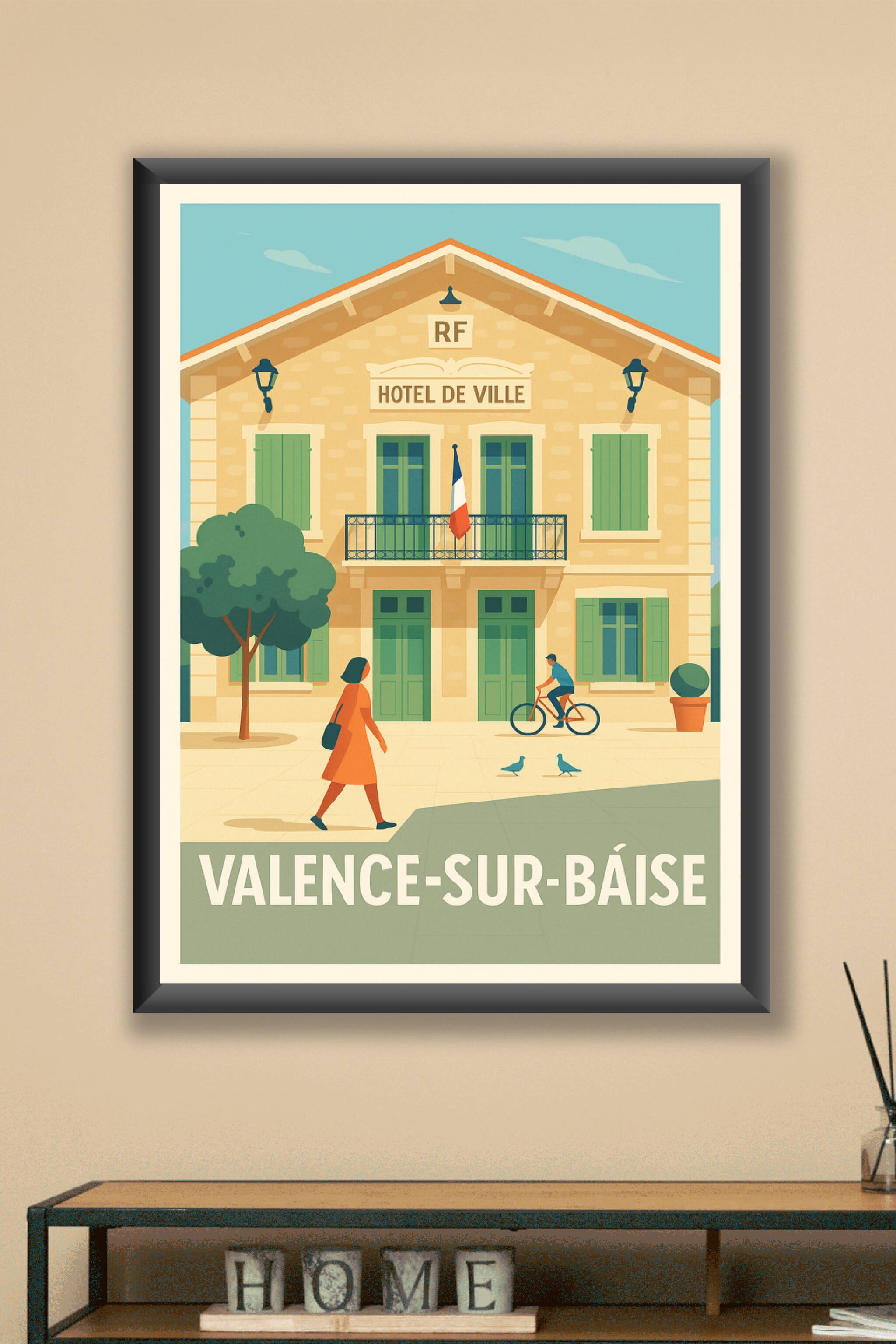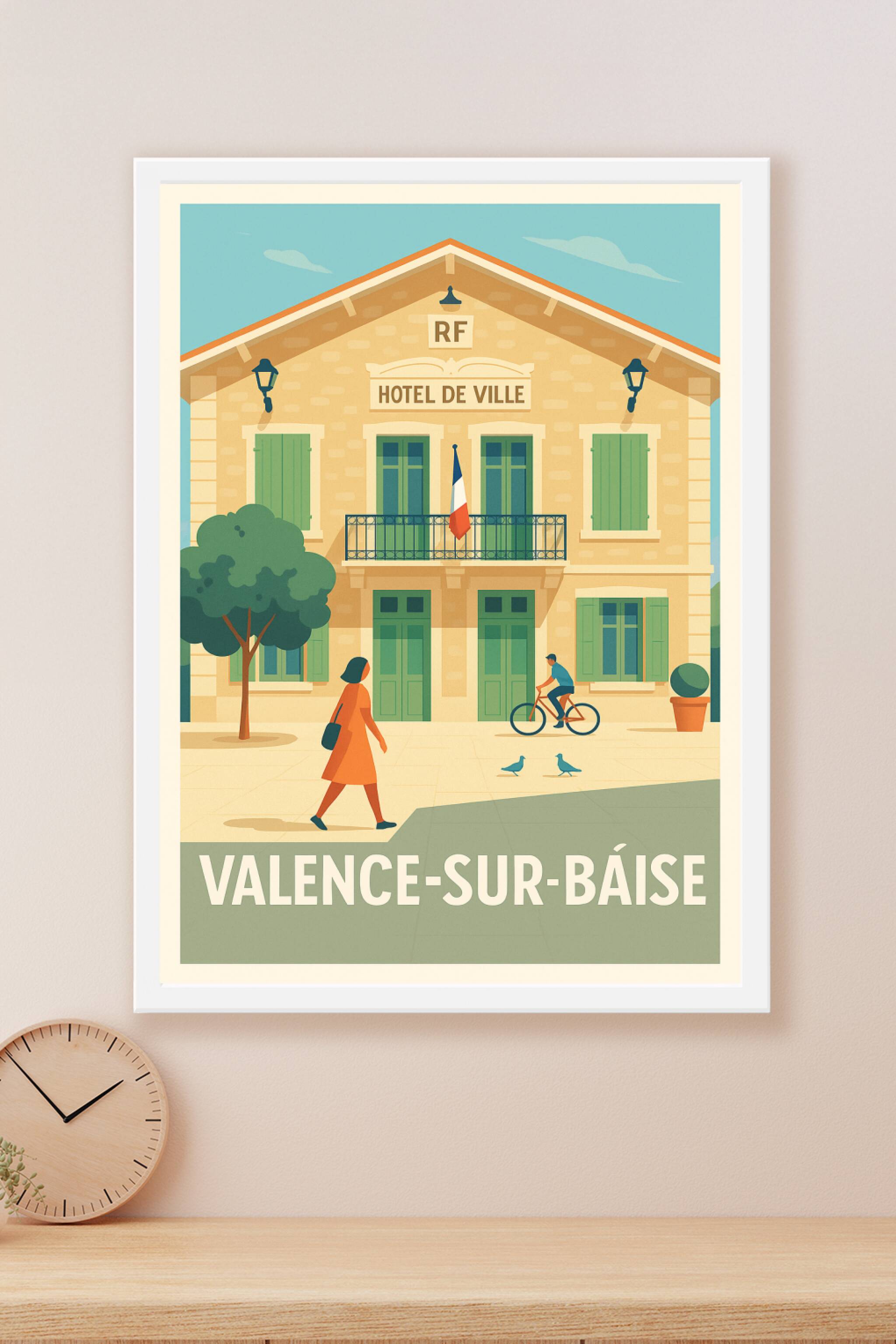Découvrez l'élégance et la sérénité de Valence-sur-Baïse à travers cette affiche illustrée mettant en scène l'hôtel de ville typique et ses volets ...