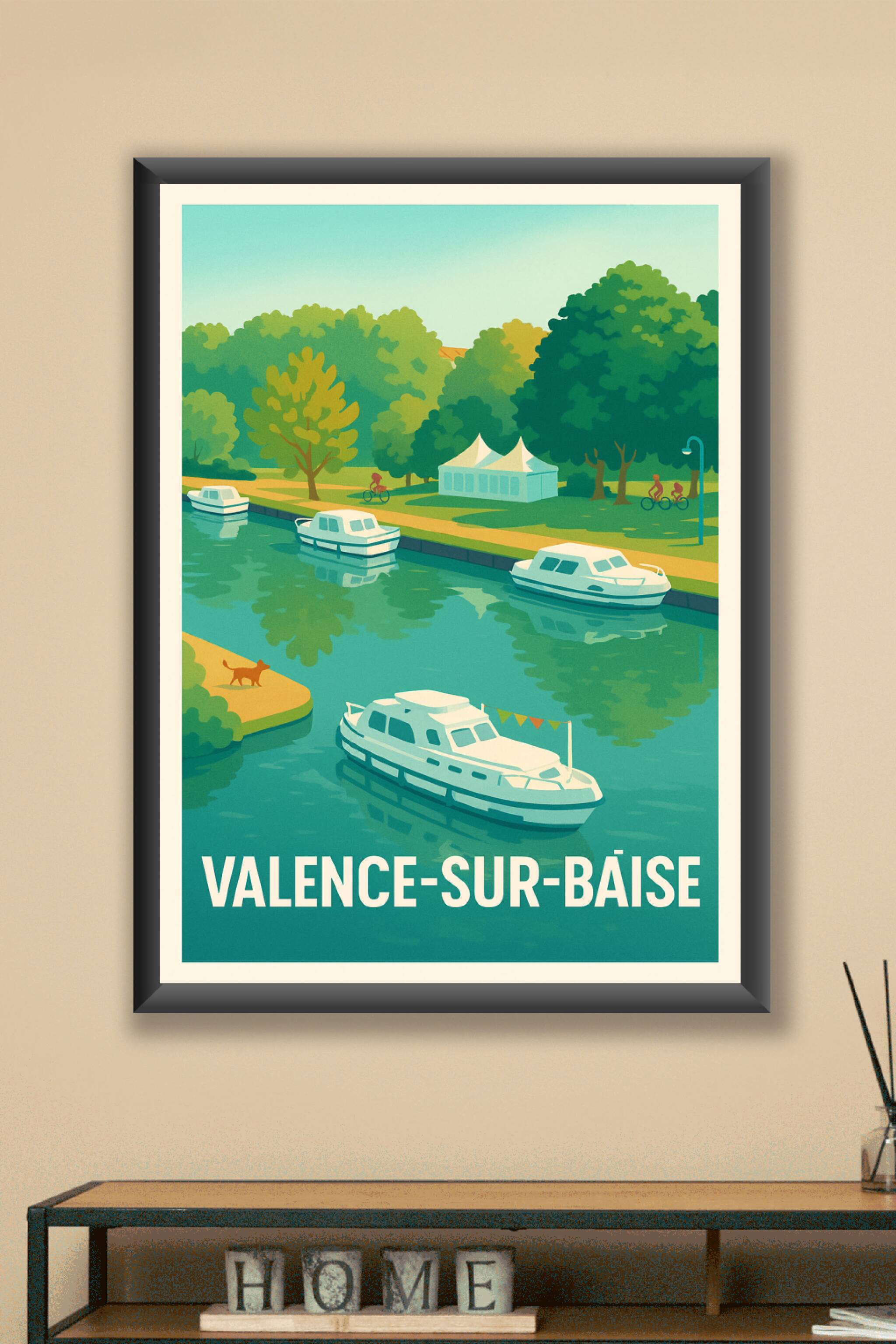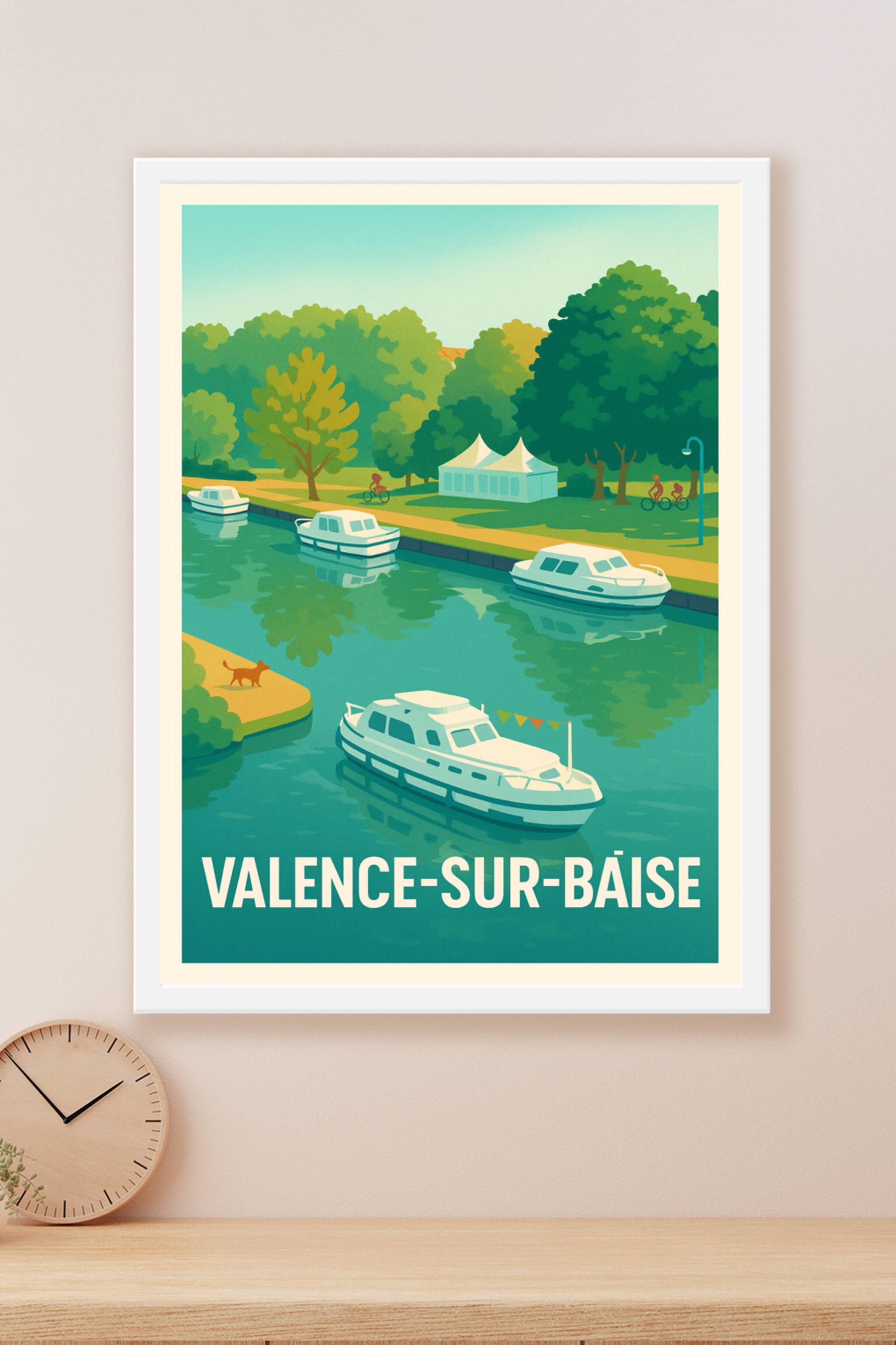 Découvrez la douceur de vivre de Valence-sur-Baïse à travers cette affiche illustrée qui capture un canal paisible bordé d'arbres luxuriants et de ...