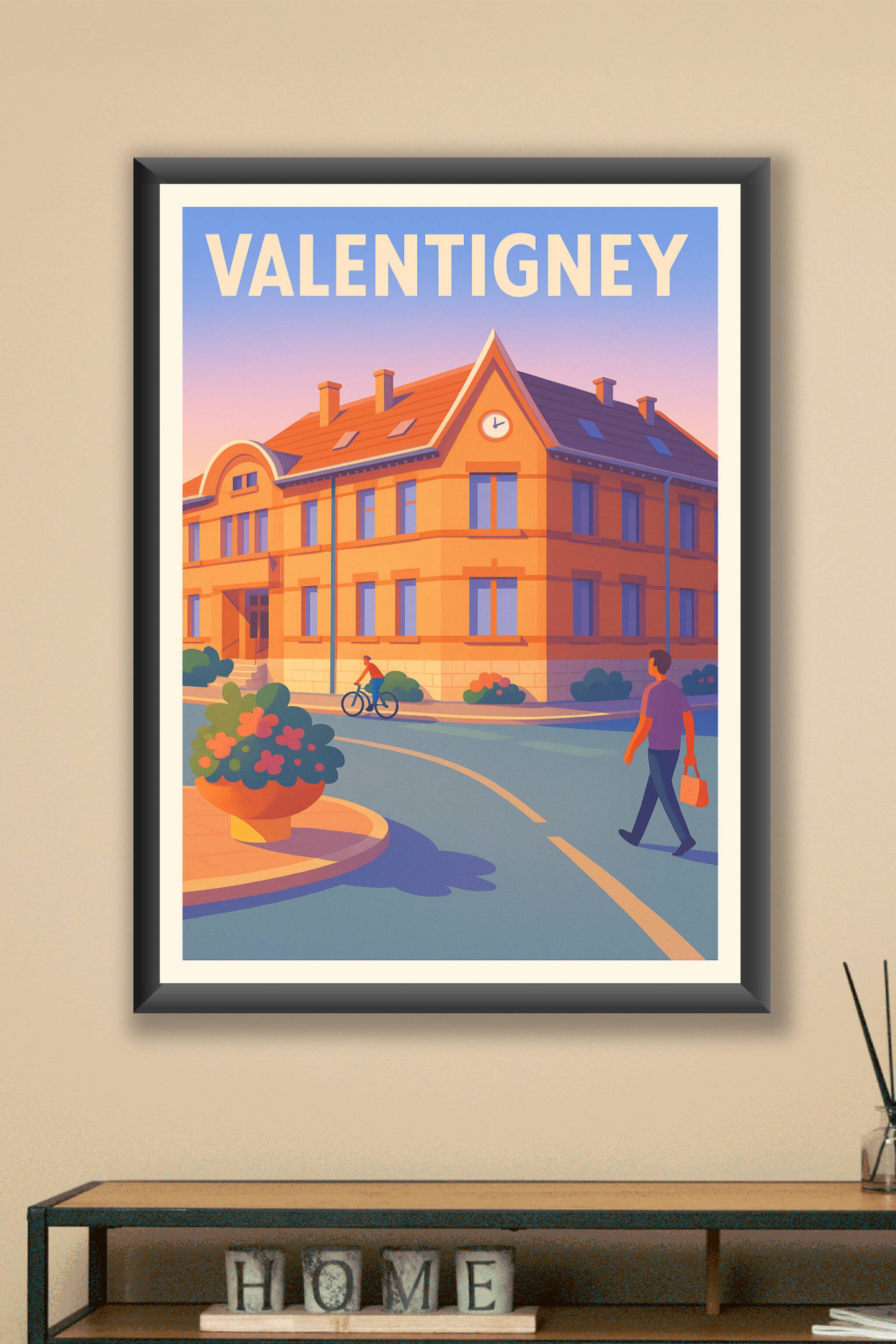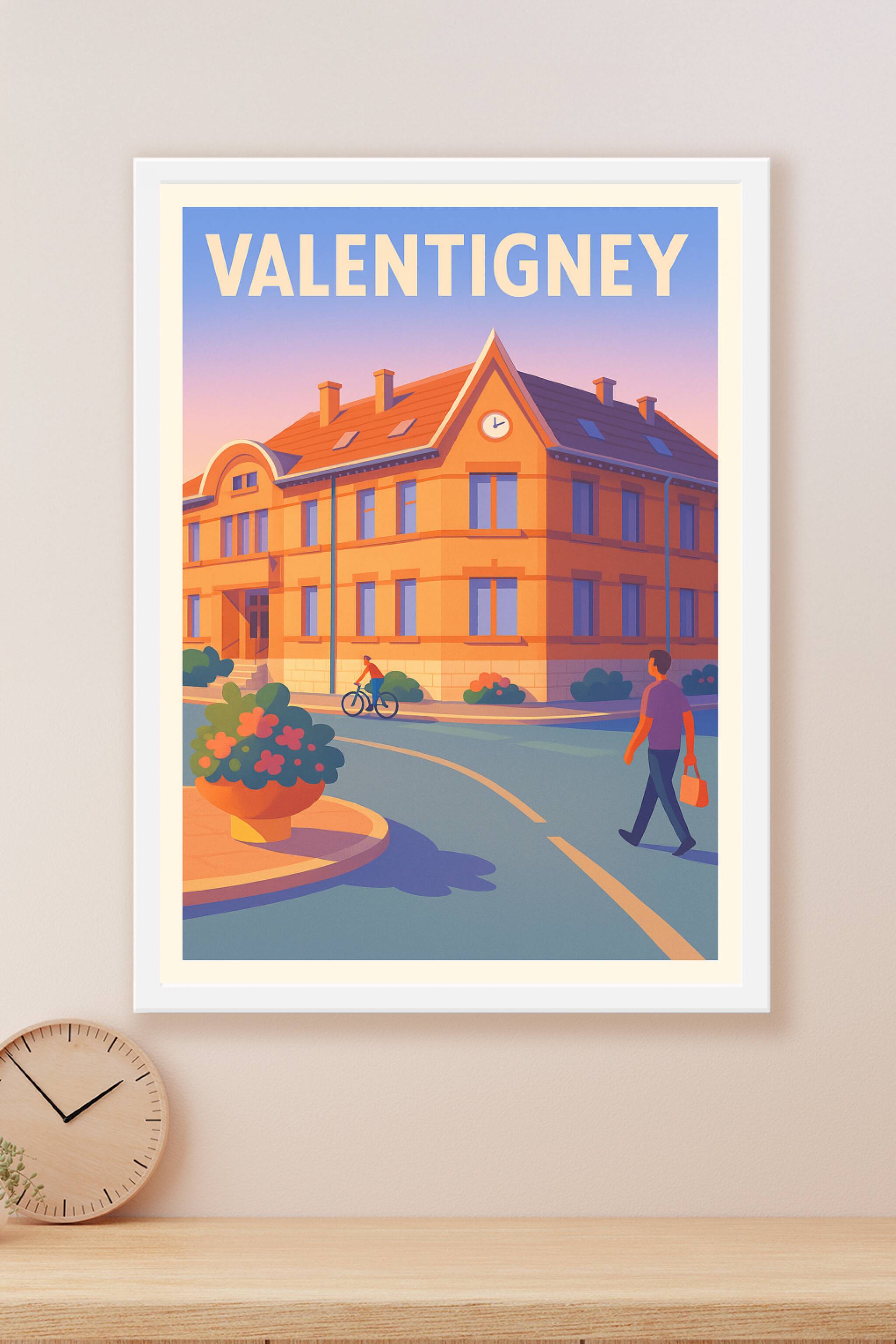 Découvrez cette affiche illustrée mettant en valeur la tranquillité et le charme de Valentigney, avec son architecture chaleureuse baignée d'une lu...
