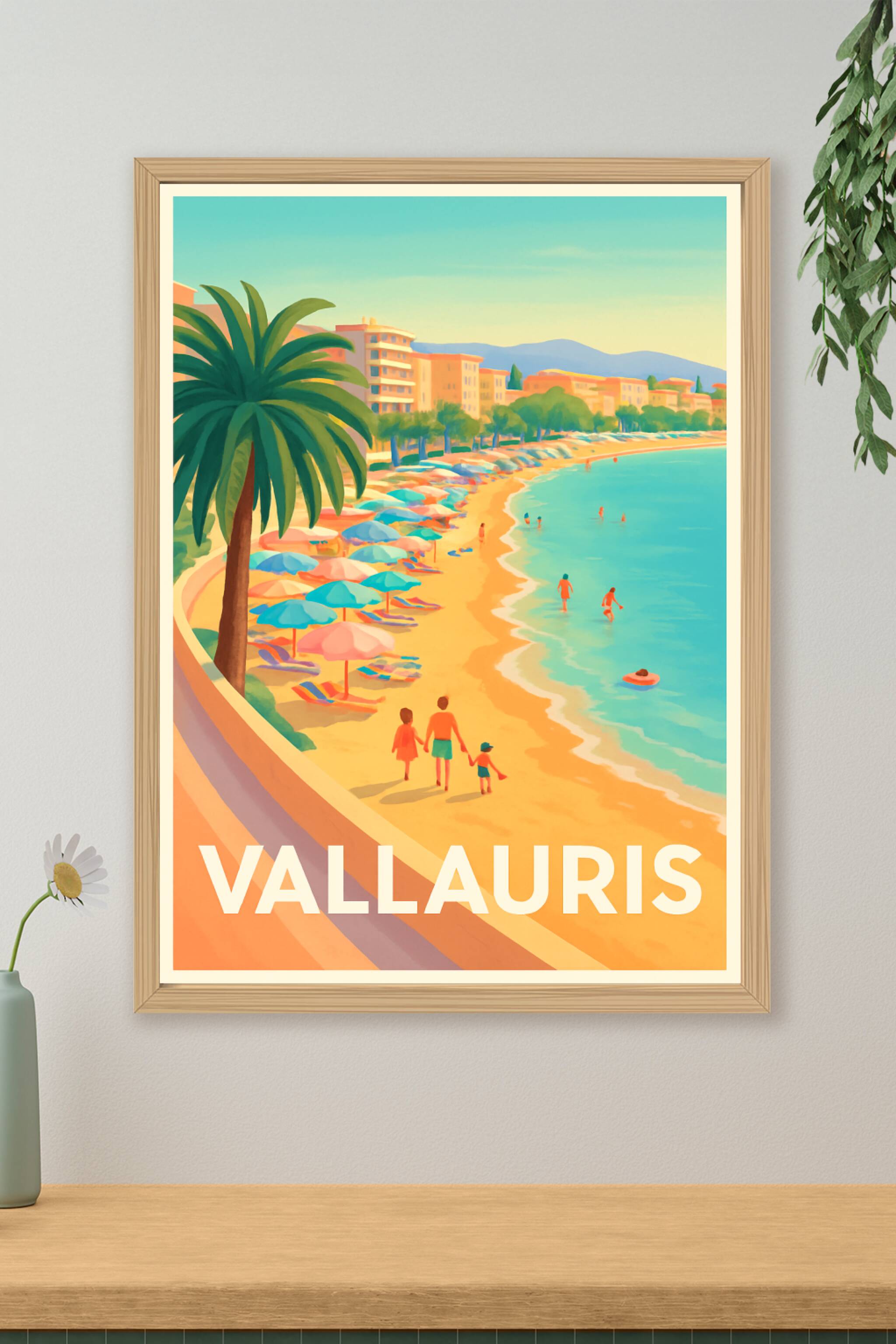 Découvrez la douceur de vivre de Vallauris avec cette affiche illustrée aux couleurs chaudes et lumineuses, évoquant une promenade paisible au bord...