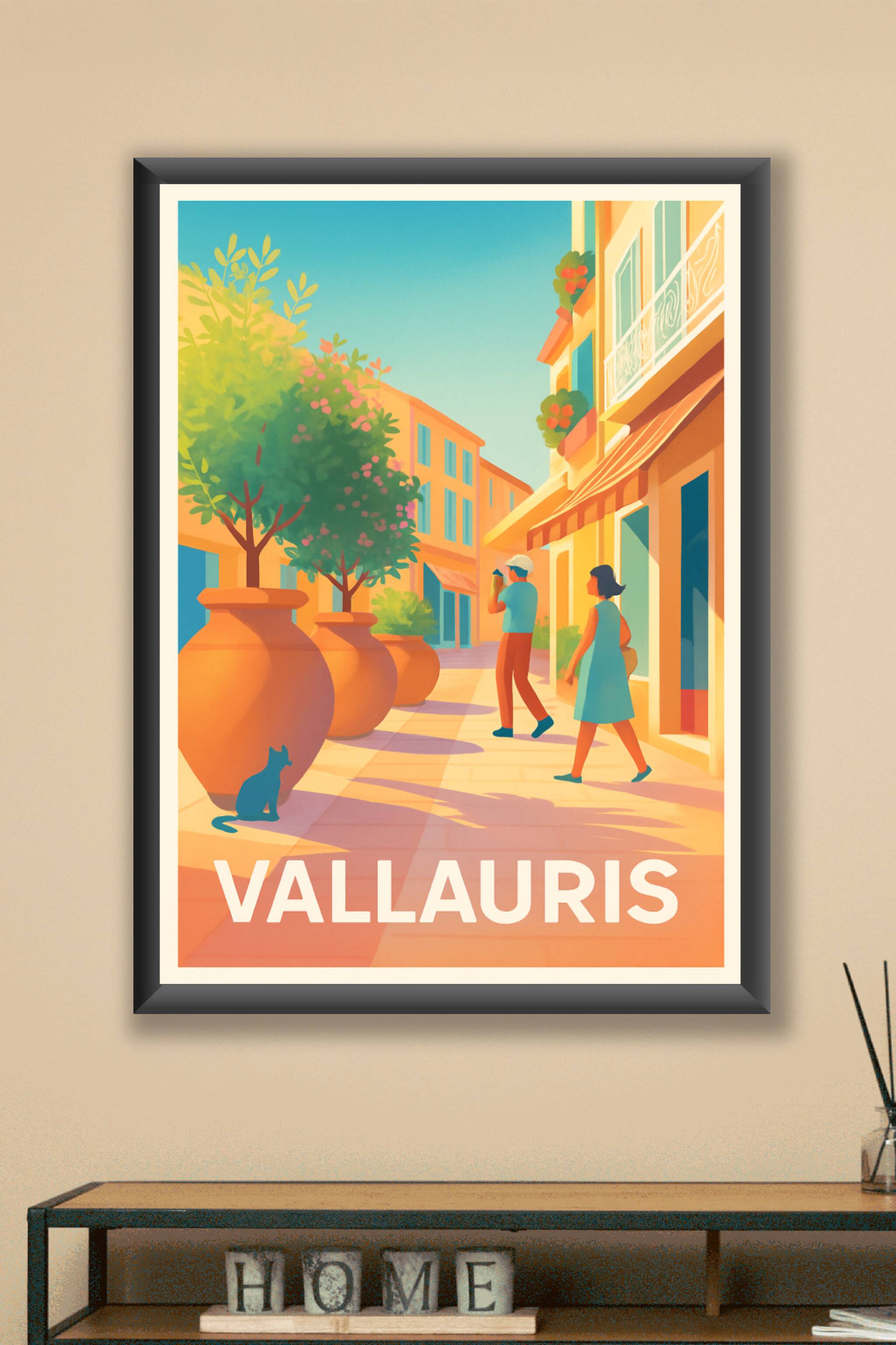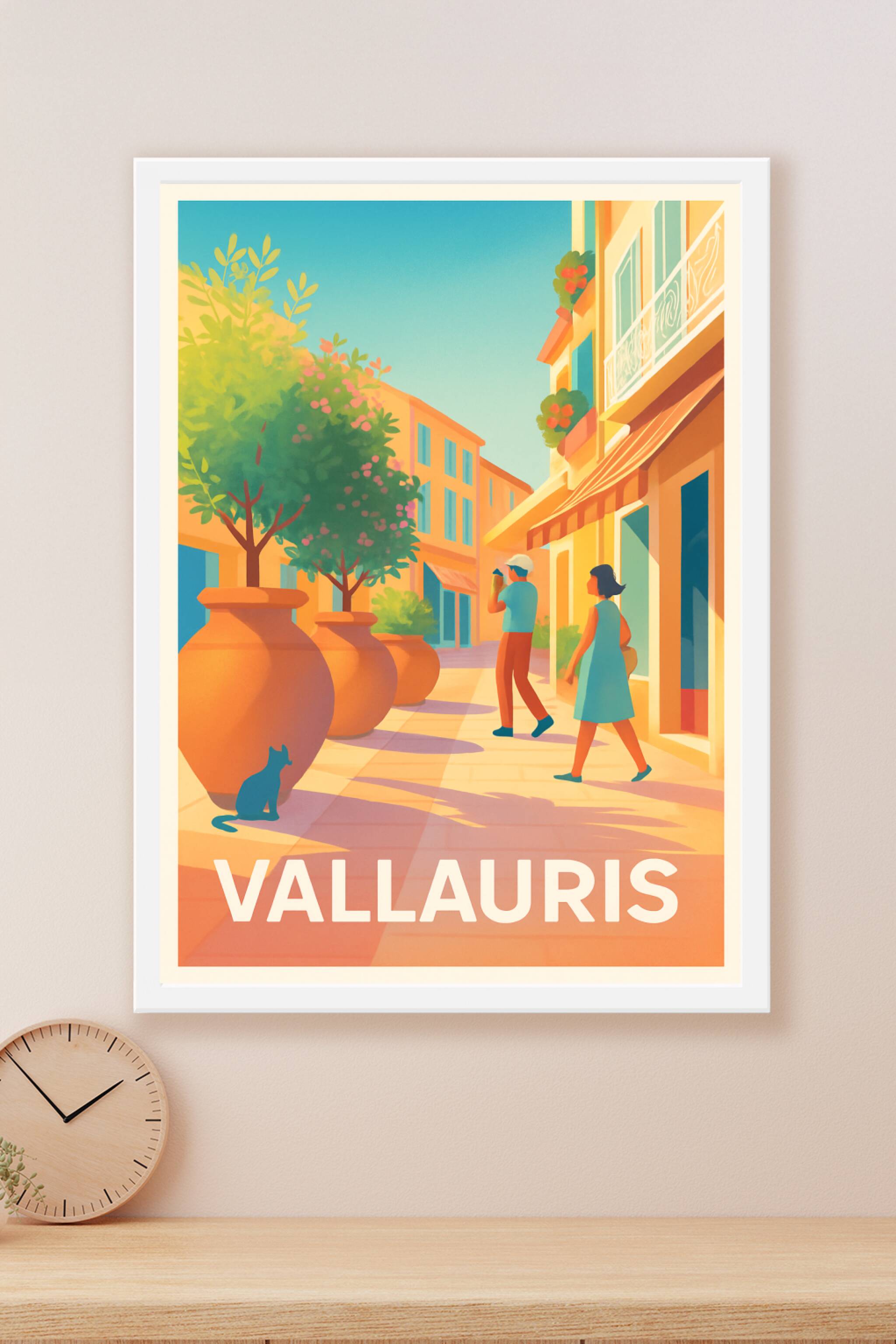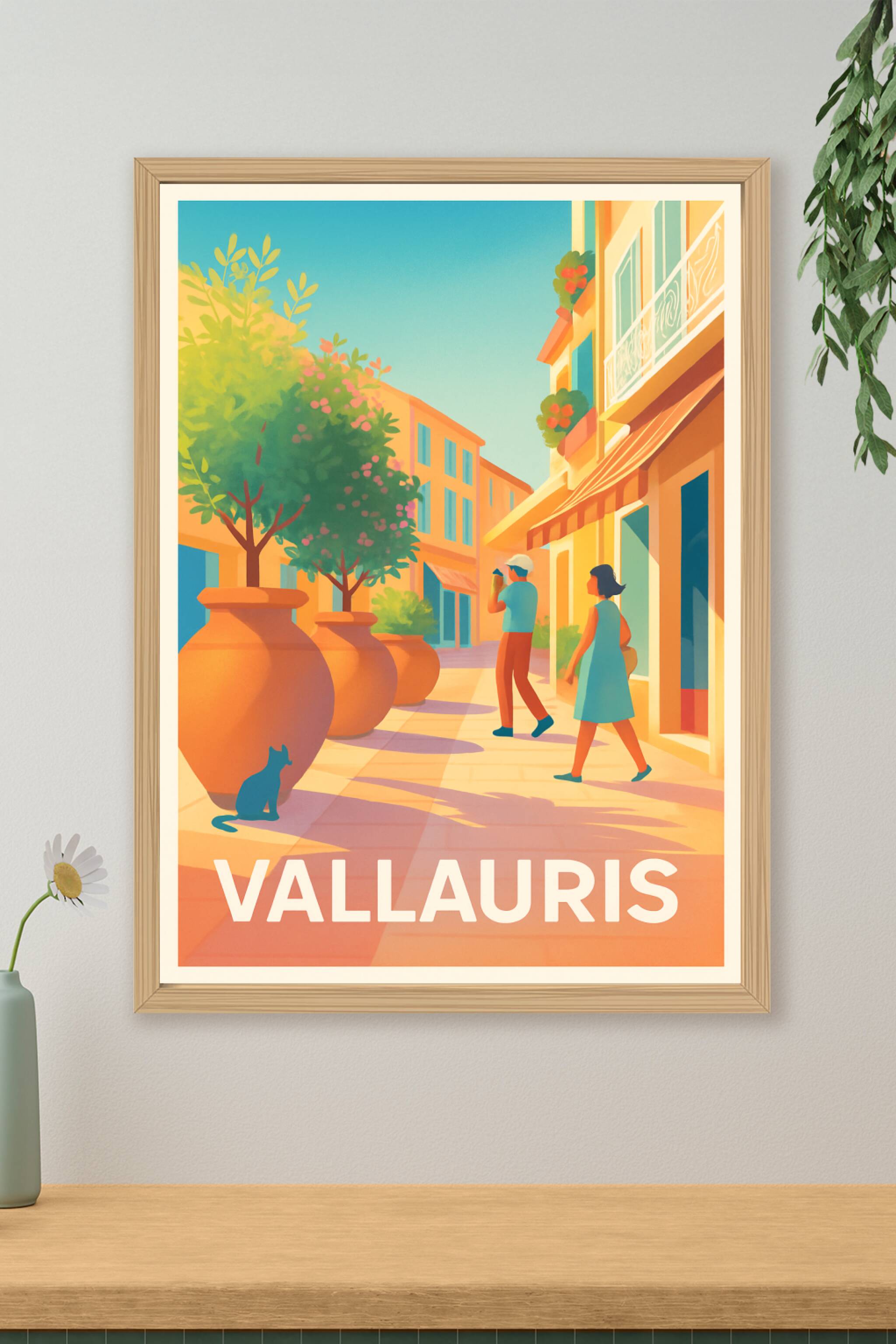 Laissez-vous transporter par cette affiche pleine de charme qui capture l’ambiance lumineuse et paisible des ruelles de Vallauris. Entre grandes po...