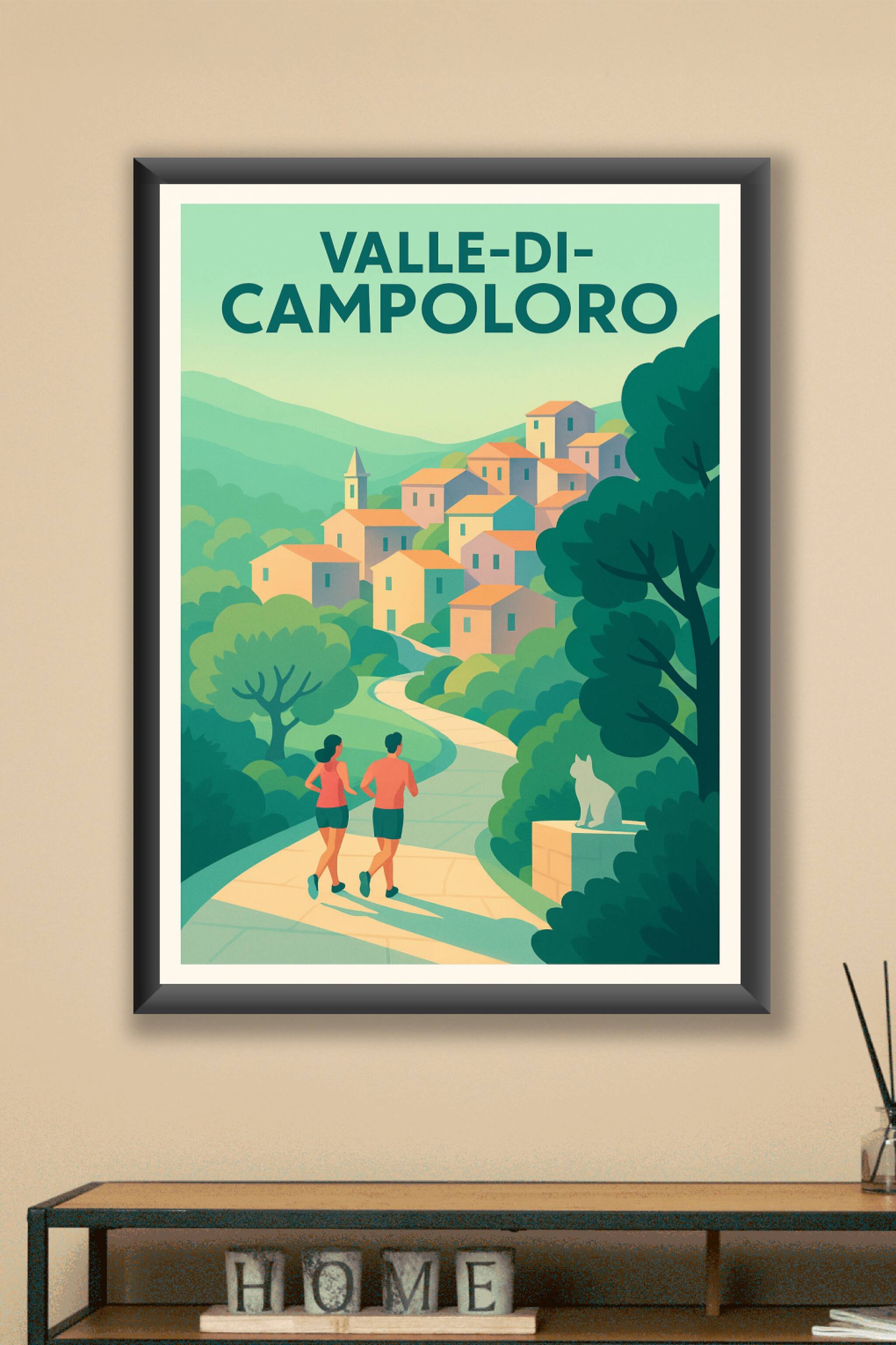 Découvrez la sérénité et la douceur de vivre corses avec cette affiche illustrée représentant le charmant village de Valle-di-Campoloro niché au cœ...