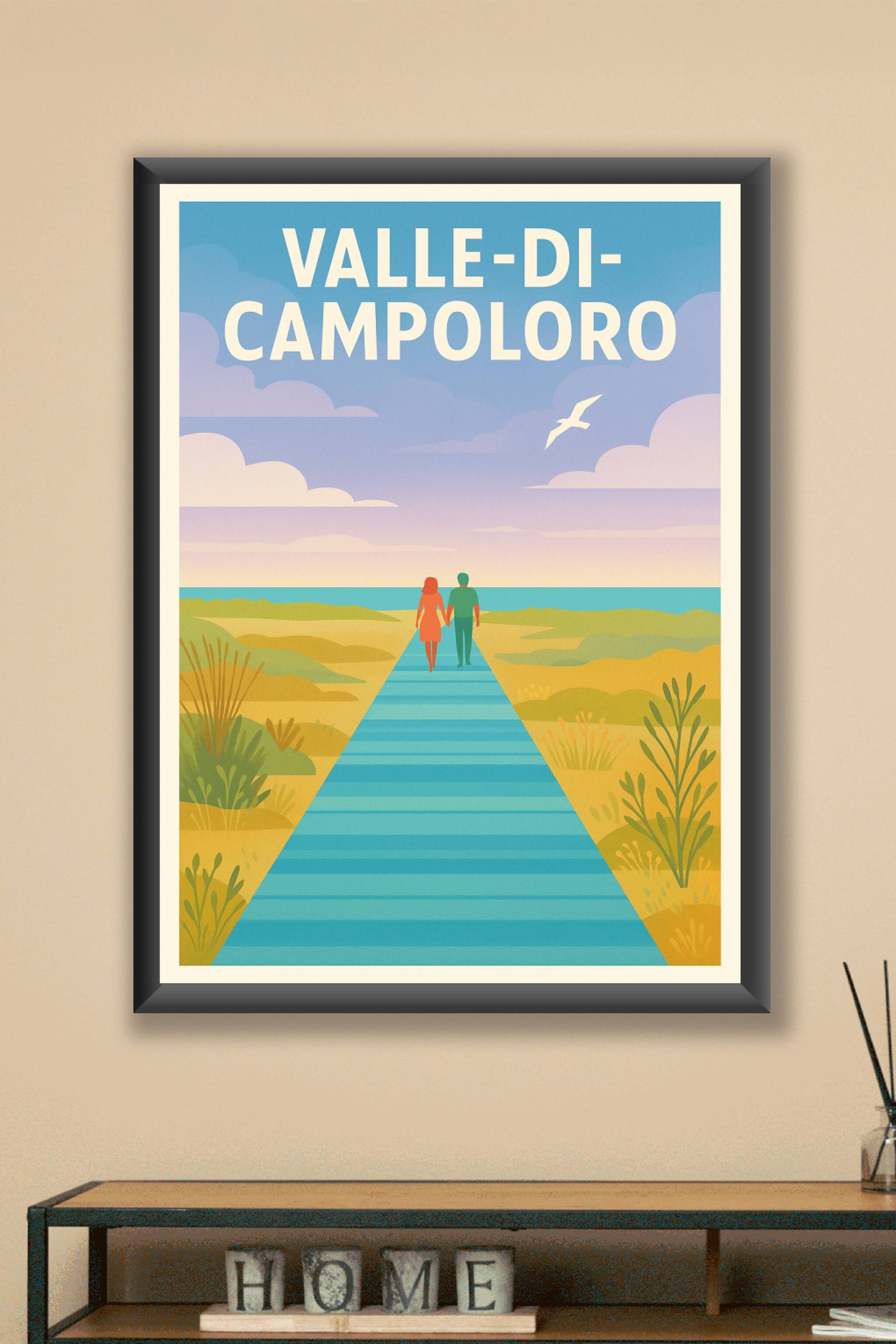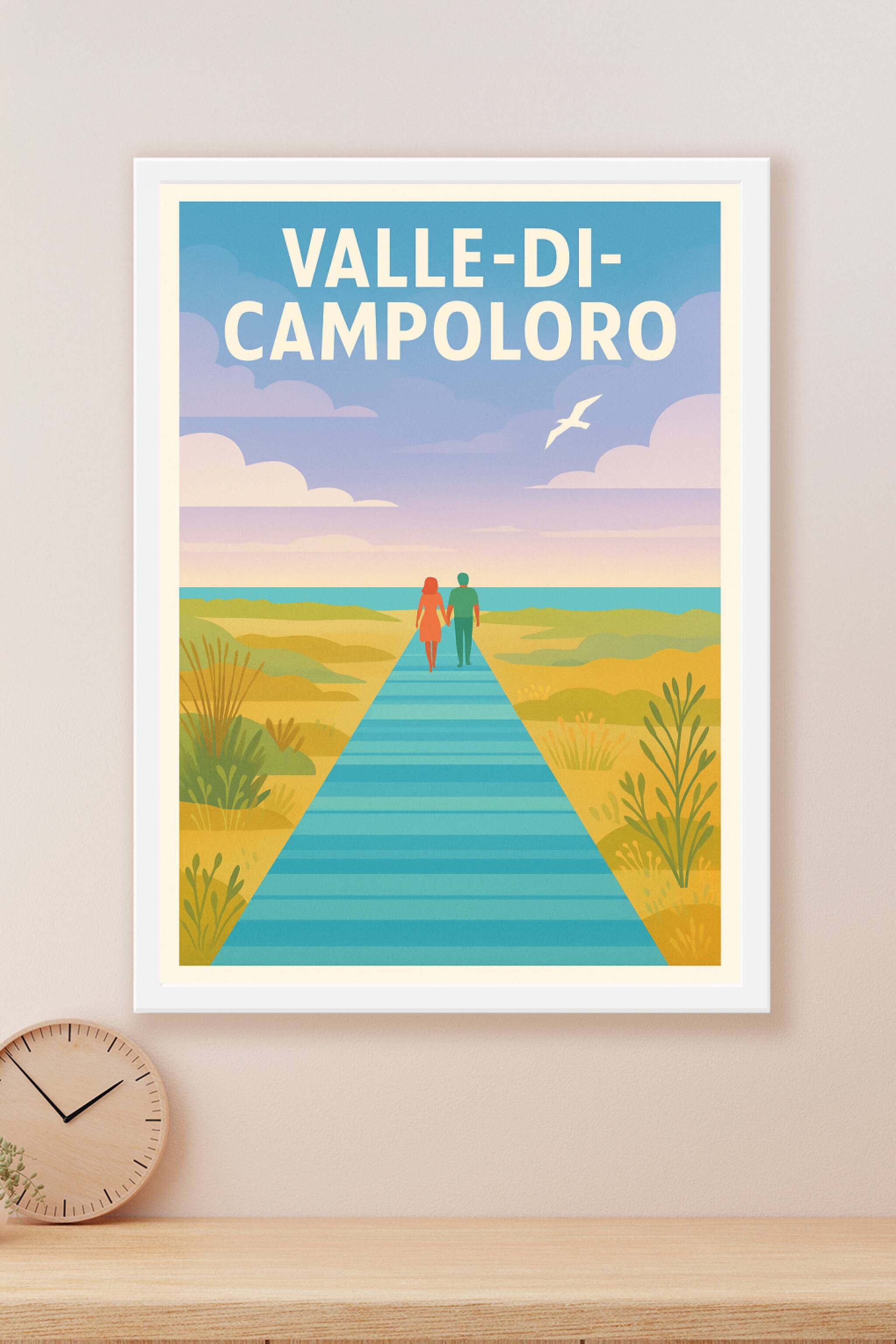 Découvrez l'atmosphère apaisante de la Valle di Campoloro avec cette affiche délicatement illustrée, où un couple marche main dans la main le long d'une passerelle bleue vers l'horizon marin. Ce poster évoque la douceur de vivre et l'évasion en pleine nature, sublimée par des teintes pastel douces et élégantes. Imprimée en tirage "Fine Art" sur papier 305g coton, cette affiche bénéficie d'une qualité d'impression exceptionnelle, qui garantit des couleurs vives et durables. Disponible en formats A1 à A4, avec ou sans cadre, elle s'intégrera parfaitement à votre décoration intérieure. Apportez une touche artistique et poétique à votre intérieur ou offrez un cadeau raffiné aux amoureux des paysages marins.