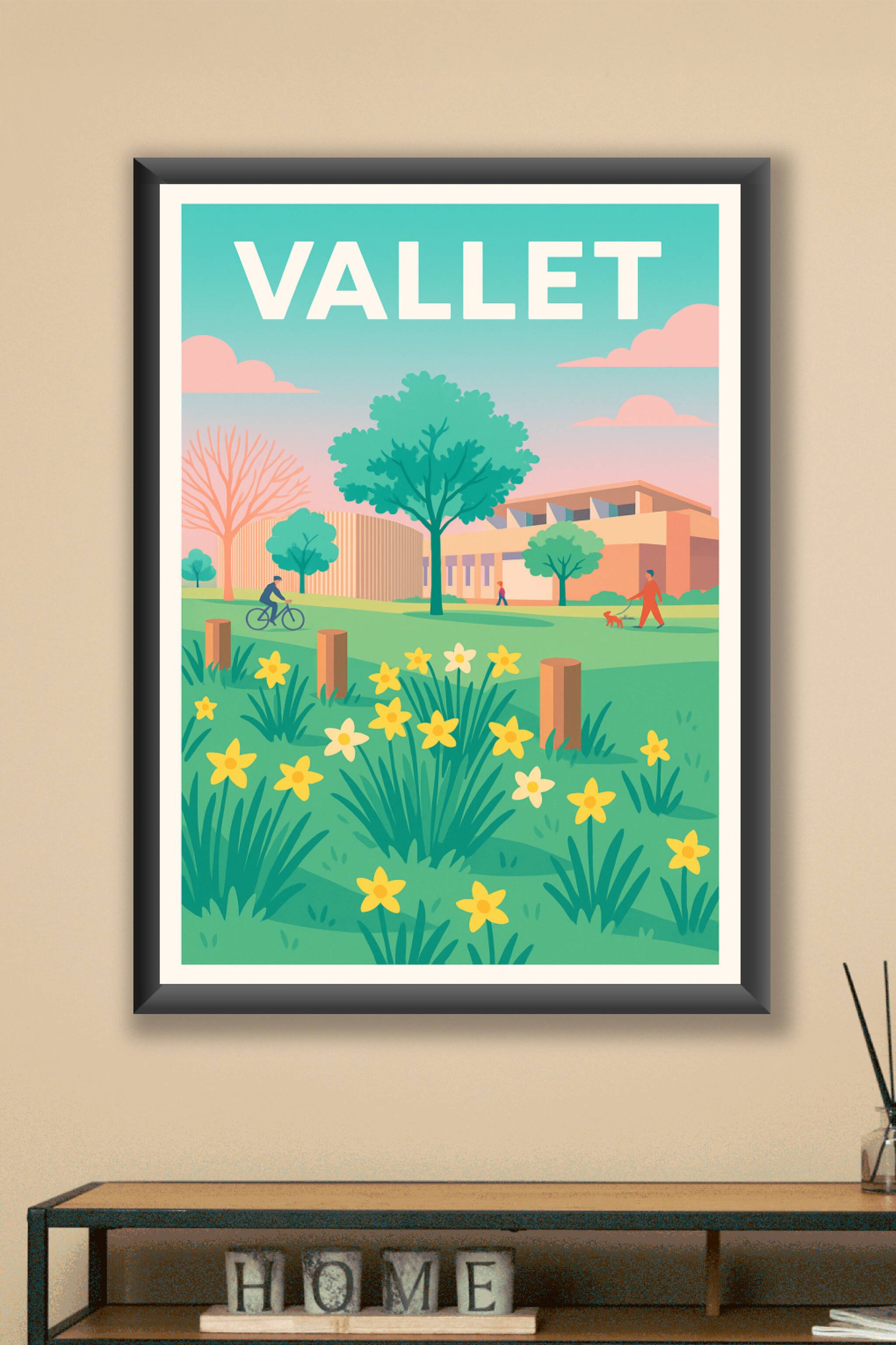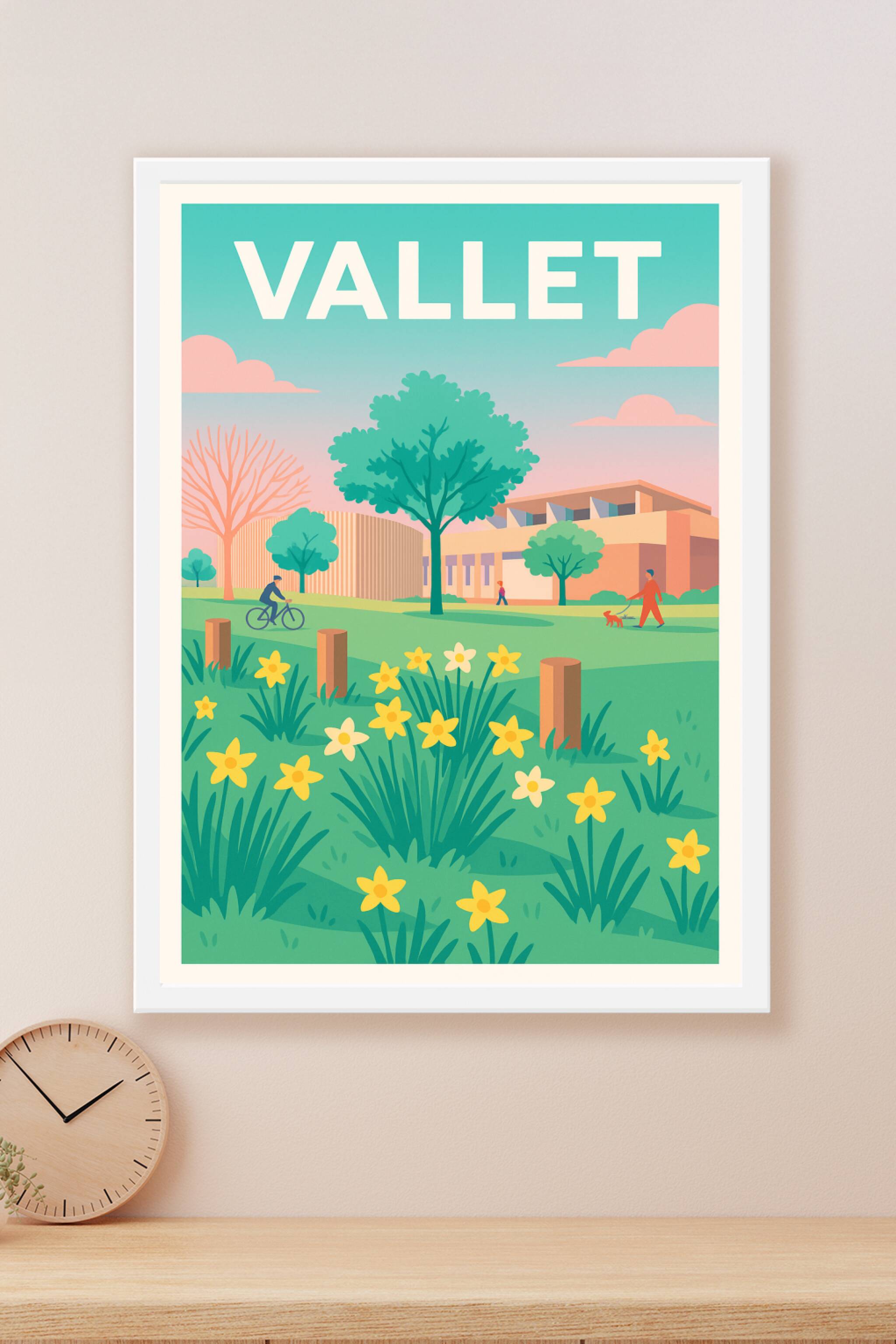 Découvrez cette superbe affiche illustrée qui met en valeur la ville de Vallet avec ses espaces verts fleuris et une architecture contemporaine. Ce...