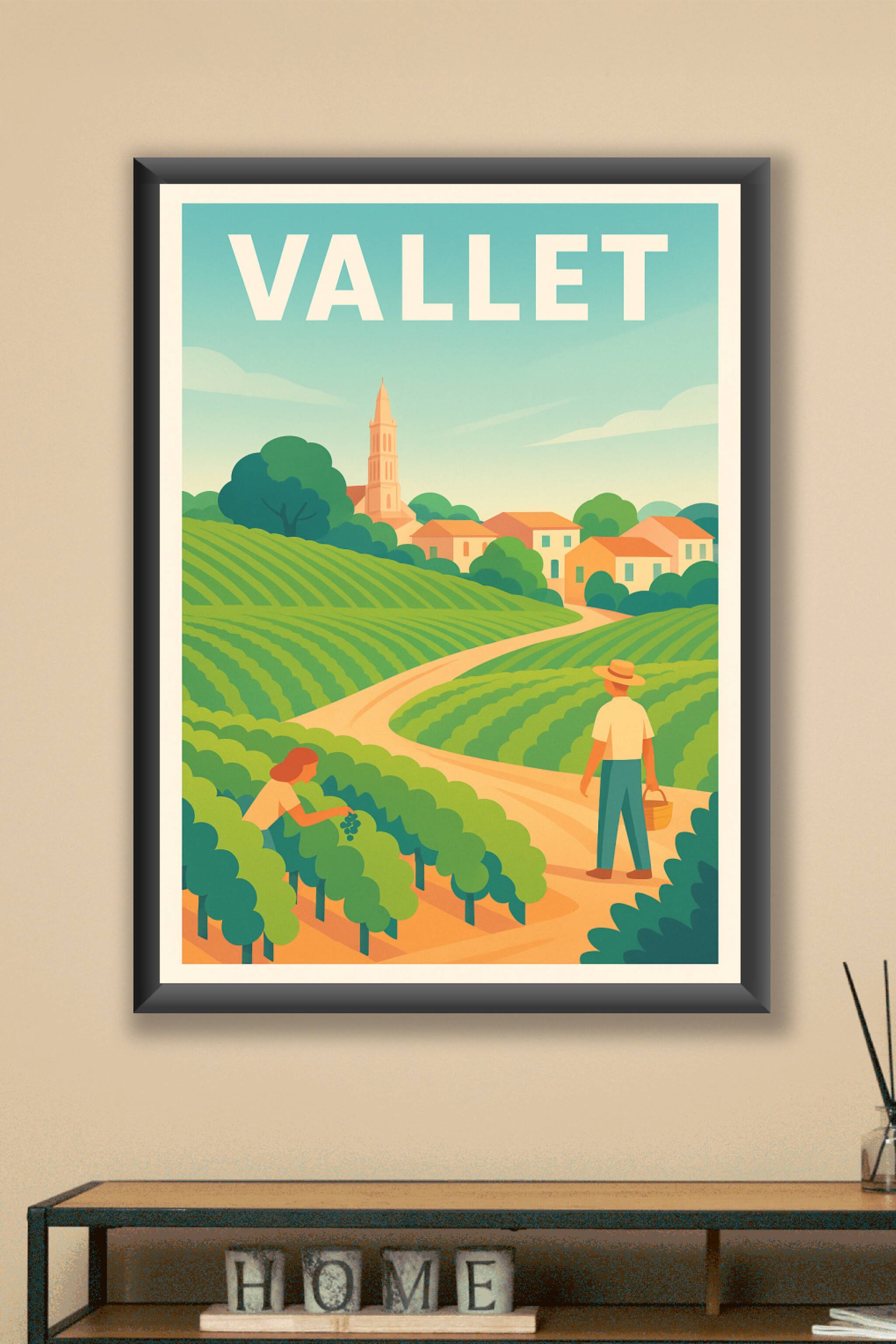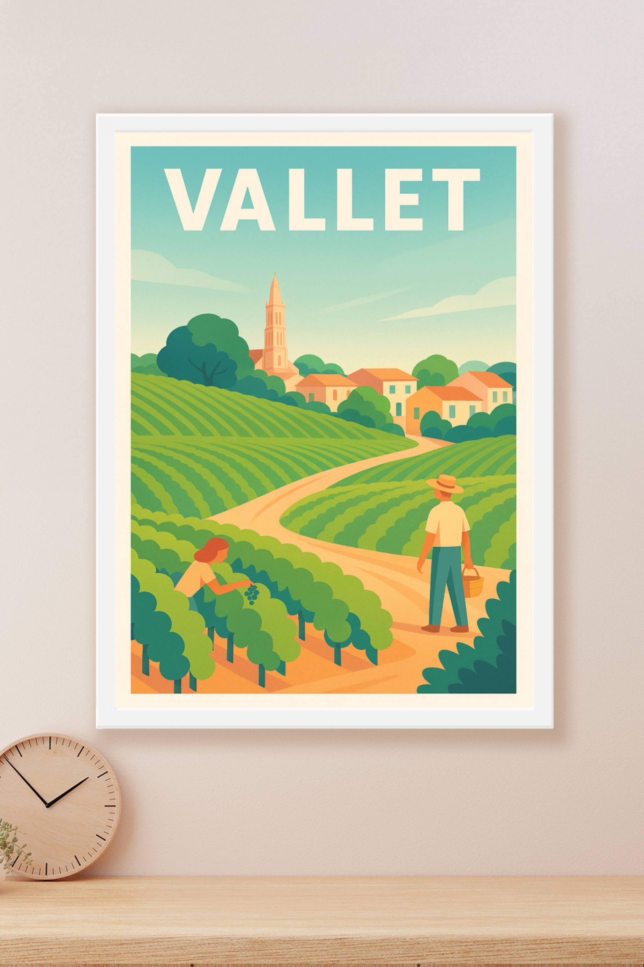 Découvrez la douceur de vivre de la région de Vallet avec cette affiche illustrée qui capture l'essence des vignobles verdoyants et du charme des v...
