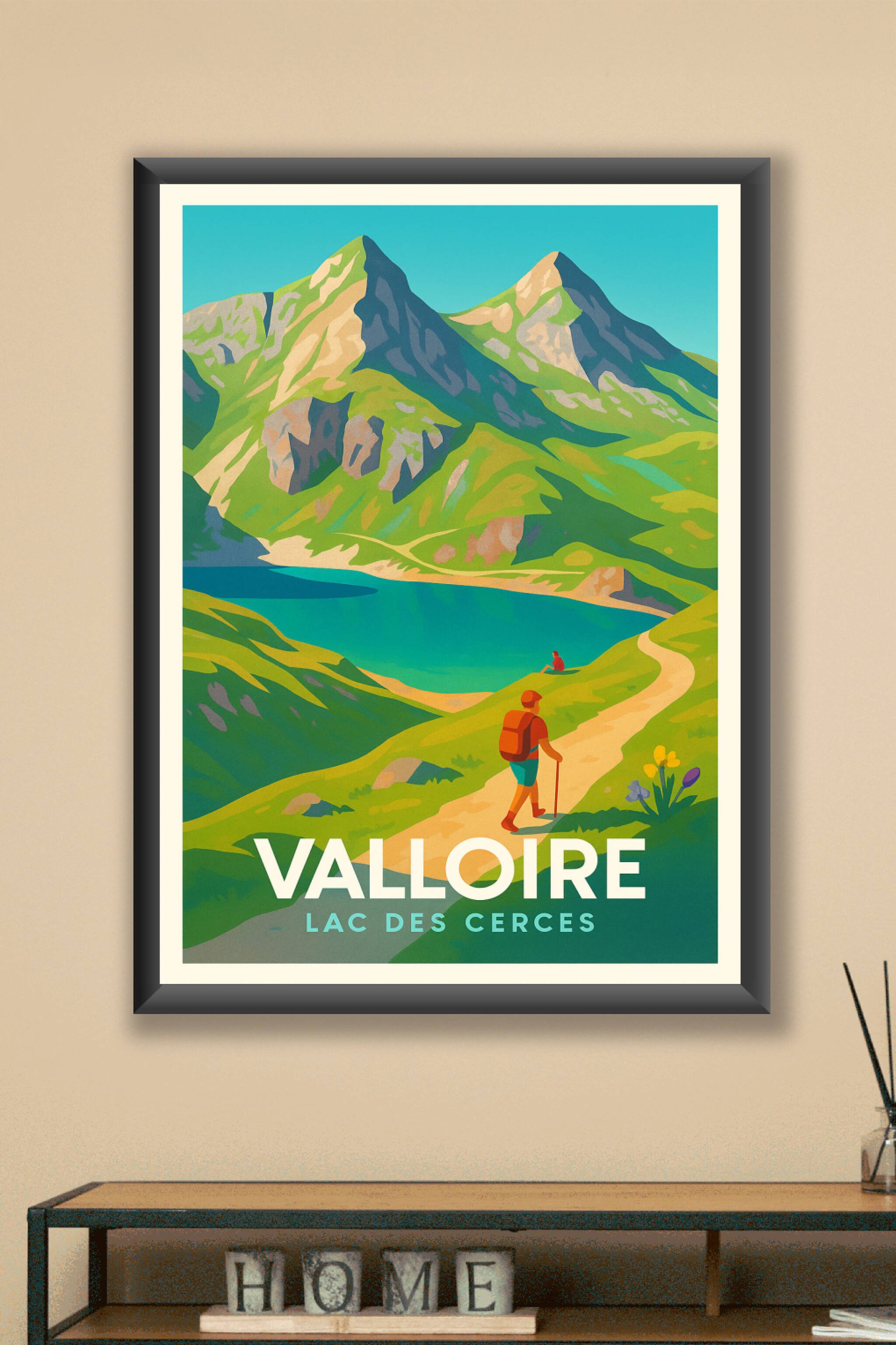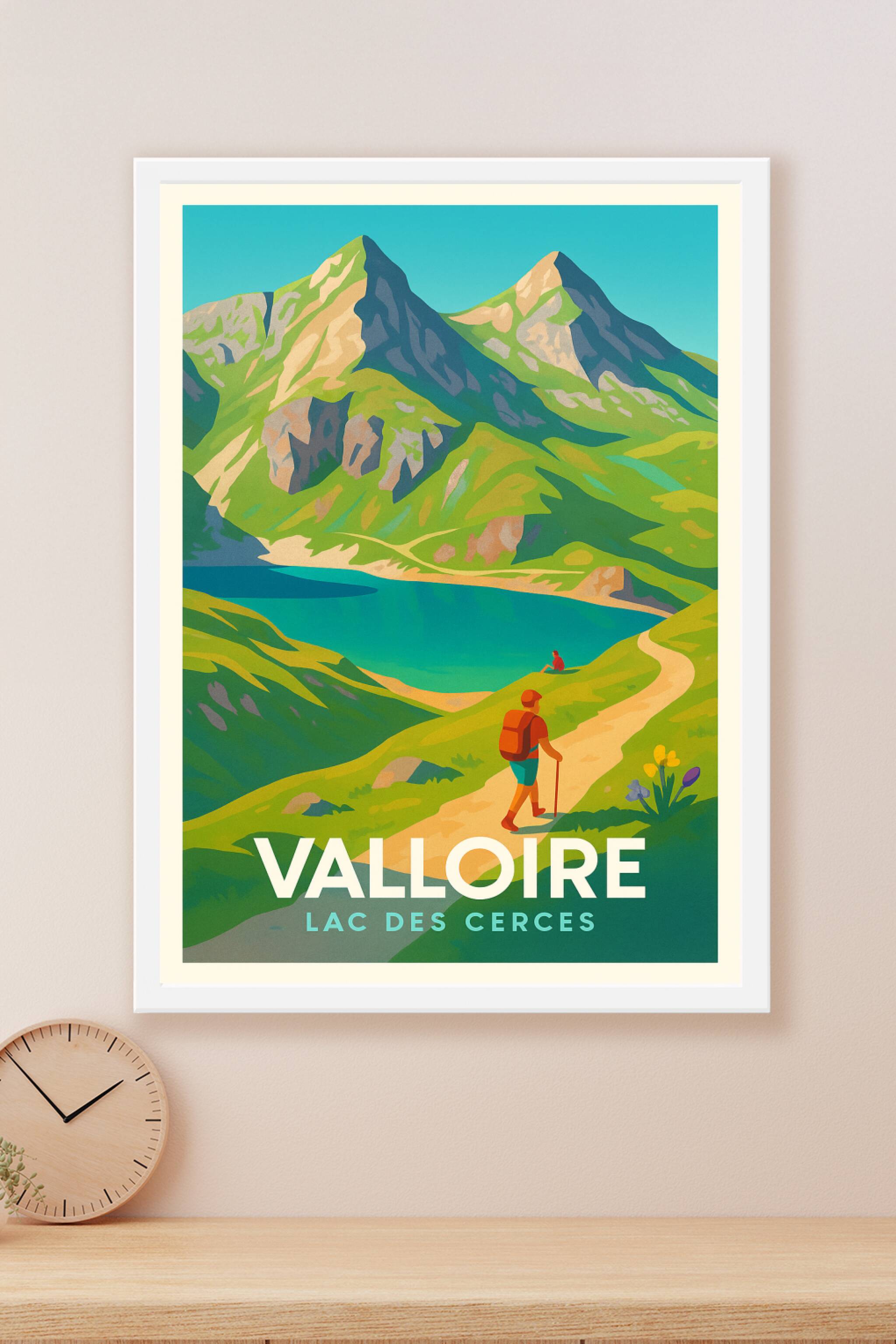 Découvrez la beauté naturelle et la tranquillité du Lac des Cerces à Valloire avec cette superbe affiche au style vintage et coloré. Ce poster illu...