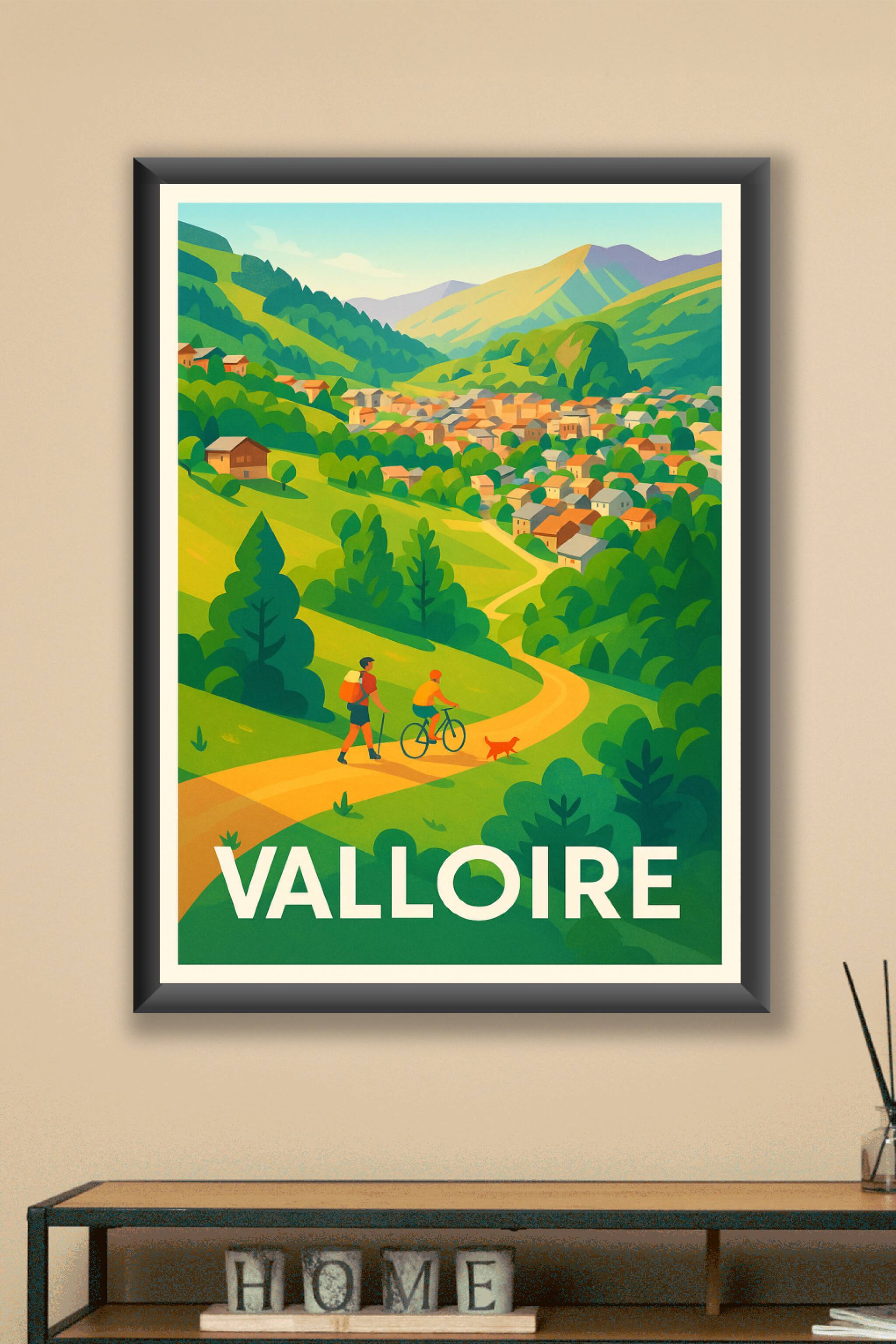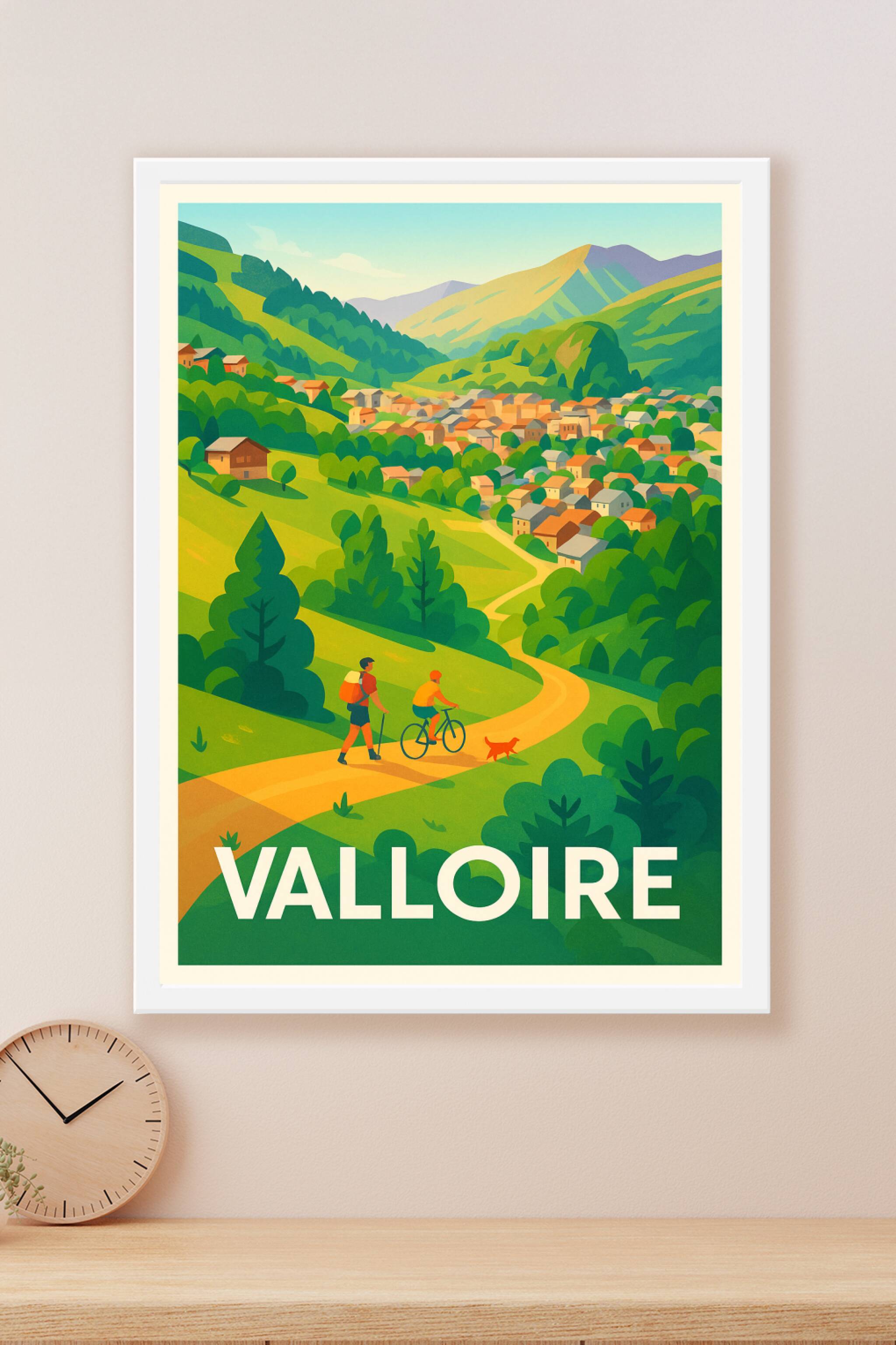 Redécouvrez la beauté authentique de Valloire avec cette affiche illustrée vibrant de couleurs et de vie. Le poster capture l'essence d'une promena...