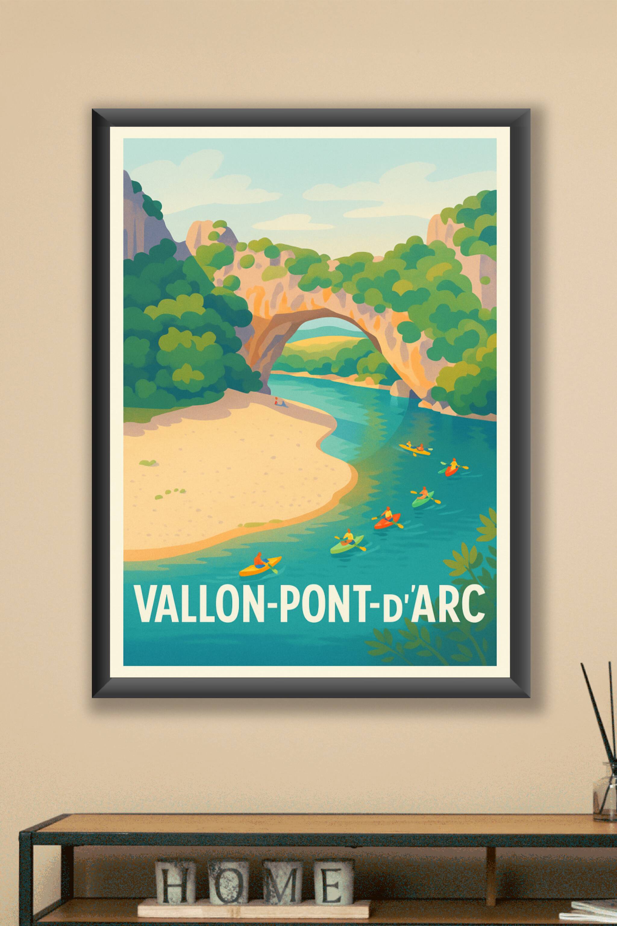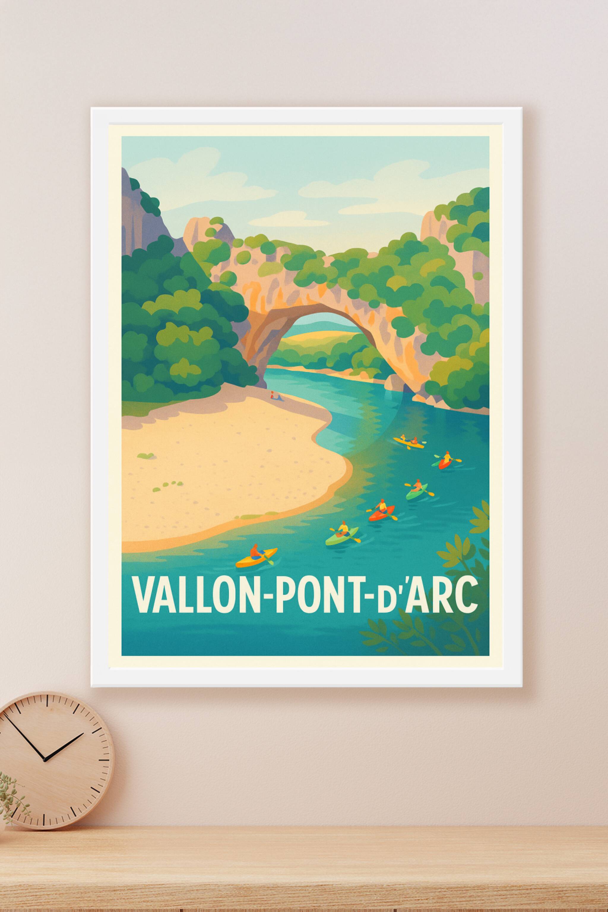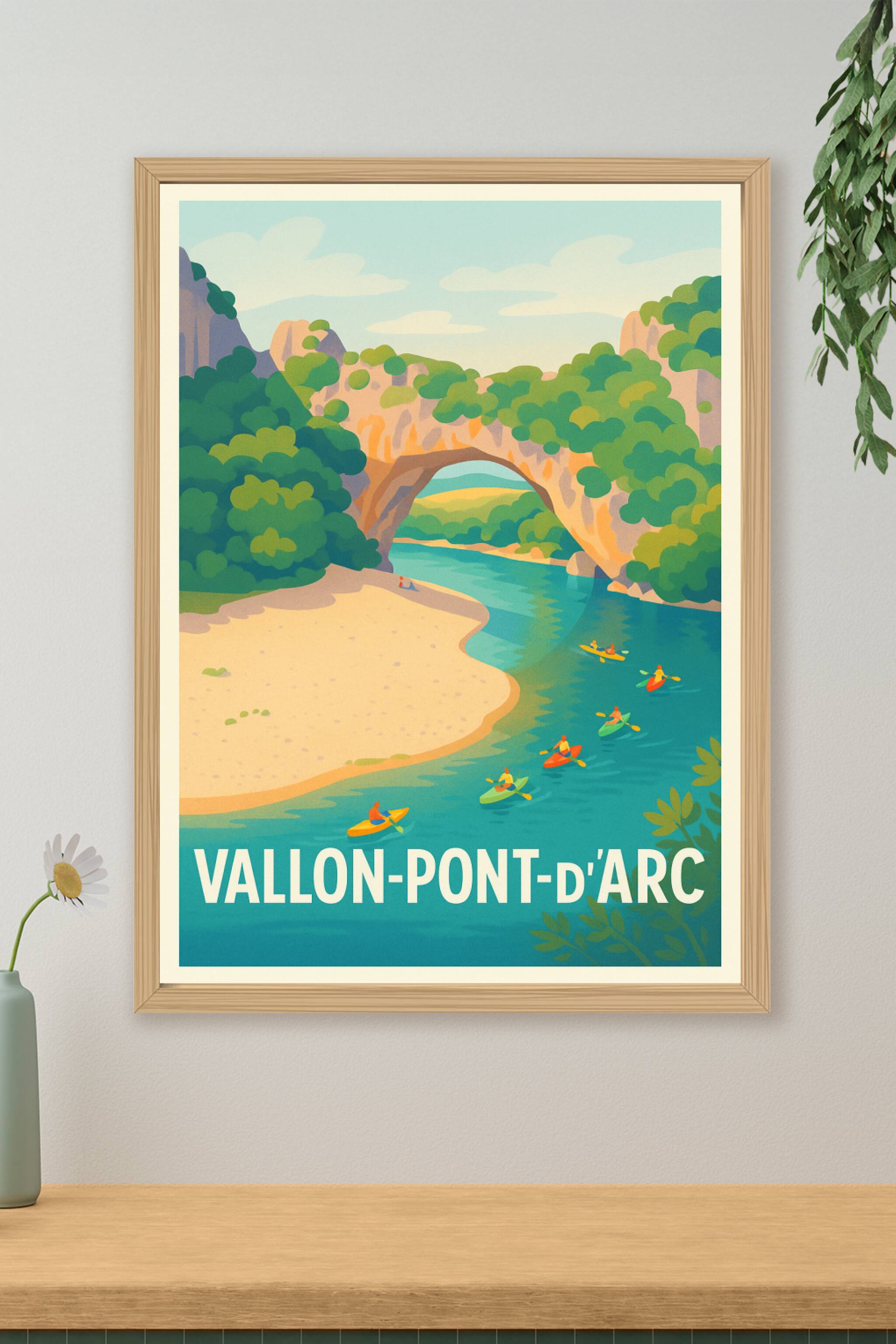 Découvrez la beauté sauvage et le charme unique de Vallon-Pont-d'Arc avec cette affiche illustrée mettant en scène le célèbre pont naturel et les k...
