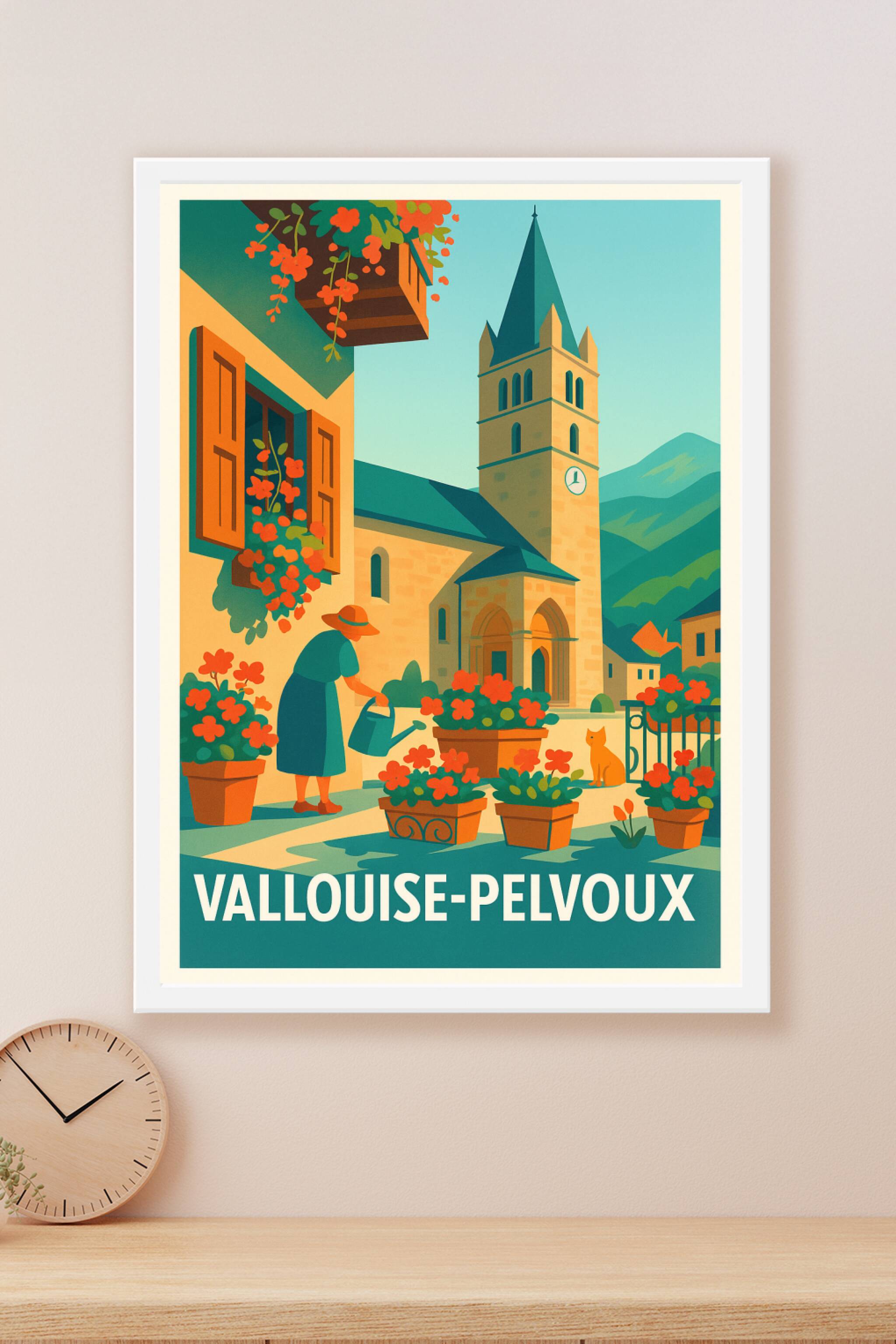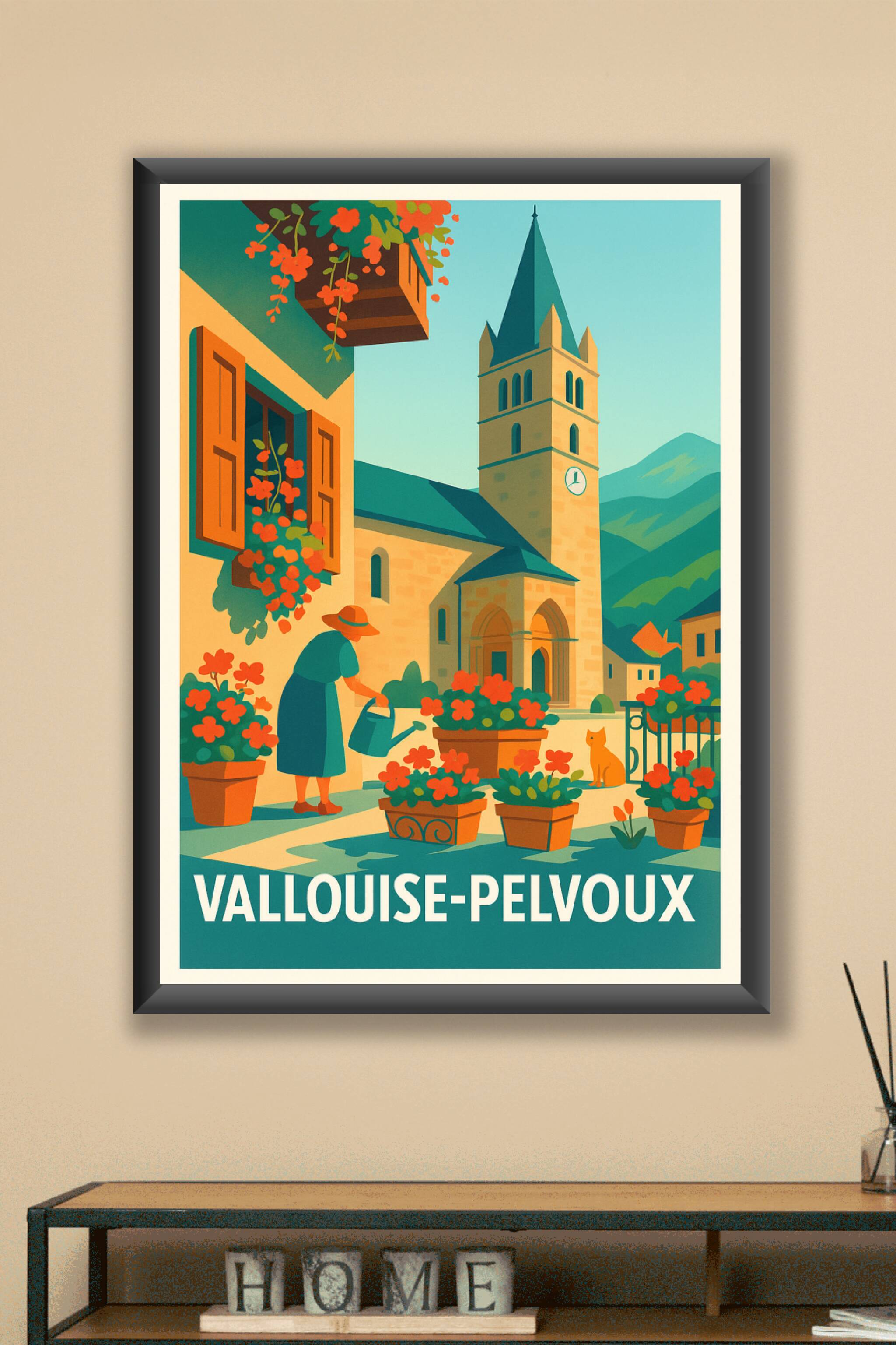 Découvrez l'ambiance paisible et authentique de Vallouise-Pelvoux à travers cette affiche illustrée aux couleurs chaleureuses et apaisantes. Le pos...