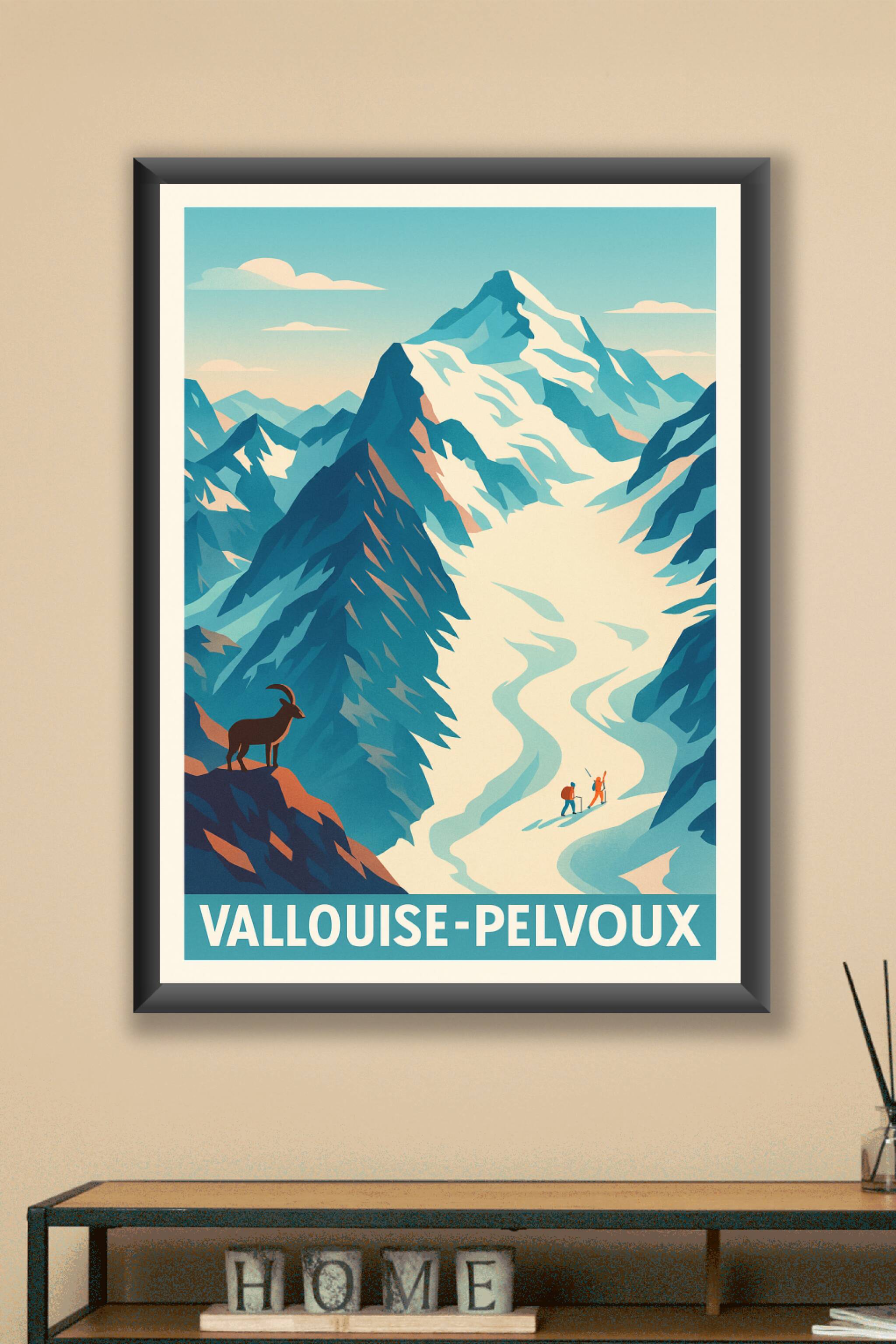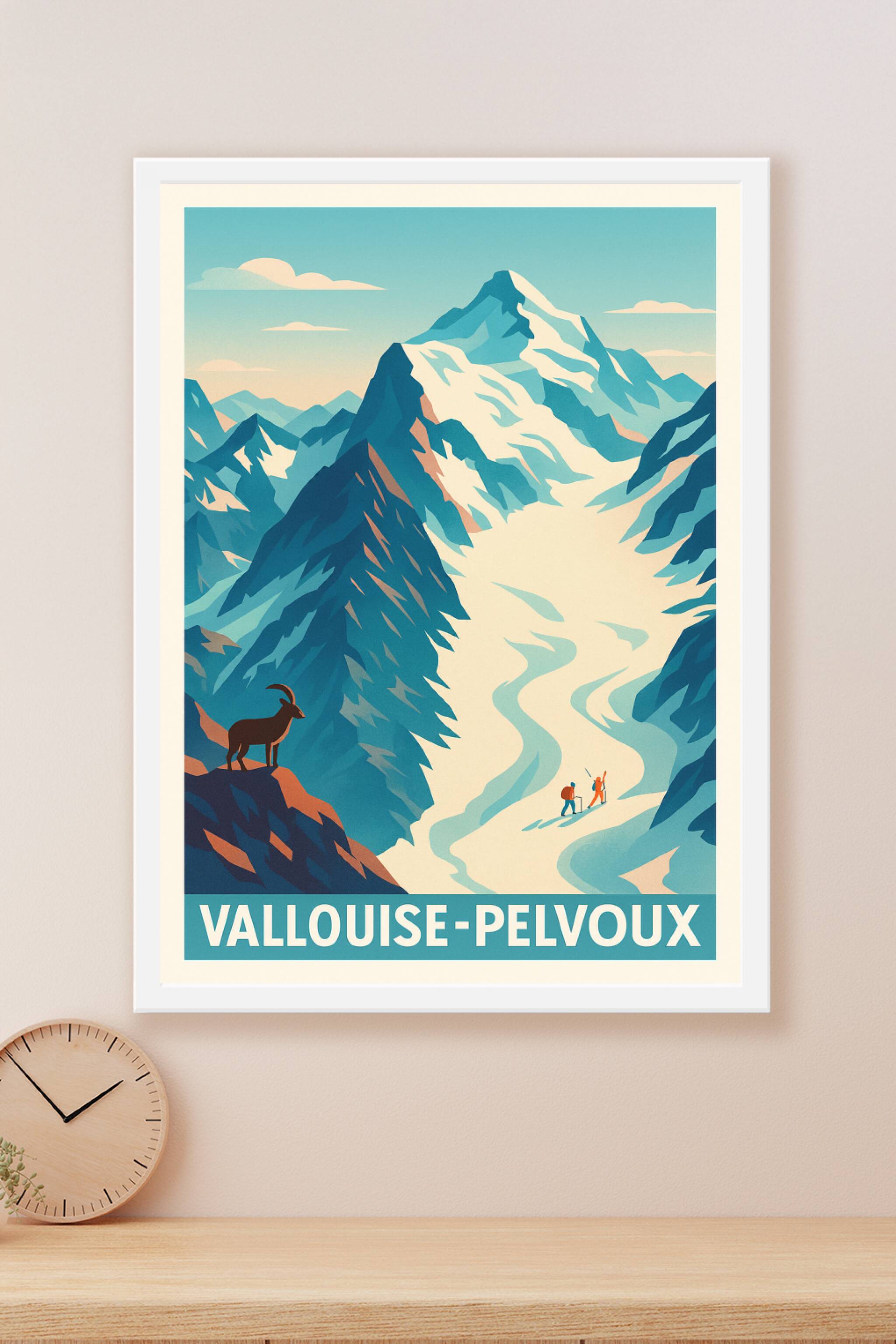 Découvrez l'impressionnante beauté des sommets alpins avec cette affiche illustrée mettant en scène la majestueuse vallée de Vallouise-Pelvoux. Un ...