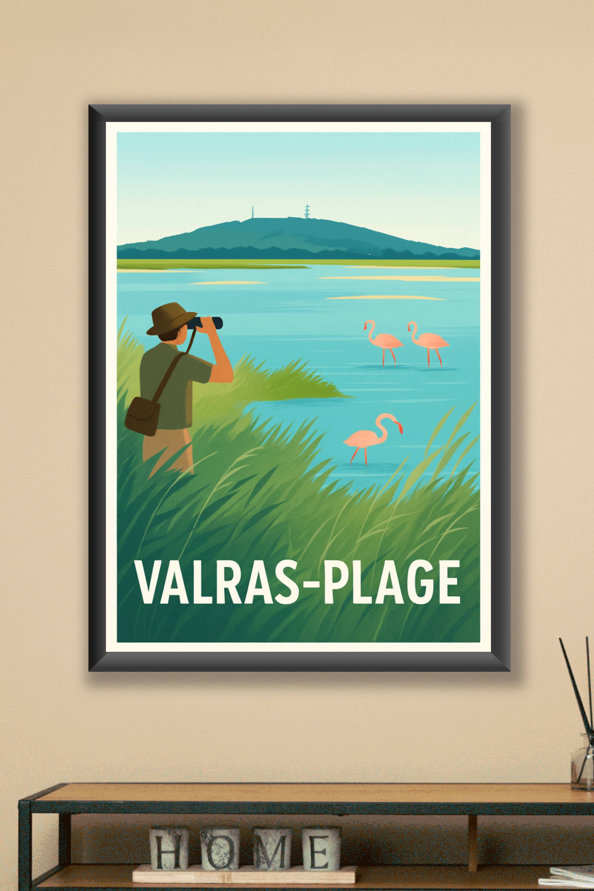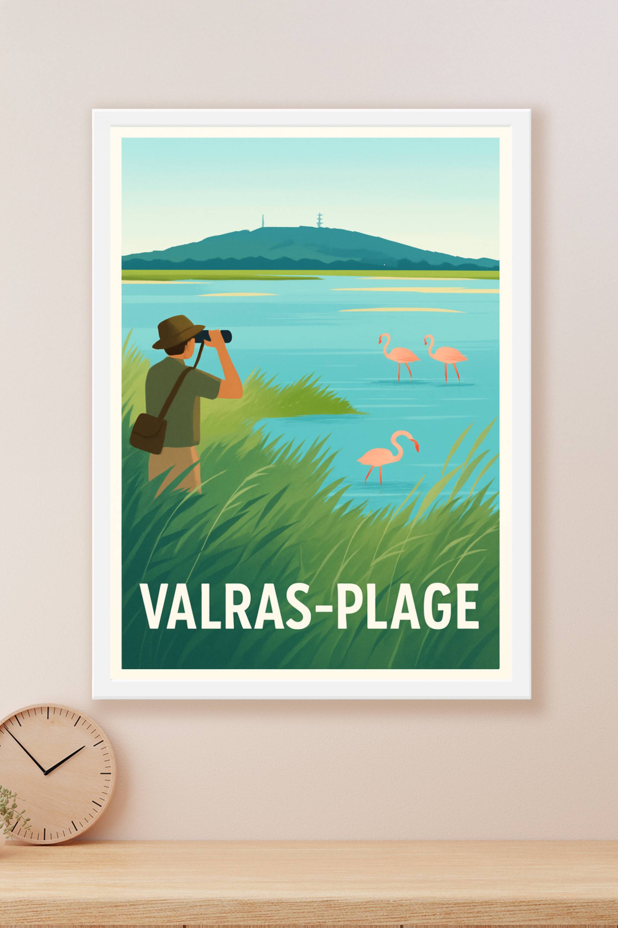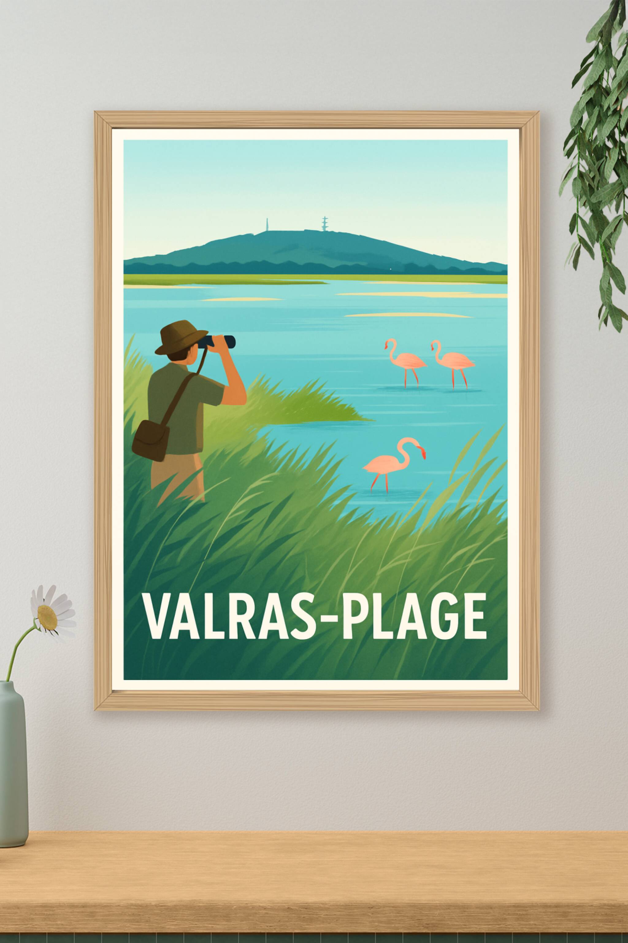 Découvrez l'atmosphère paisible et sauvage de Valras-Plage avec cette affiche illustrée mettant en scène un observateur d'oiseaux au bord de l'eau ...