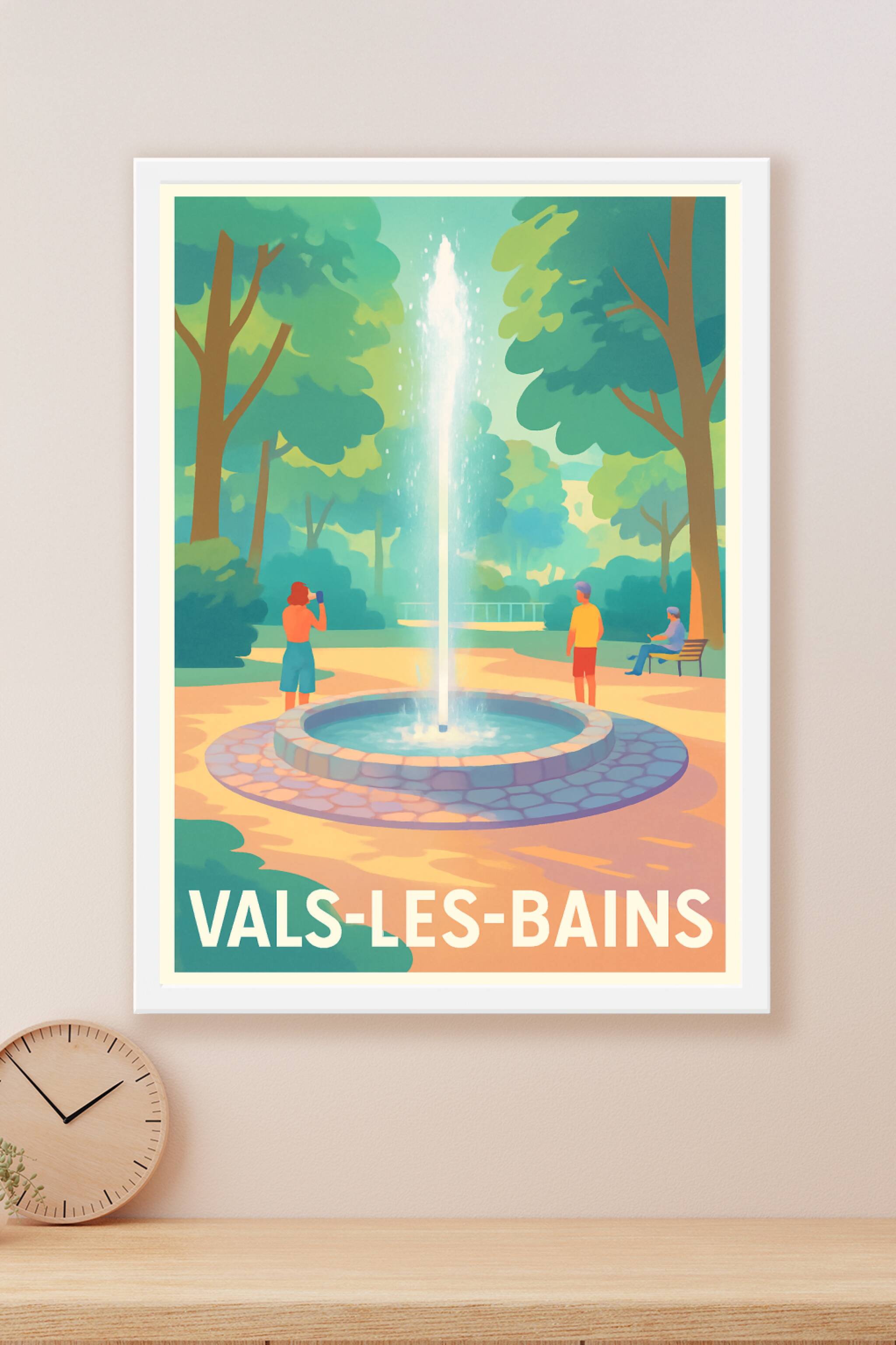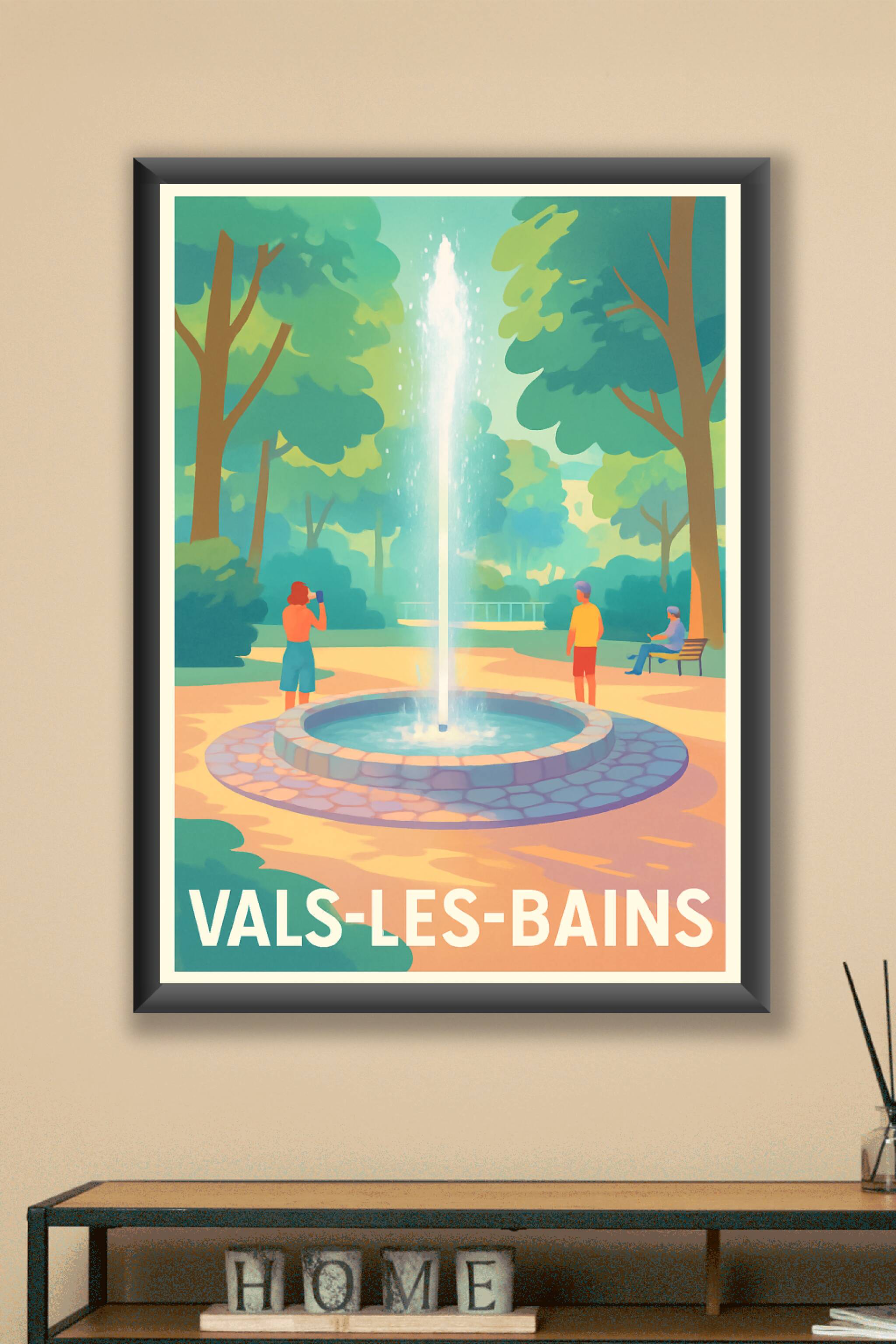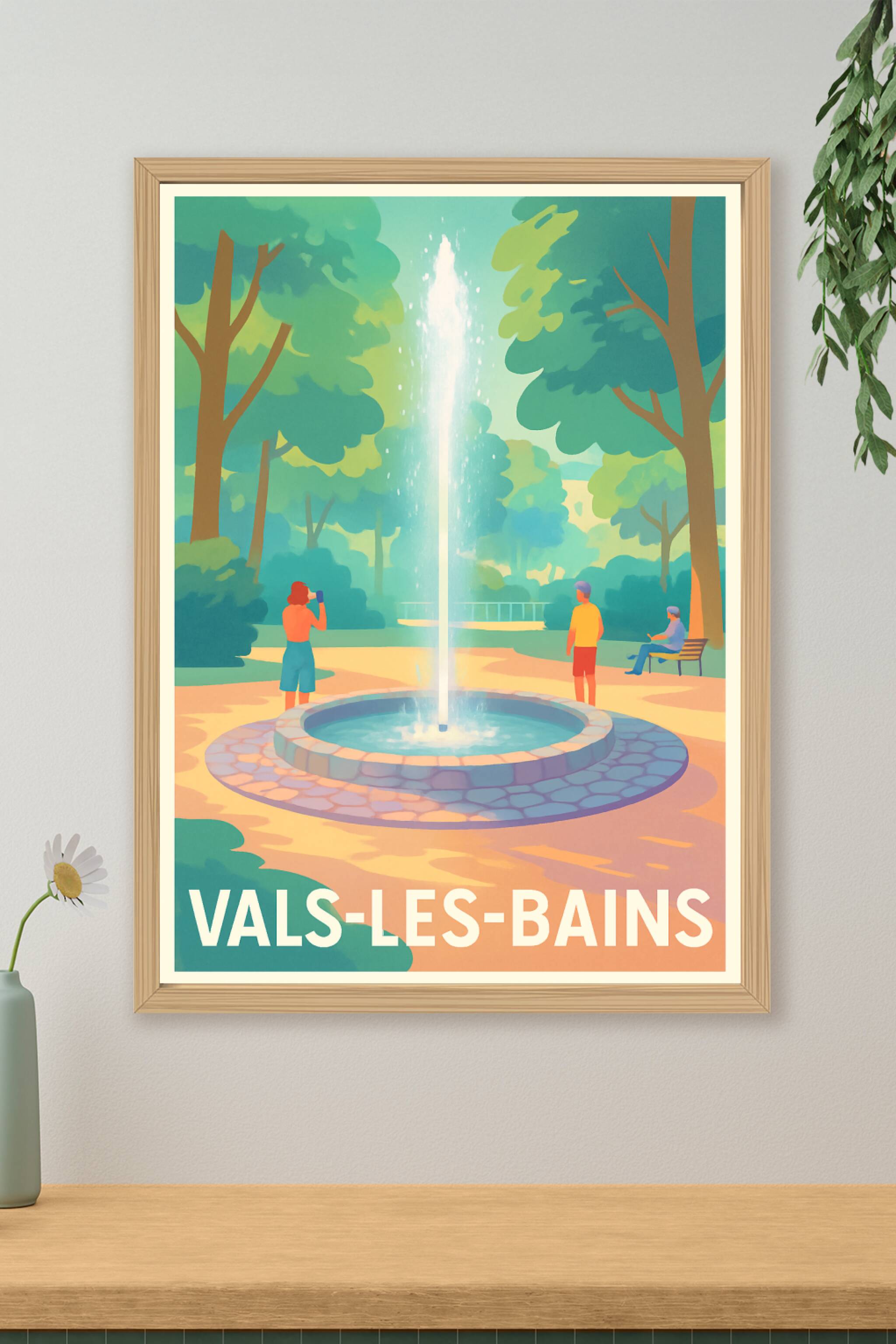 Découvrez la sérénité et la fraîcheur de Vals-les-Bains avec cette affiche illustrée mettant en scène une fontaine apaisante au milieu d'un parc ve...