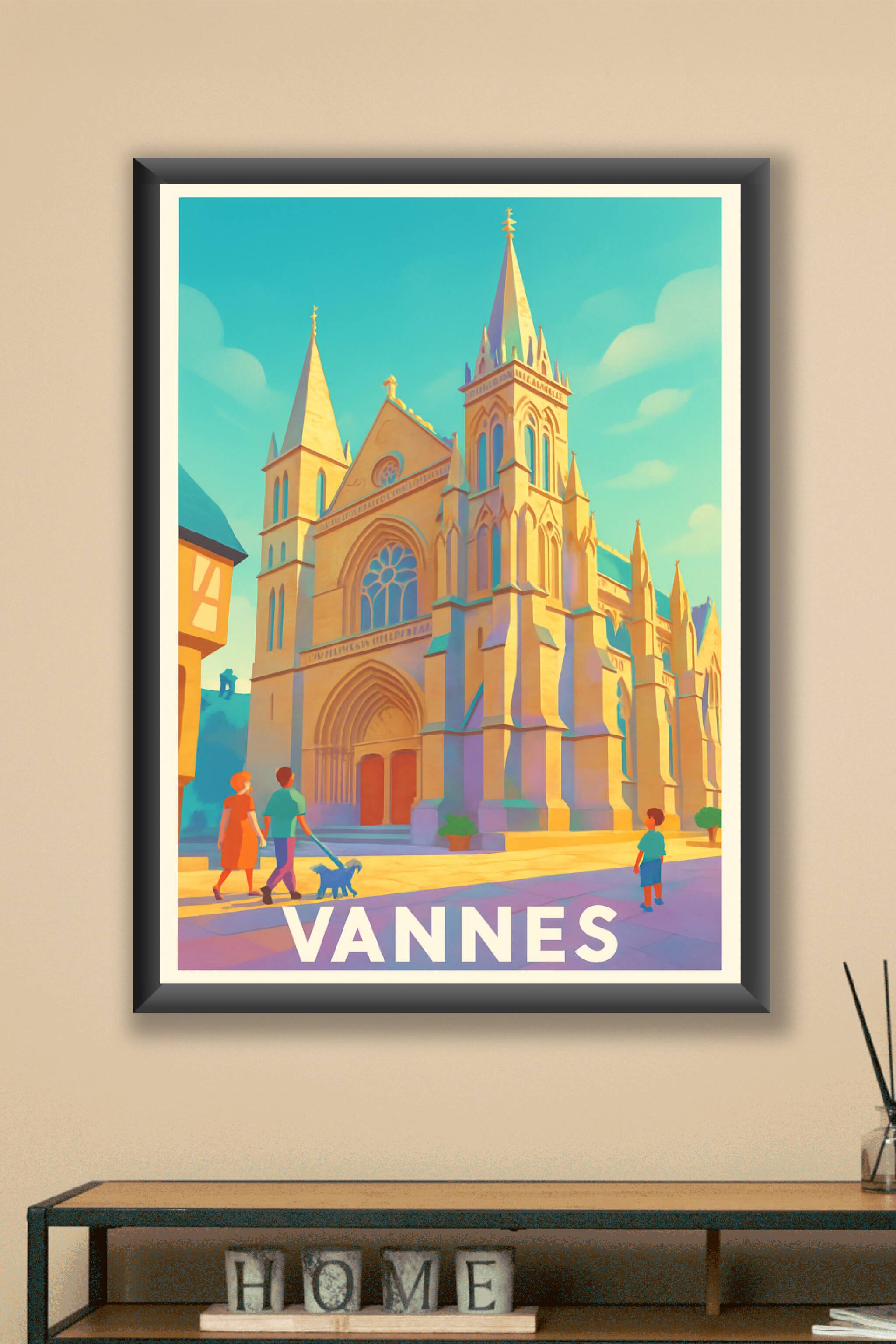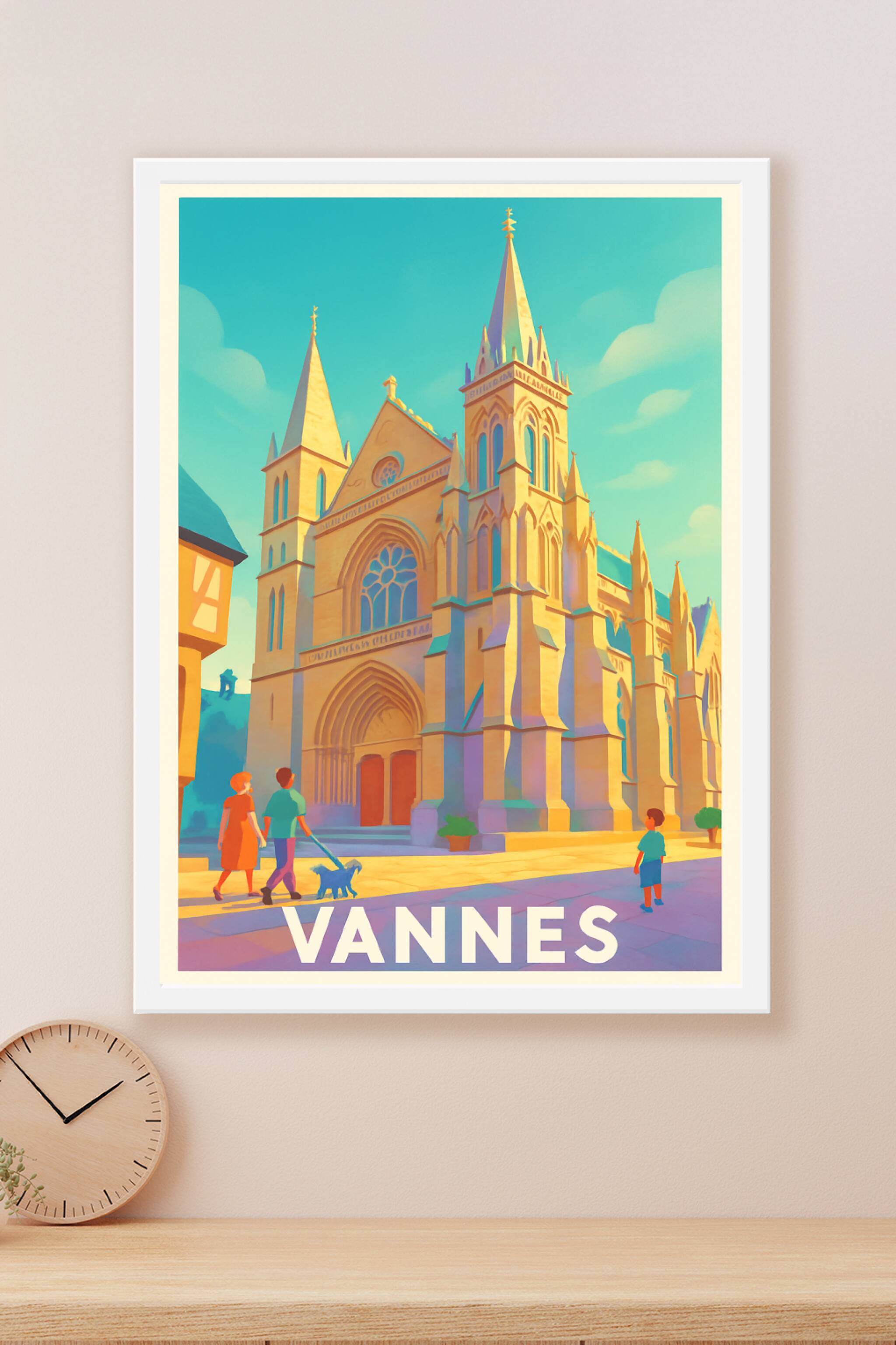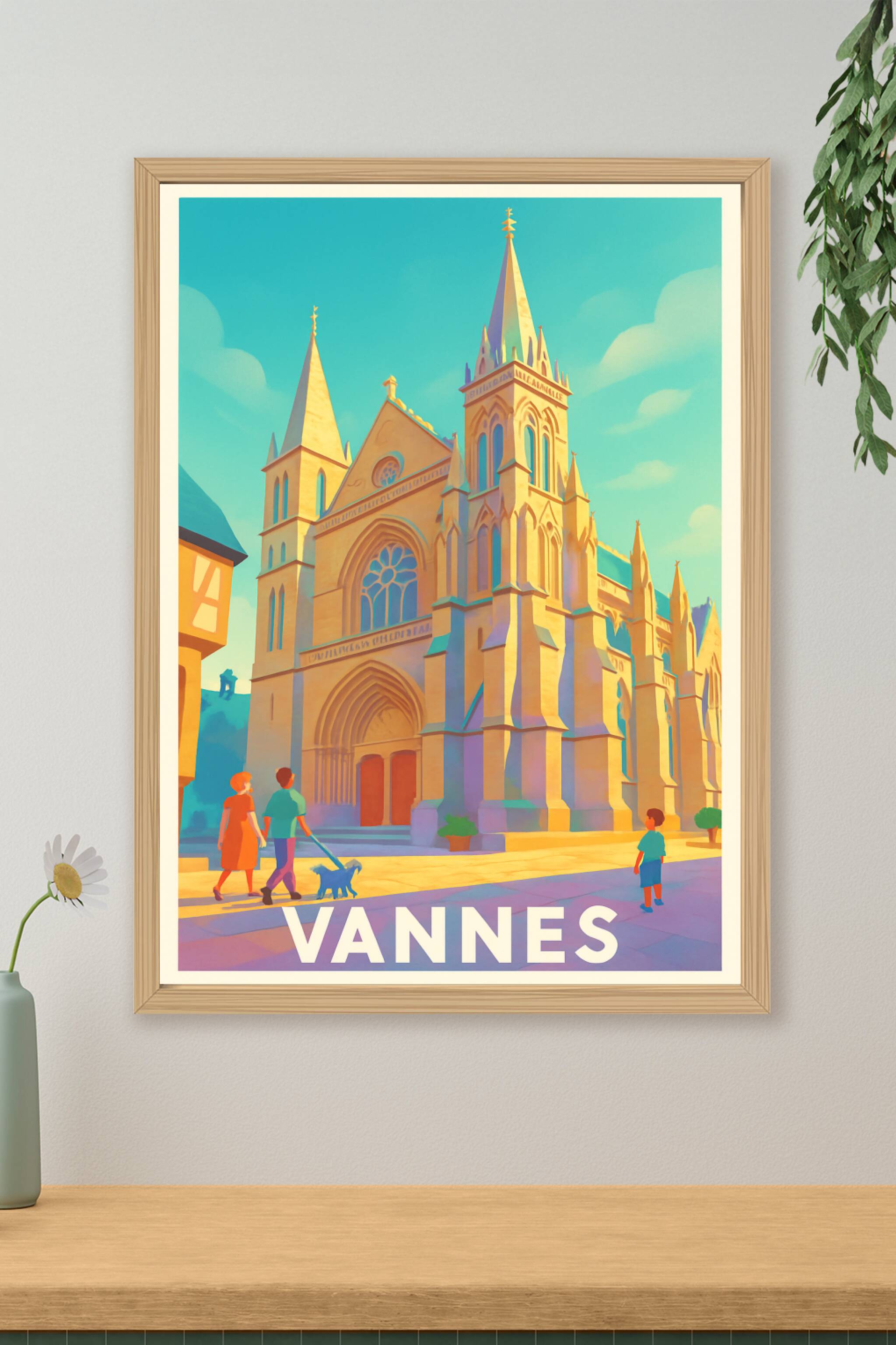 Découvrez la beauté lumineuse et détaillée de cette affiche qui met en scène l'architecture gothique emblématique de Vannes. Cette illustration dou...