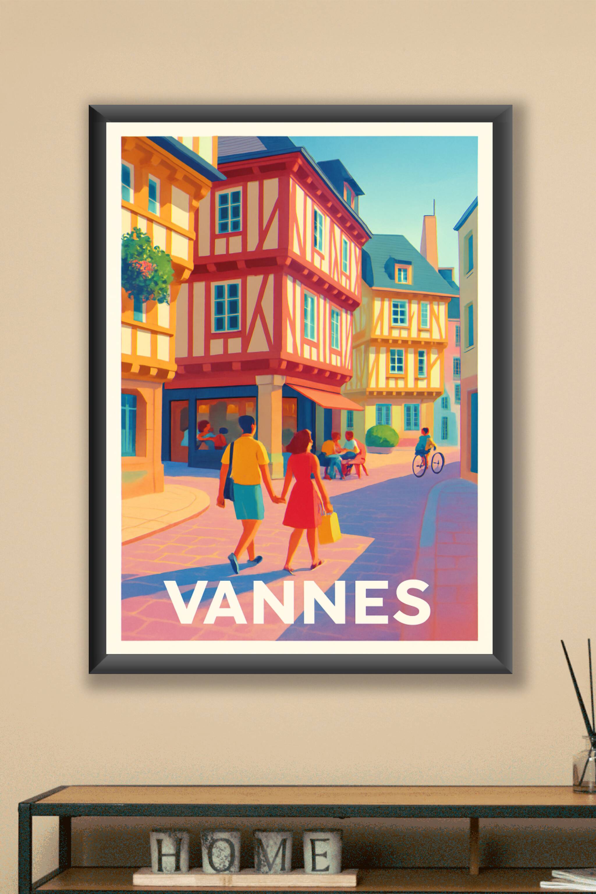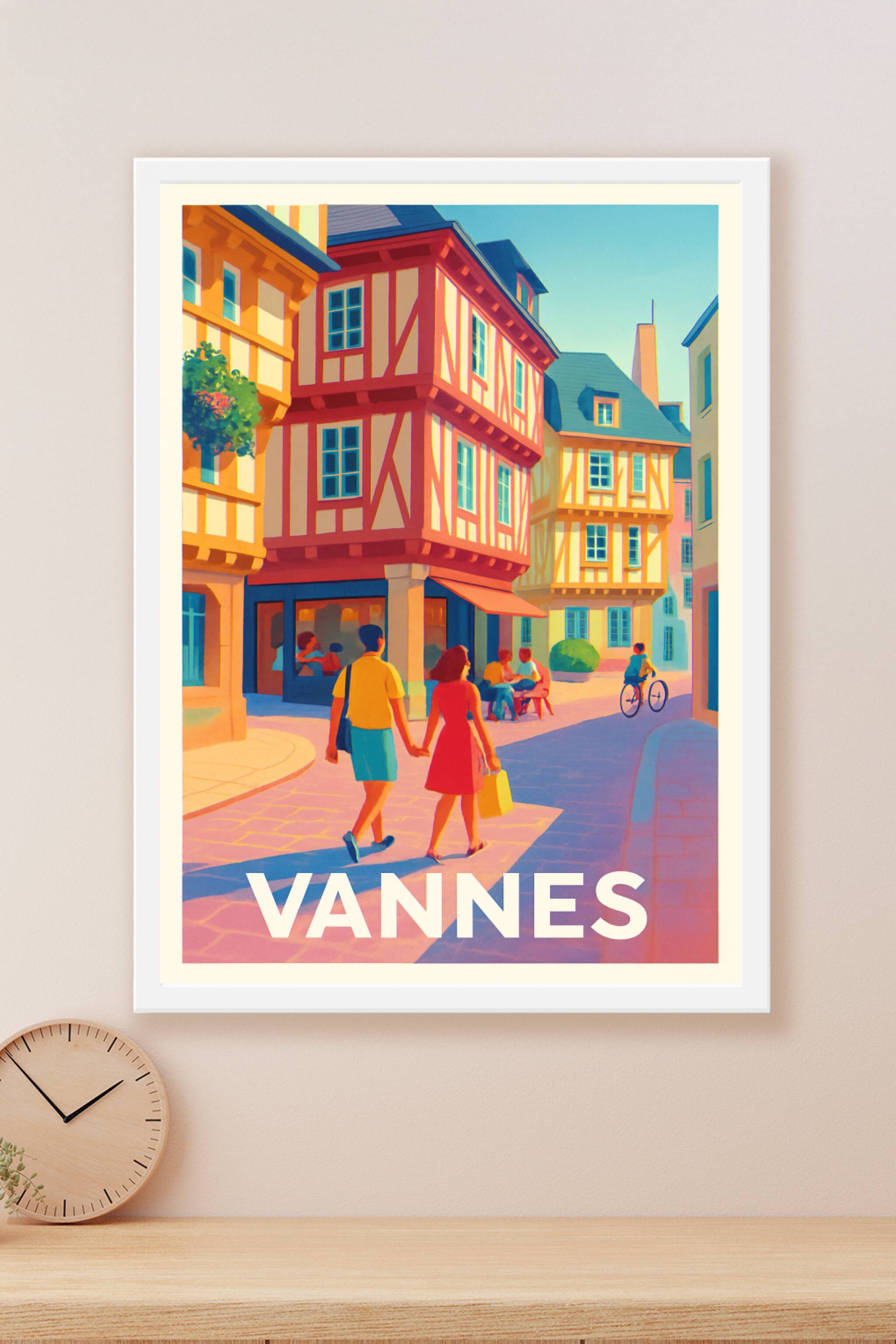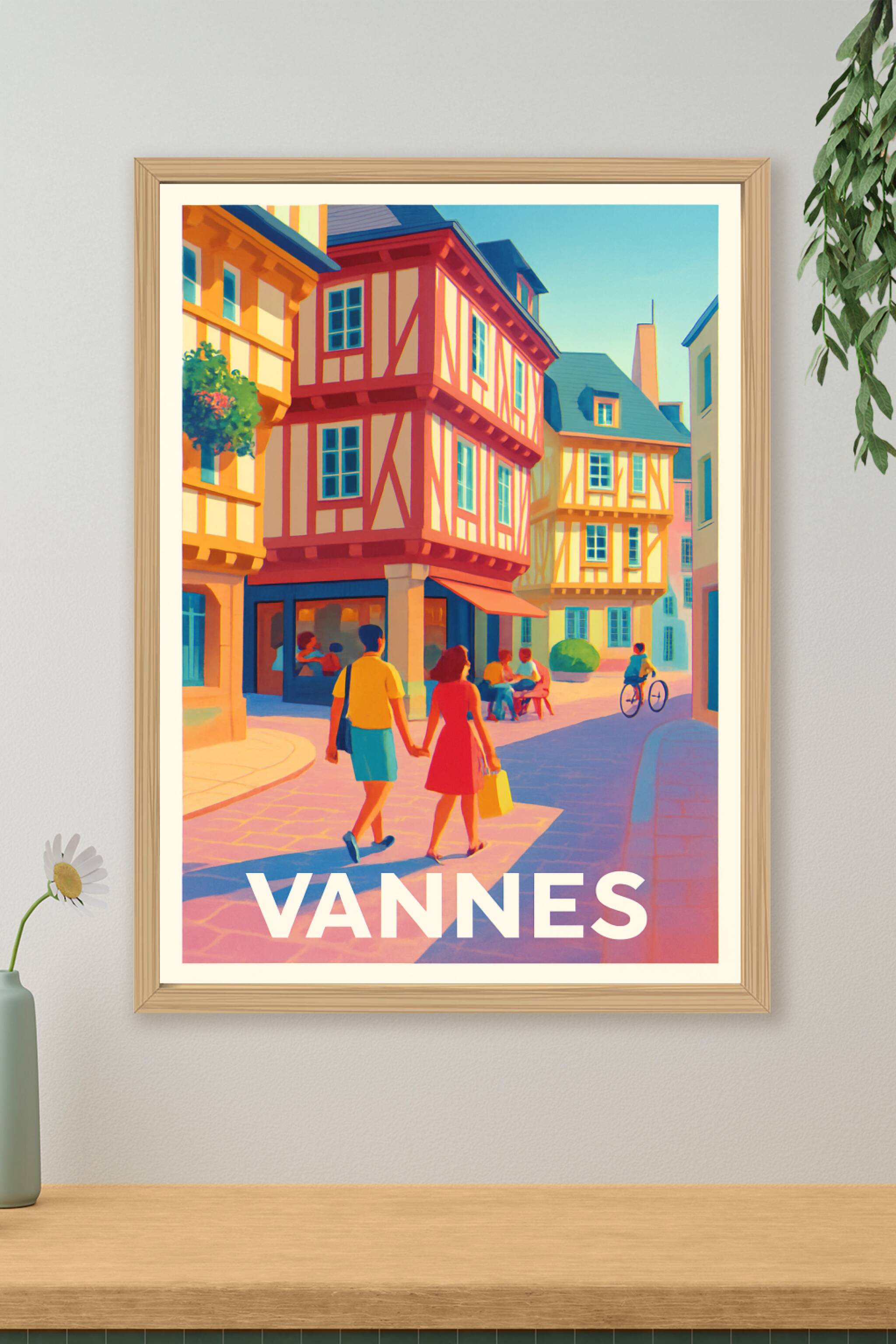 Découvrez le charme authentique de Vannes avec cette affiche illustrée vibrante qui capture l'essence de ses maisons à colombages et l'atmosphère c...