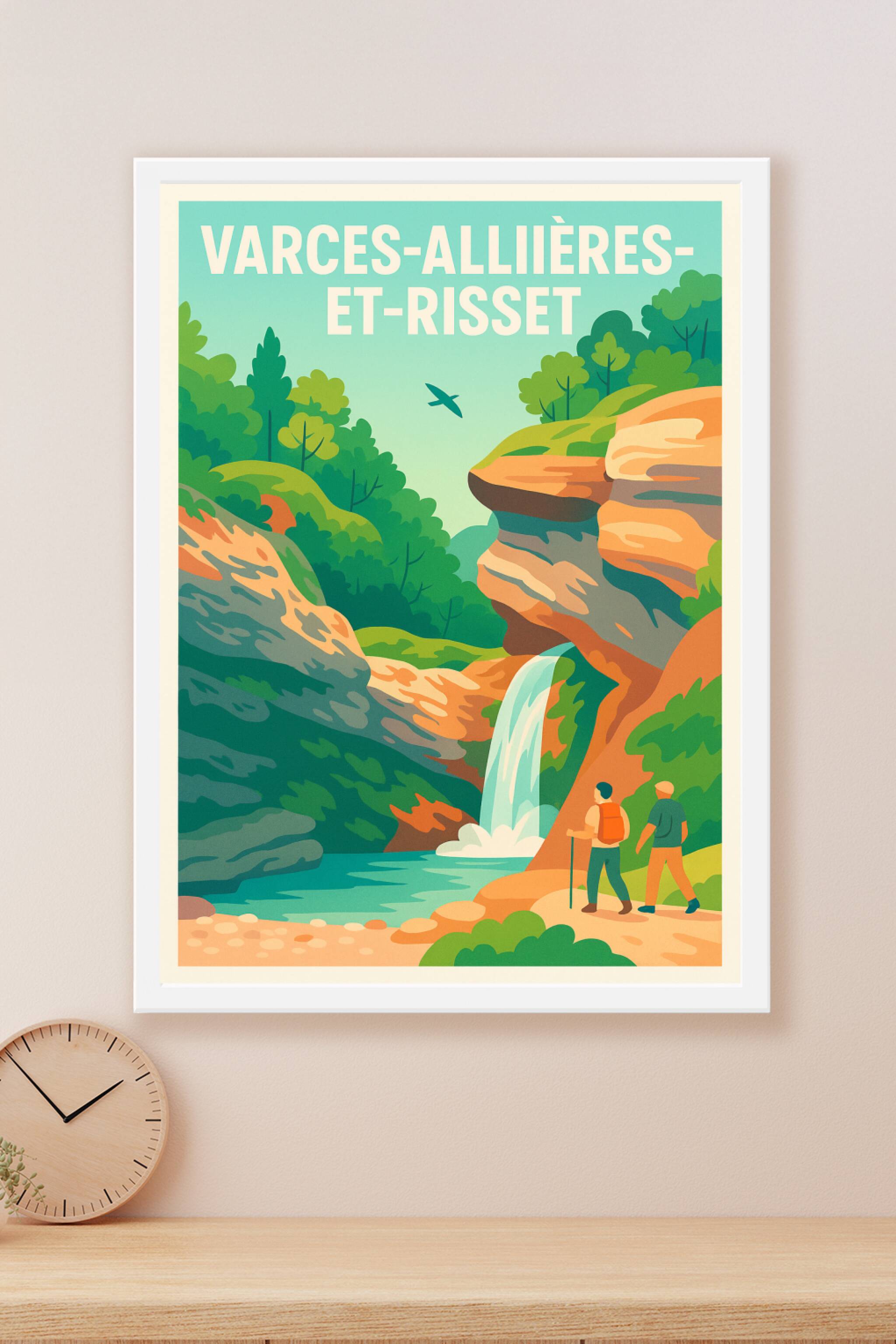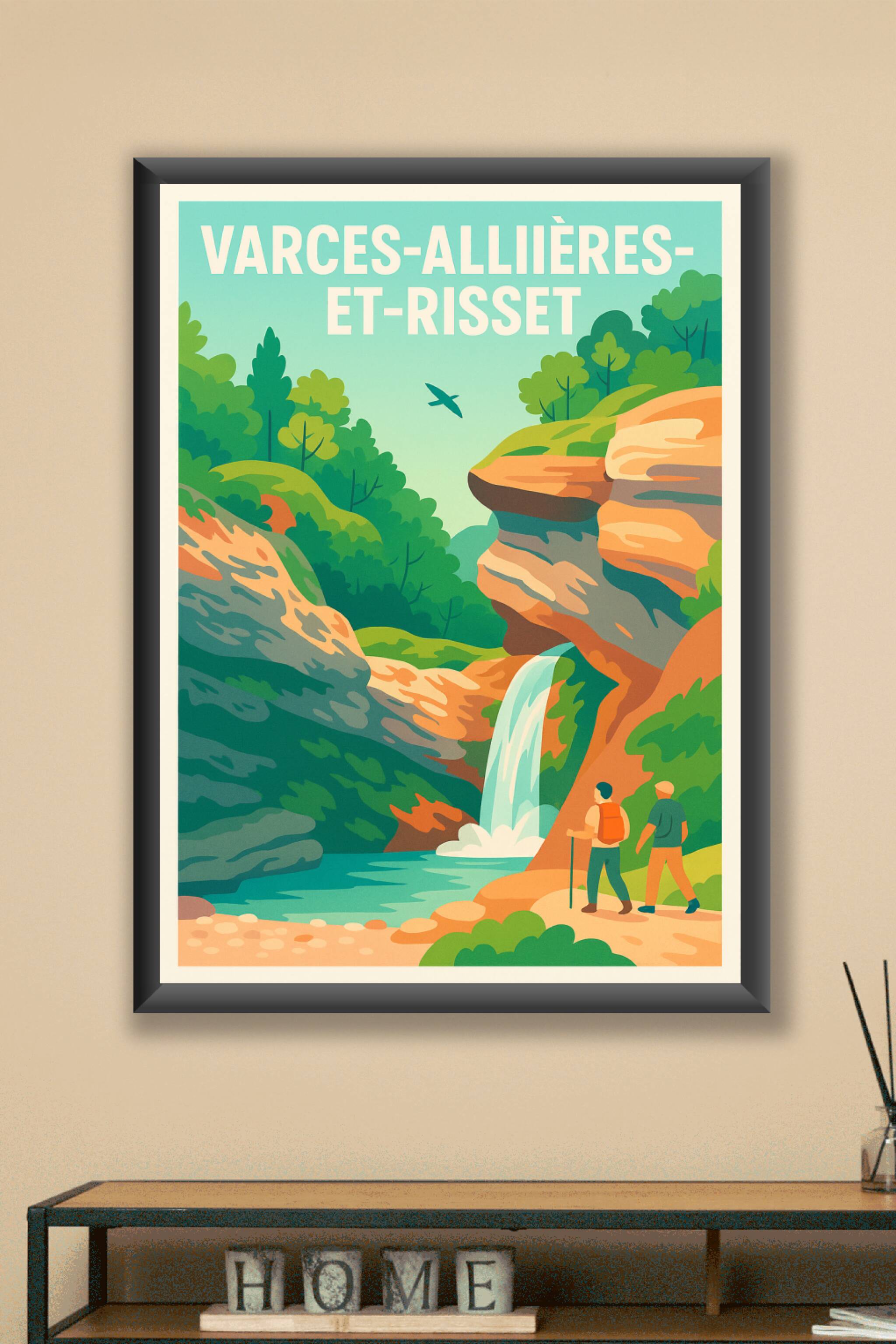 Découvrez la beauté naturelle de Varces-Allières-et-Risset avec cette affiche illustrée mettant en scène une cascade spectaculaire nichée au cœur d...
