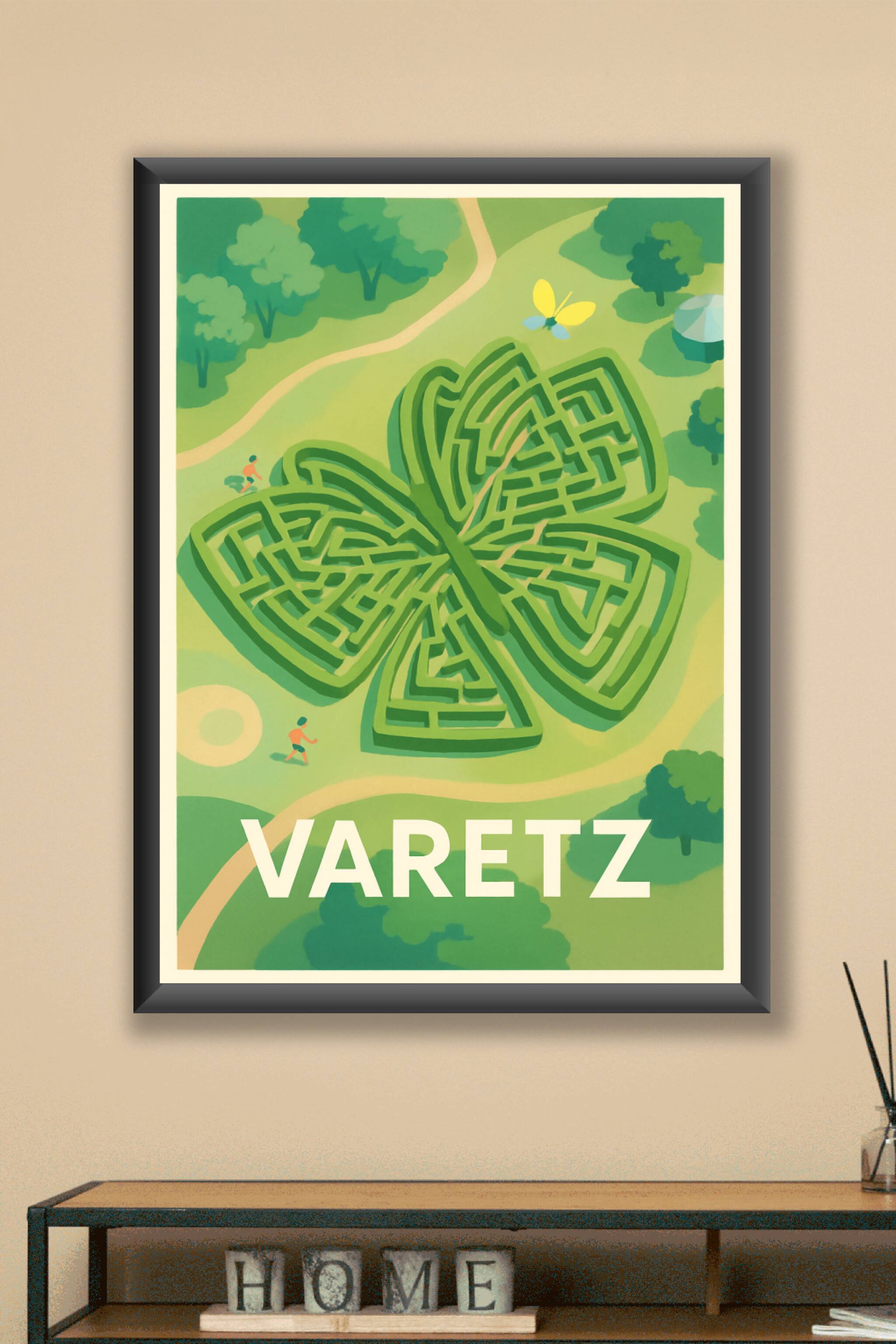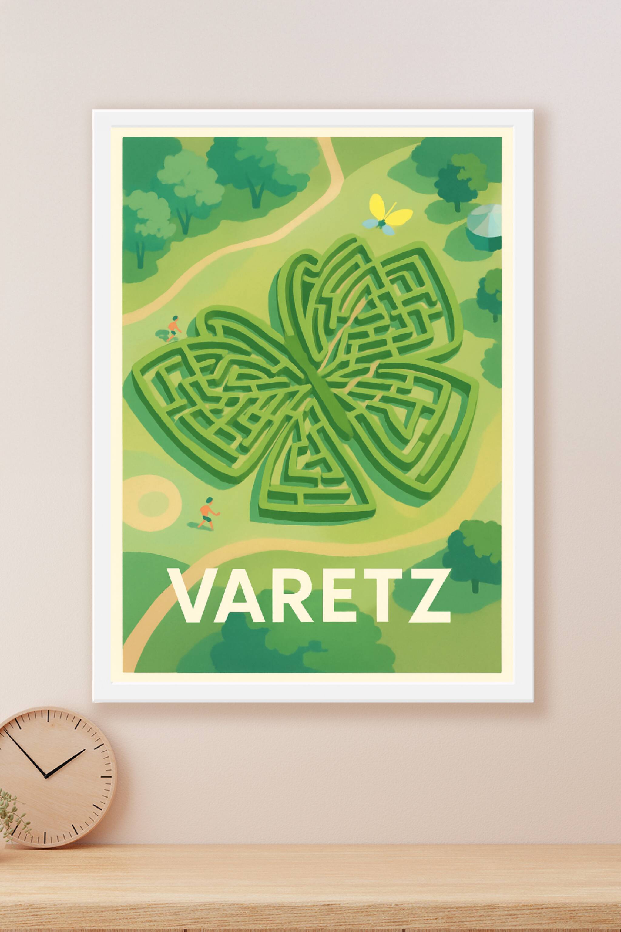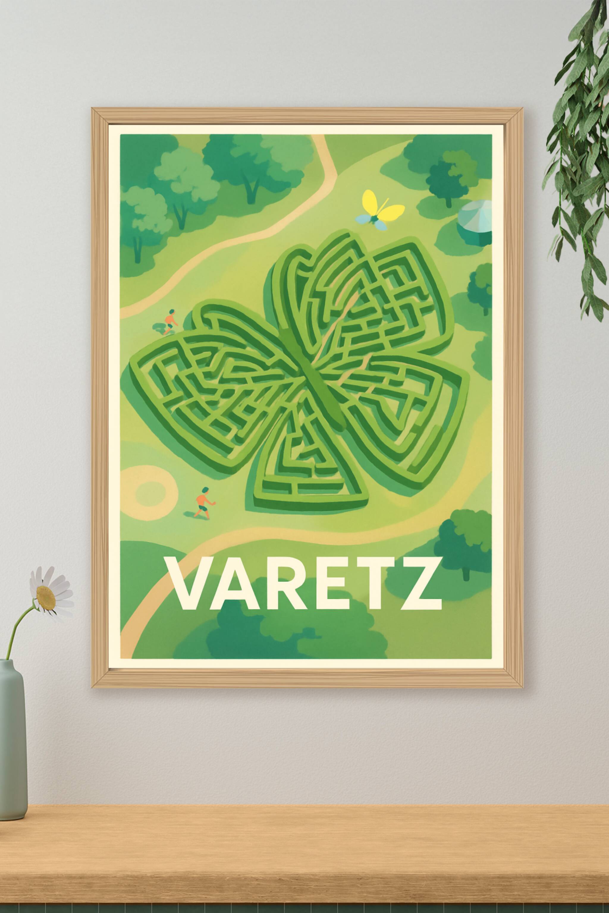 Découvrez la charmante ville de Varetz à travers cette affiche originale mettant en scène un labyrinthe végétal en forme de papillon, symbole de lé...
