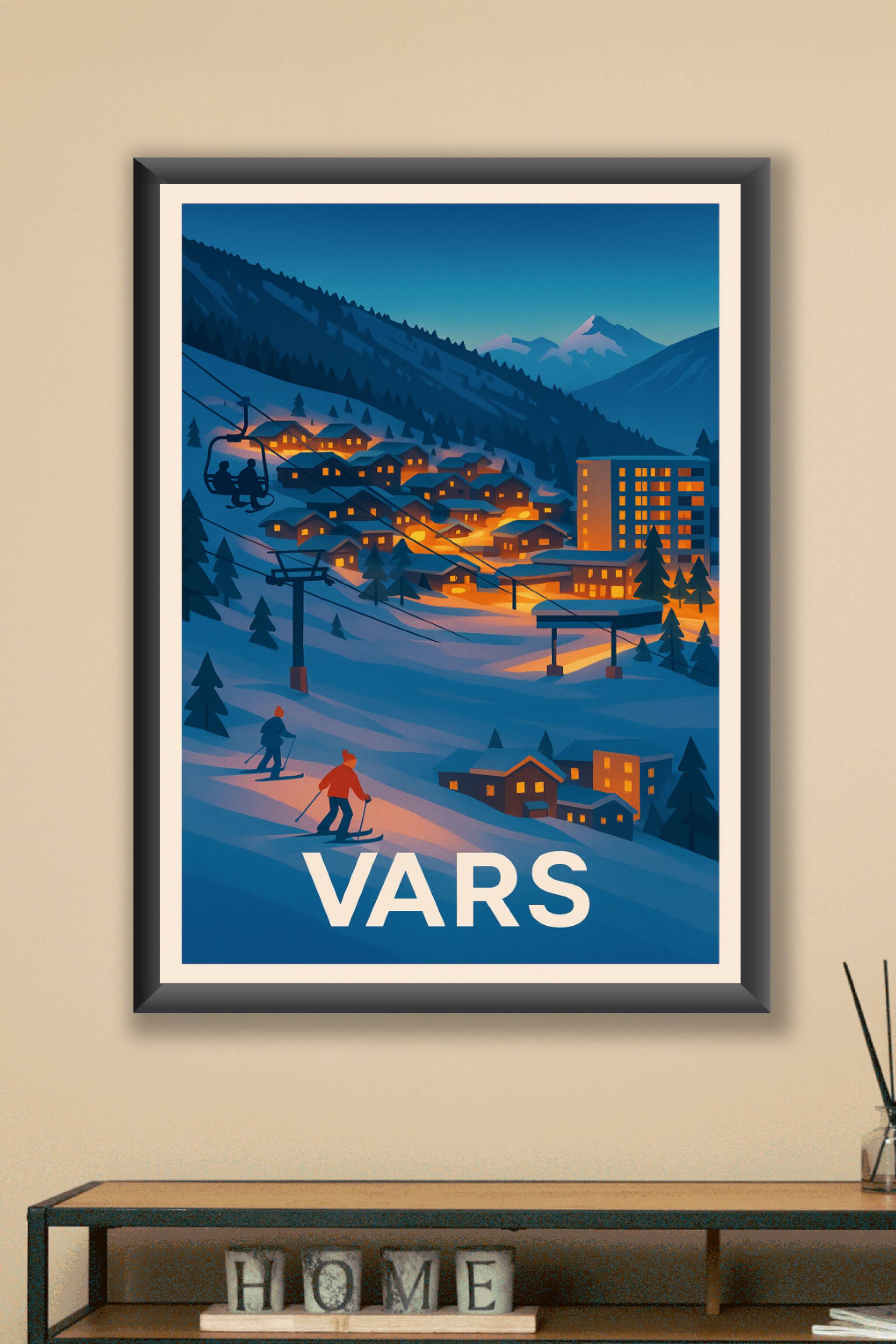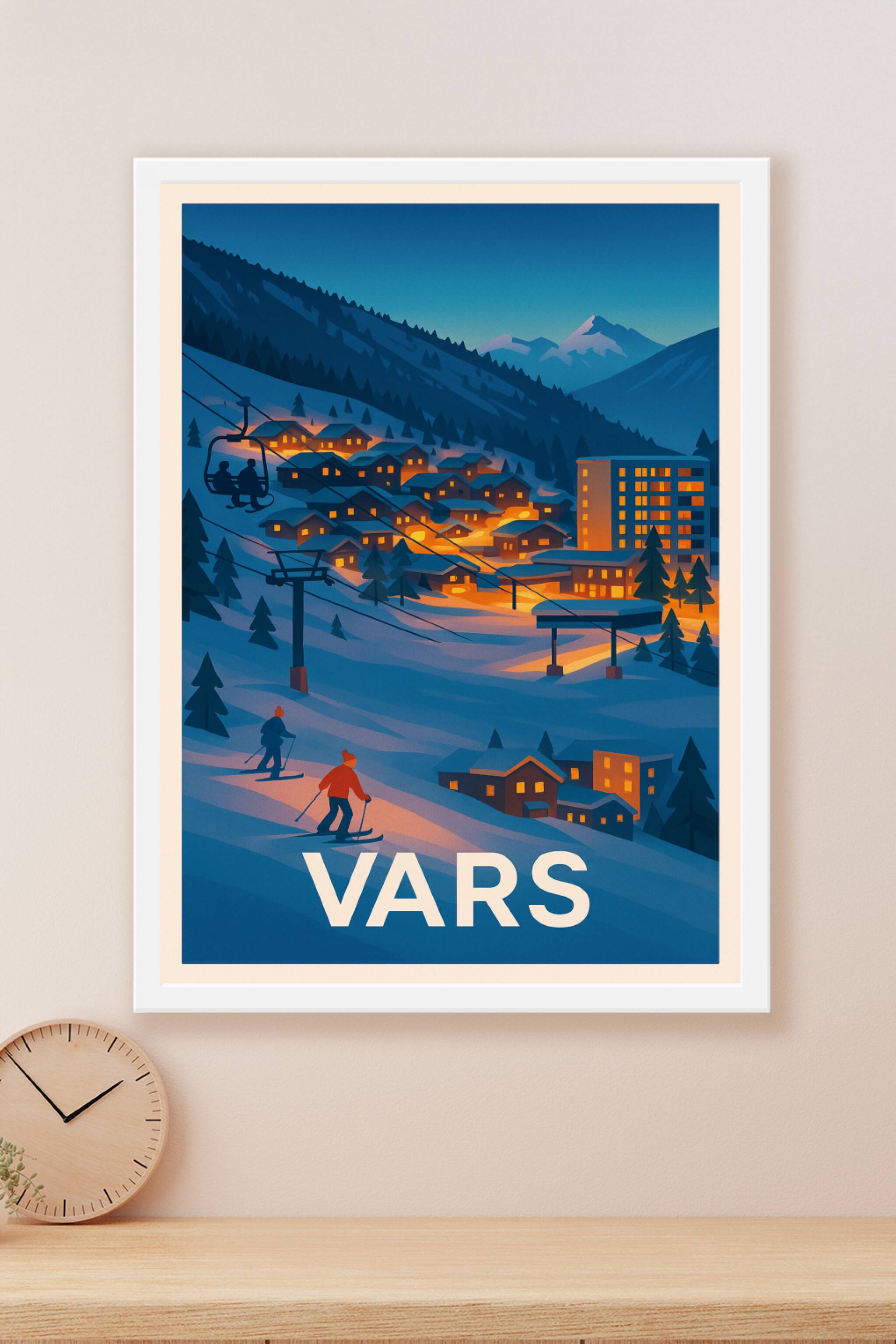 Découvrez la magie de Vars à travers cette affiche illustrée aux tons chaleureux et apaisants représentant une station de ski illuminée au crépuscu...
