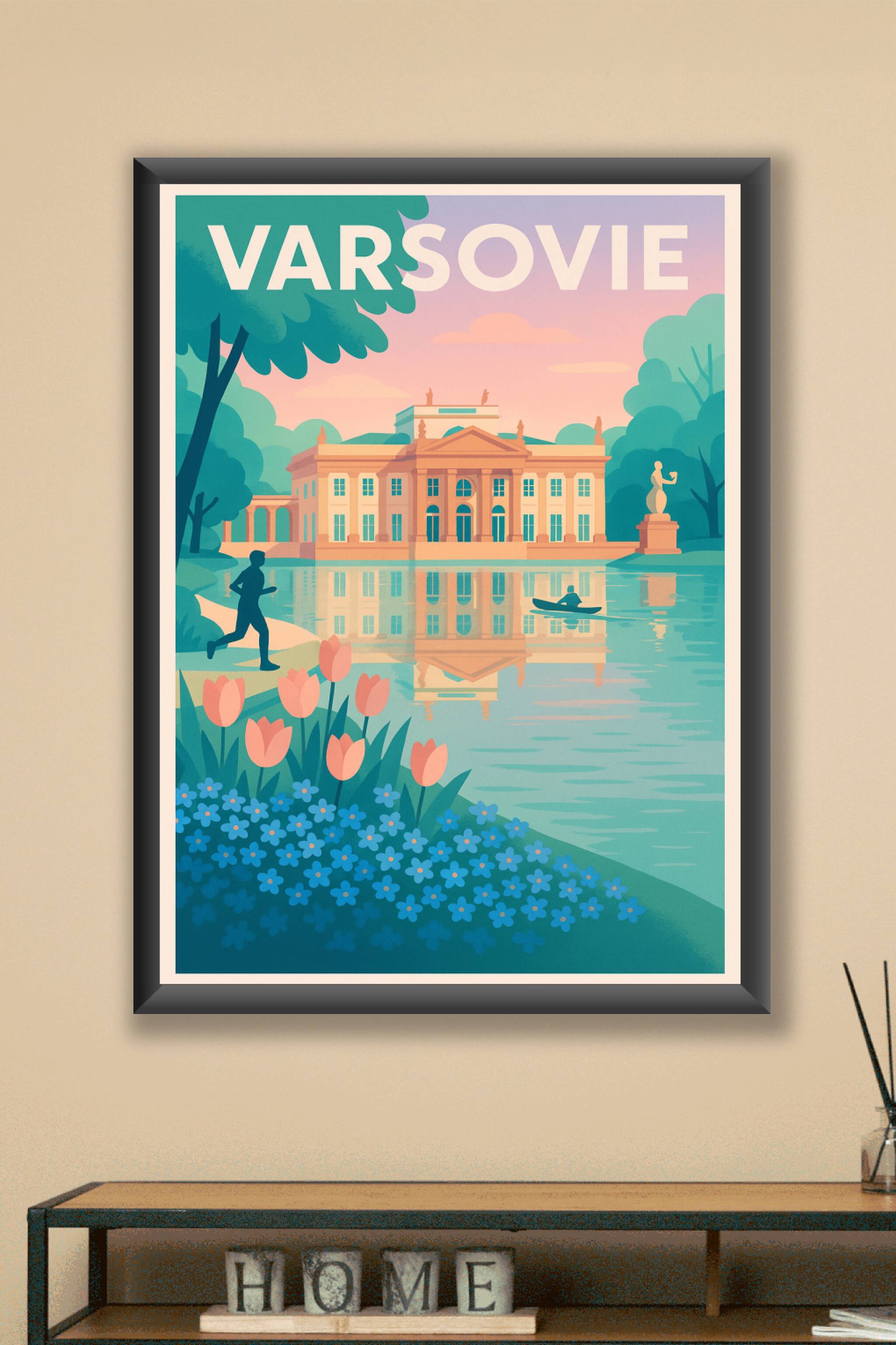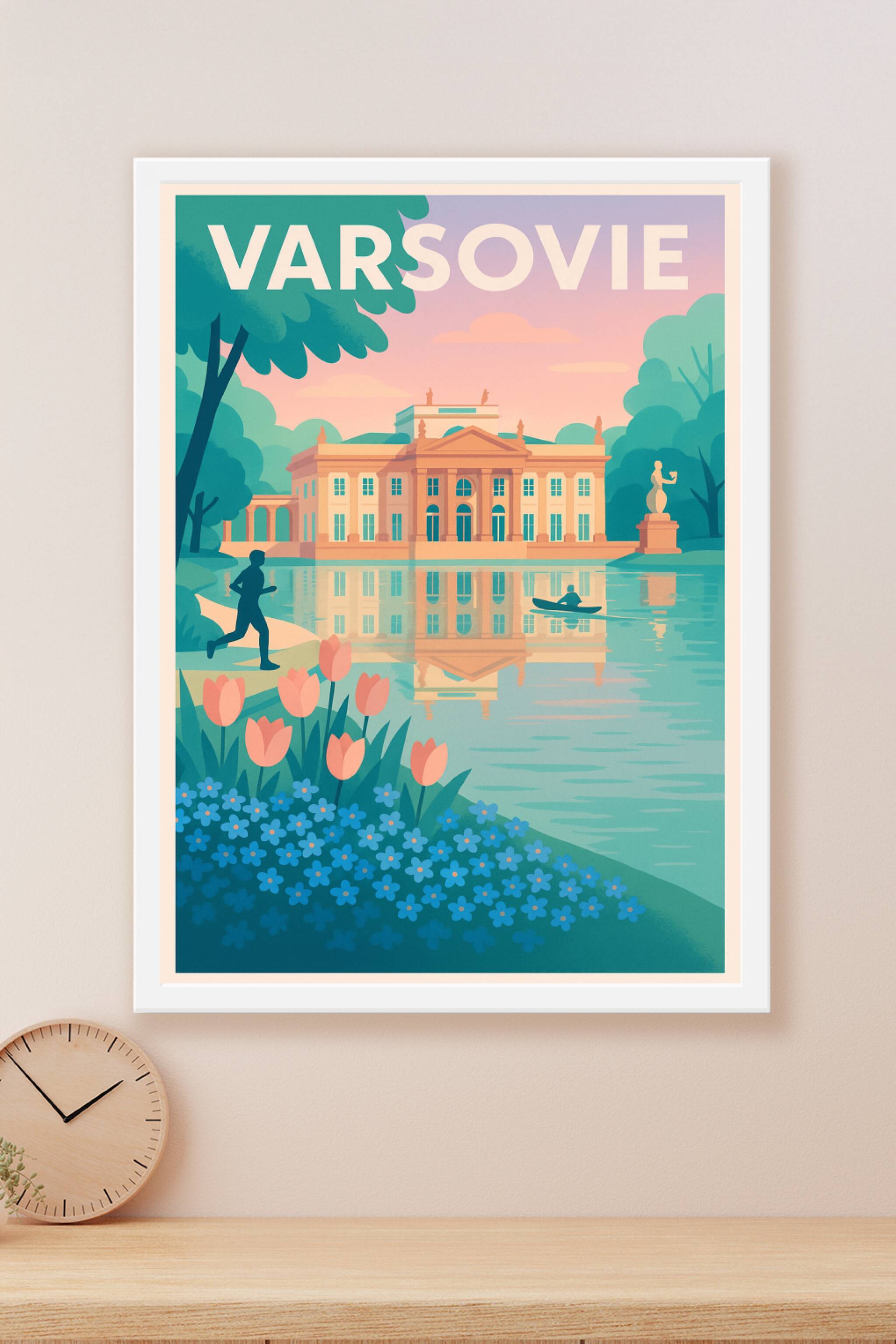 Découvrez la quiétude du Parc Łazienki à Varsovie avec cette affiche au charme vintage qui met en valeur le Palais sur l'eau, reflet magnifique sur le lac bordé de fleurs colorées. Ce poster élégant capture une scène paisible, alliant verdure et architecture néoclassique dans des tons doux et harmonieux. Proposé en tirage "Fine Art" sur papier 305g coton de grande qualité, ce poster est disponible en formats A1 à A4, avec ou sans cadre, pour s'adapter parfaitement à votre décoration intérieure. Imprimée en France avec un soin artisanal, cette affiche de Varsovie est une pièce décorative idéale pour les amoureux des ambiances apaisantes et des voyages culturels.