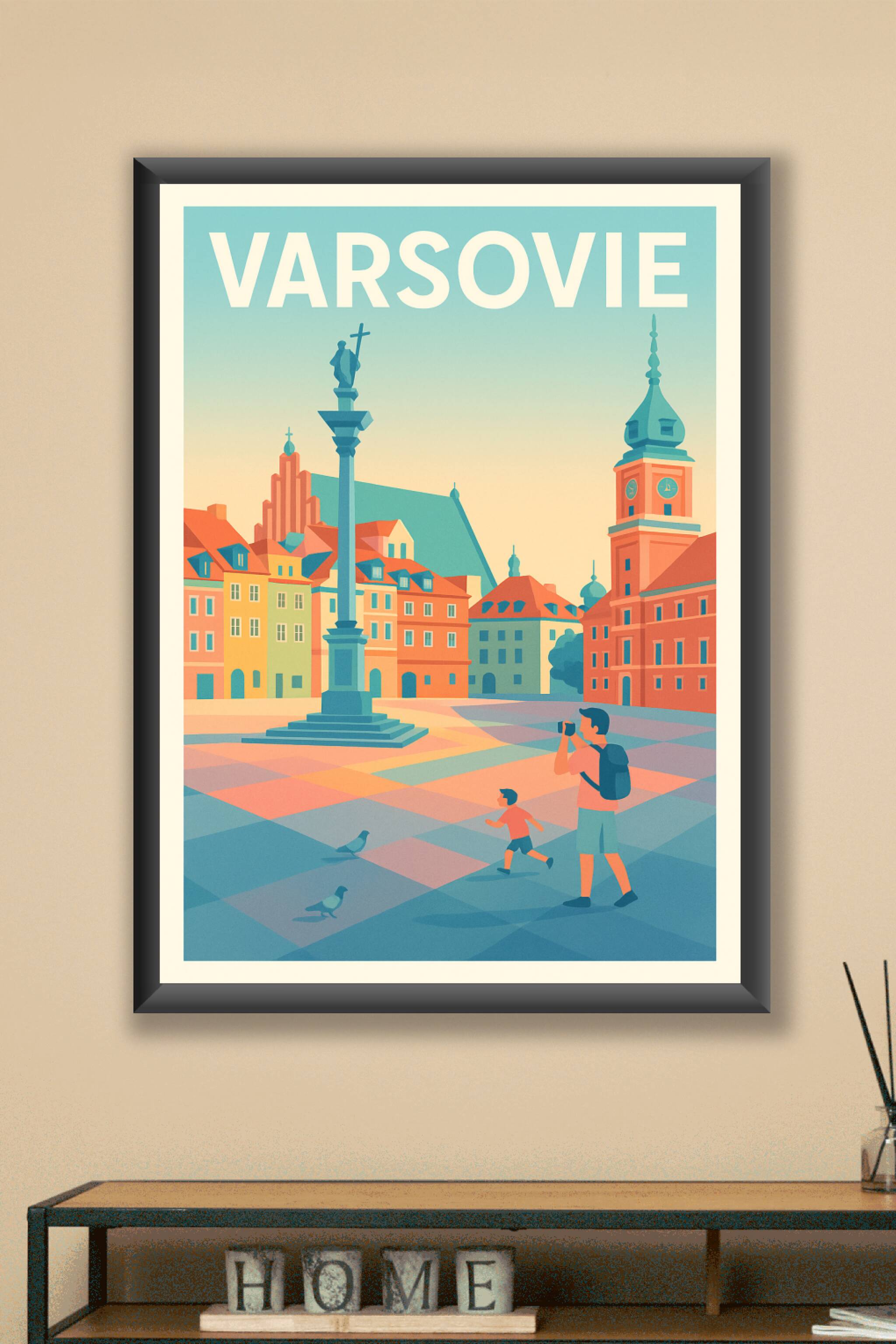 Découvrez l'atmosphère unique et pittoresque de Varsovie avec cette affiche illustrée représentant la charmante vieille ville aux teintes douces et...
