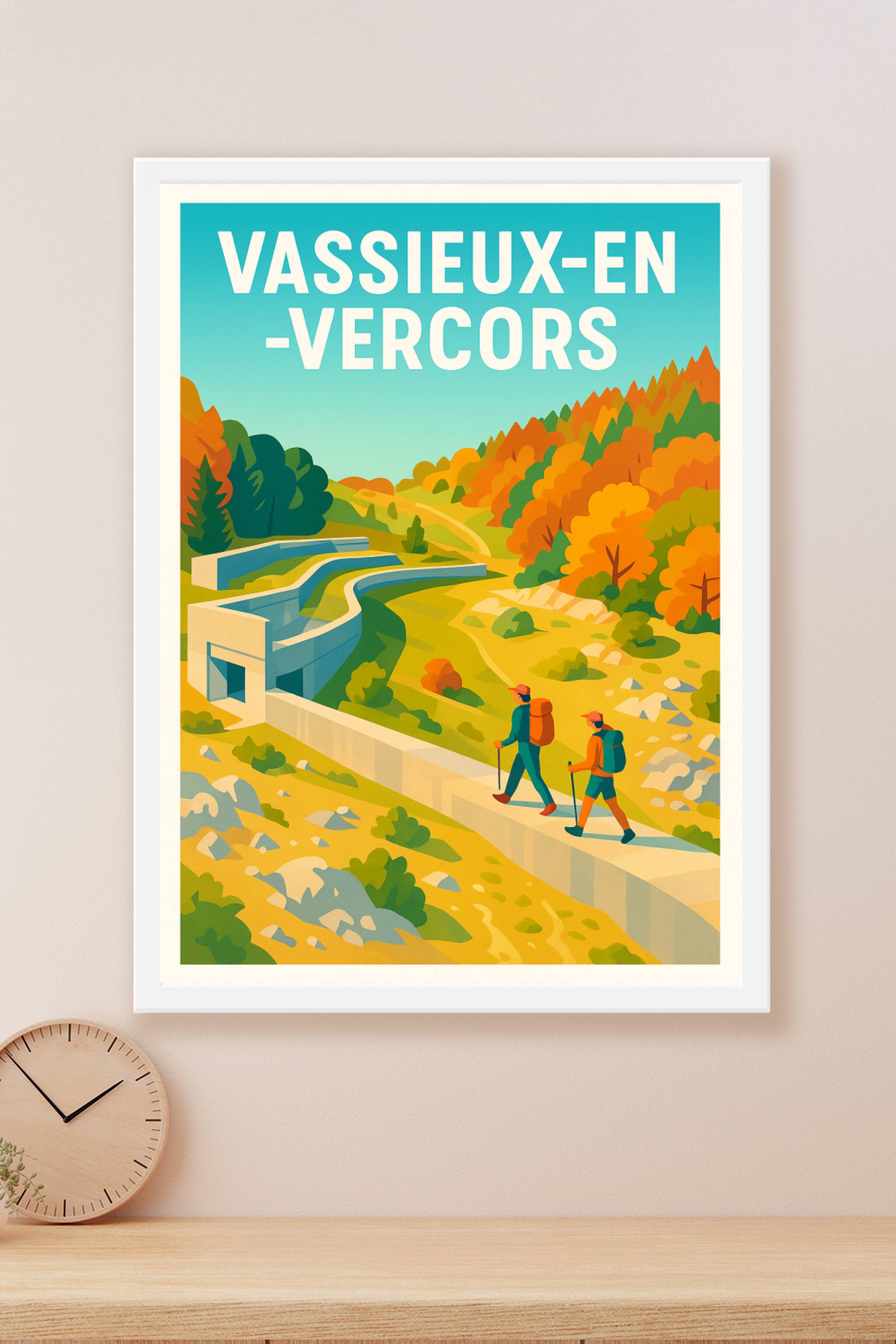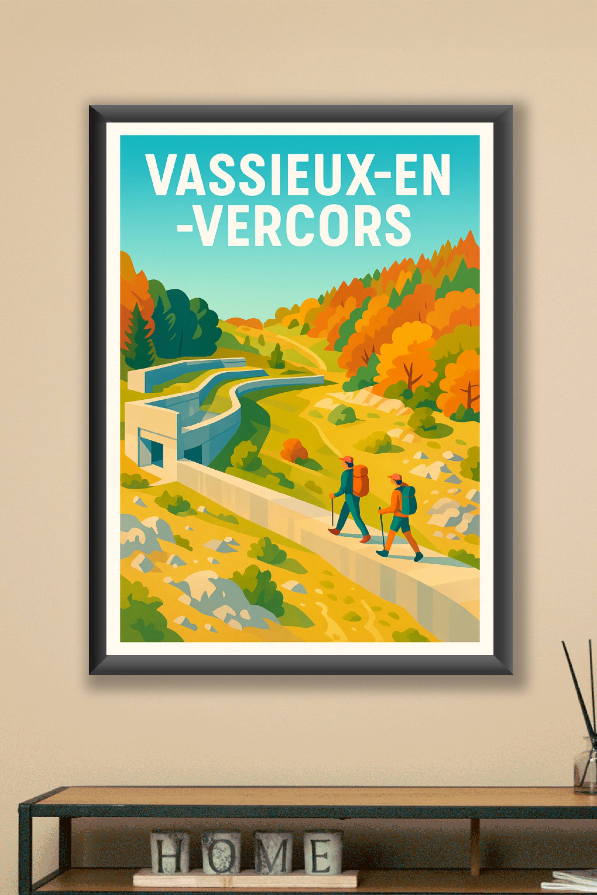Découvrez l'esprit aventurier de Vassieux-en-Vercors à travers cette superbe affiche qui illustre un paysage naturel où randonnée et découverte se mêlent au cœur d'automne coloré. Ce poster vibrant met en scène deux randonneurs progressant dans un décor bucolique, sous un ciel azur, invitant à l'exploration et à la détente en pleine nature. Imprimée en tirage "Fine Art" sur un papier 305g coton d'une qualité d'exception, cette affiche est disponible en formats A1 à A4, avec ou sans cadre. Sublimez votre intérieur ou offrez un souvenir unique des magnifiques paysages du Vercors grâce à cette pièce d'art graphique, produite en France pour une finition premium.