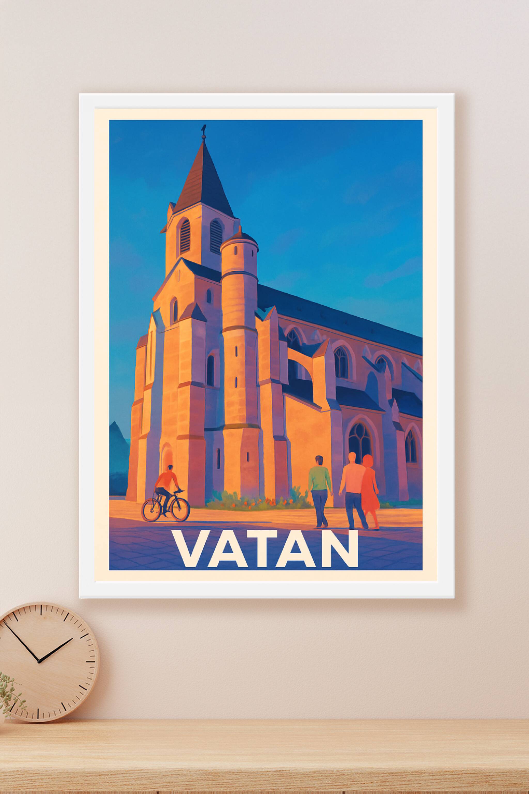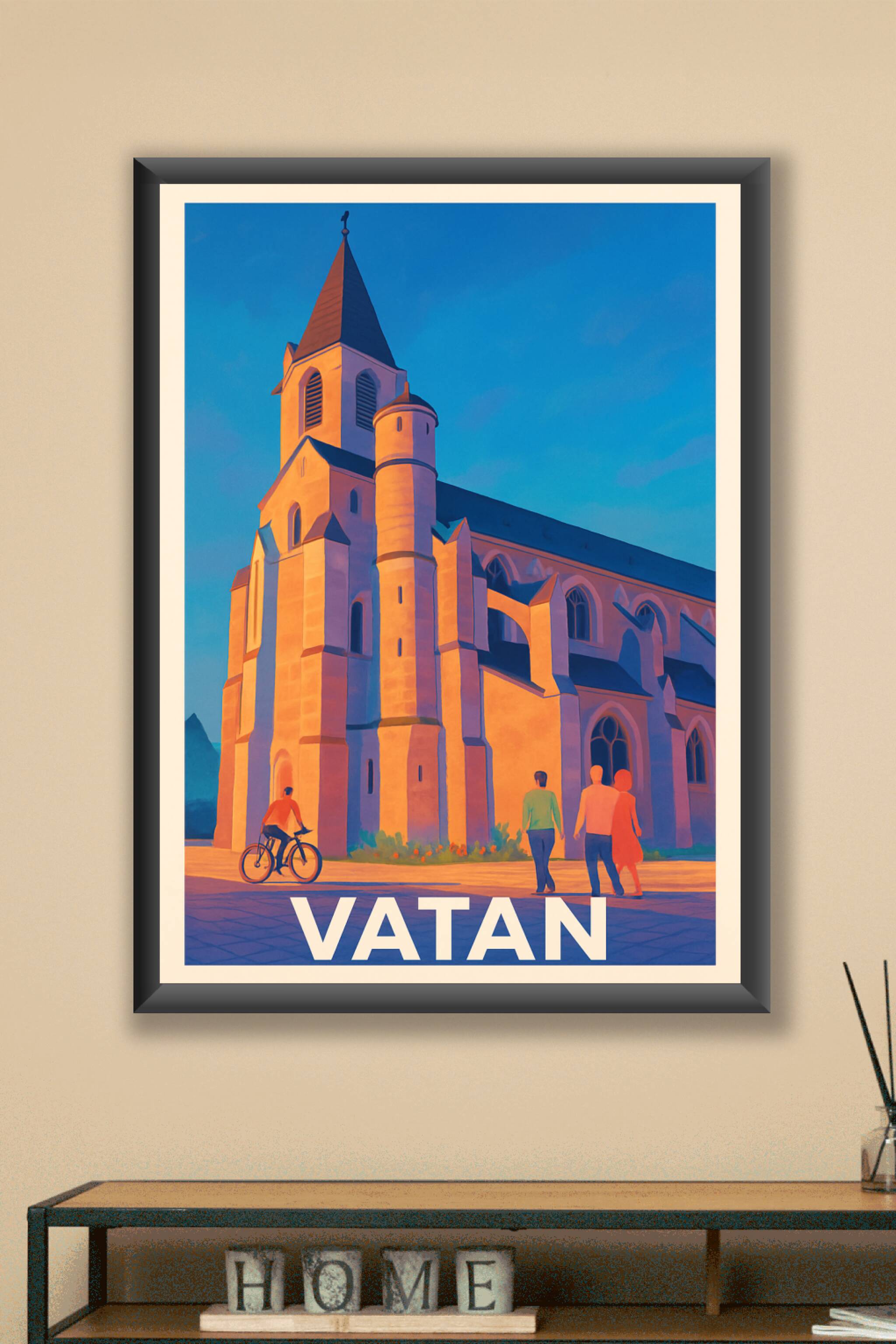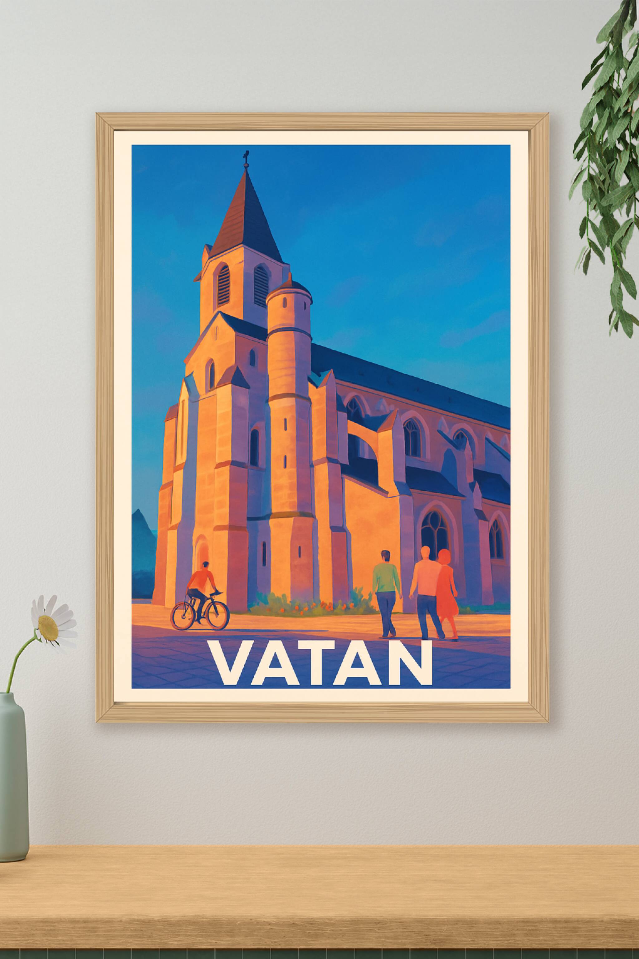 Découvrez le charme authentique de Vatan avec cette affiche illustrant un édifice emblématique baigné par la lumière dorée du coucher de soleil. Ce...