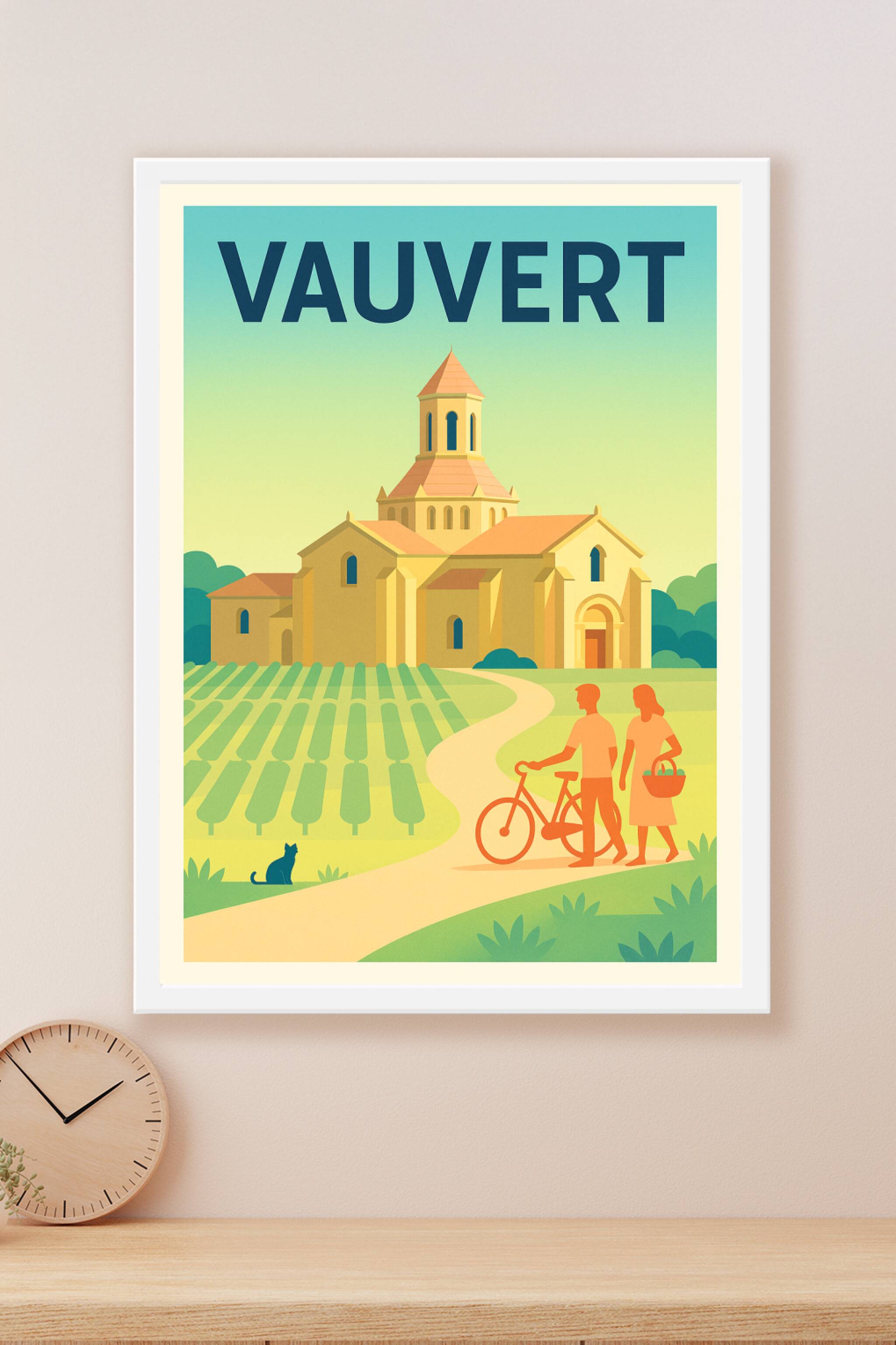 Découvrez la douceur de vivre de Vauvert avec cette affiche illustrant un paysage paisible aux couleurs douces et harmonieuses. Le poster met en avant une architecture locale typique, baignée par une lumière chaleureuse, entourée de champs et d’un chemin sinueux où se promènent deux personnages, incarnant la sérénité de cette région. Ce poster est proposé en tirage "Fine Art" sur papier 305g coton, garantissant une qualité d'impression exceptionnelle et une grande durabilité des couleurs. Disponible en formats A1 à A4, avec ou sans cadre, cette affiche apportera une touche d'élégance et de calme à votre intérieur tout en sublimant votre décoration avec une ambiance authentique et champêtre. Fabriqué en France, ce tirage de haute qualité est idéal pour les amateurs d'art, les amoureux de Vauvert et ceux qui souhaitent offrir un souvenir raffiné.