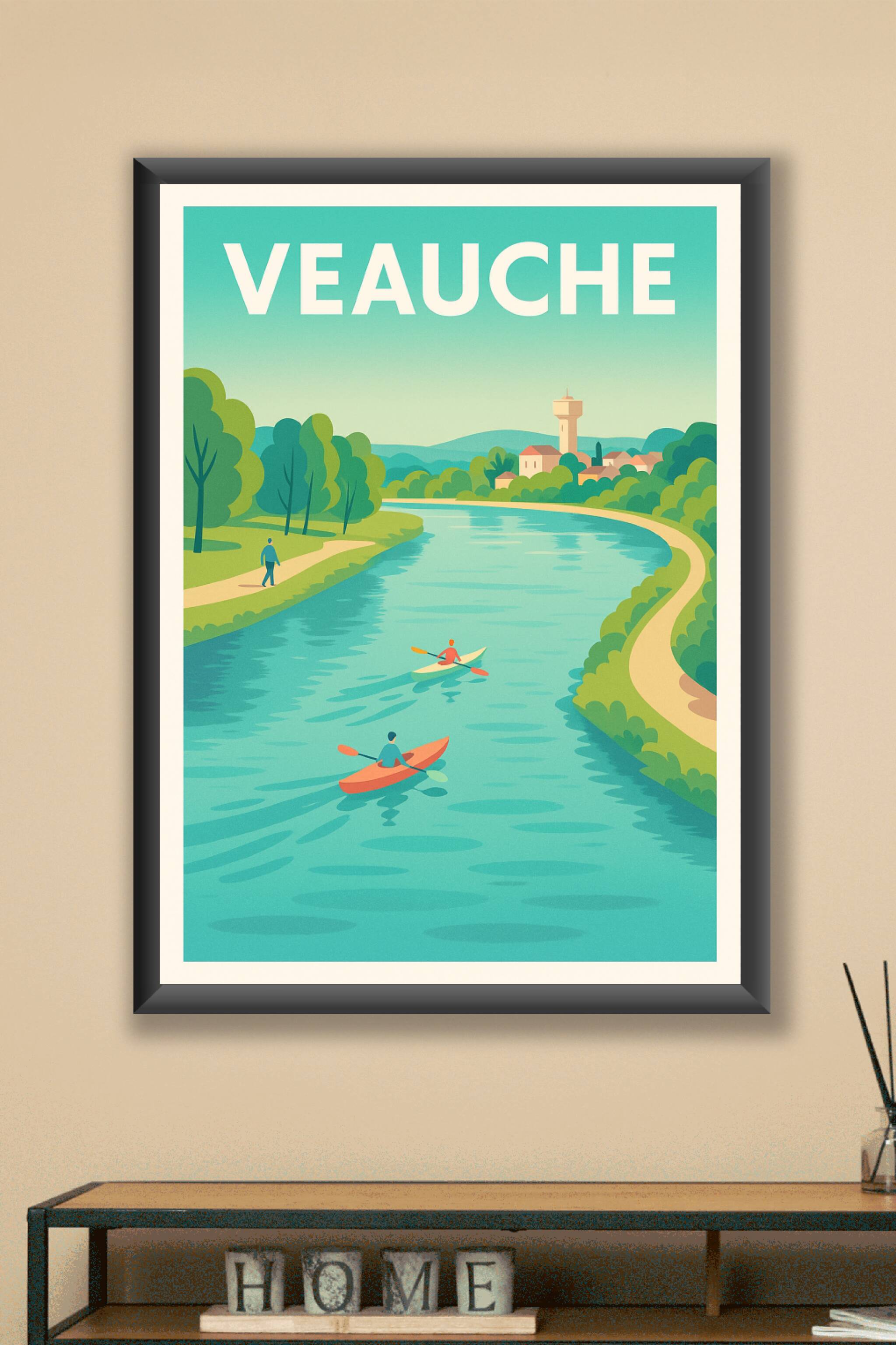 Découvrez la sérénité de Veauche avec cette affiche illustrée mettant en scène deux kayaks glissant paisiblement sur une rivière bordée de verdure....