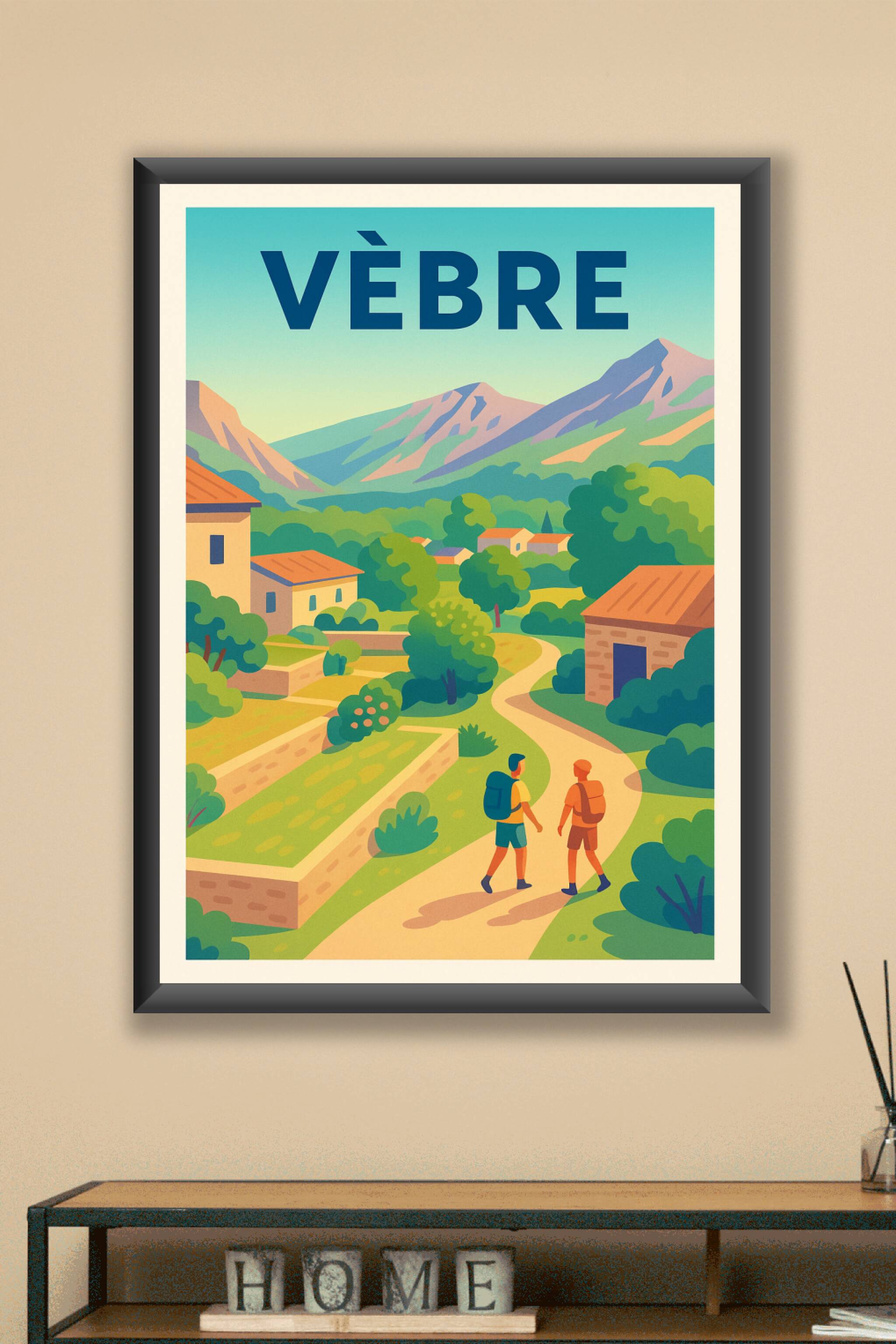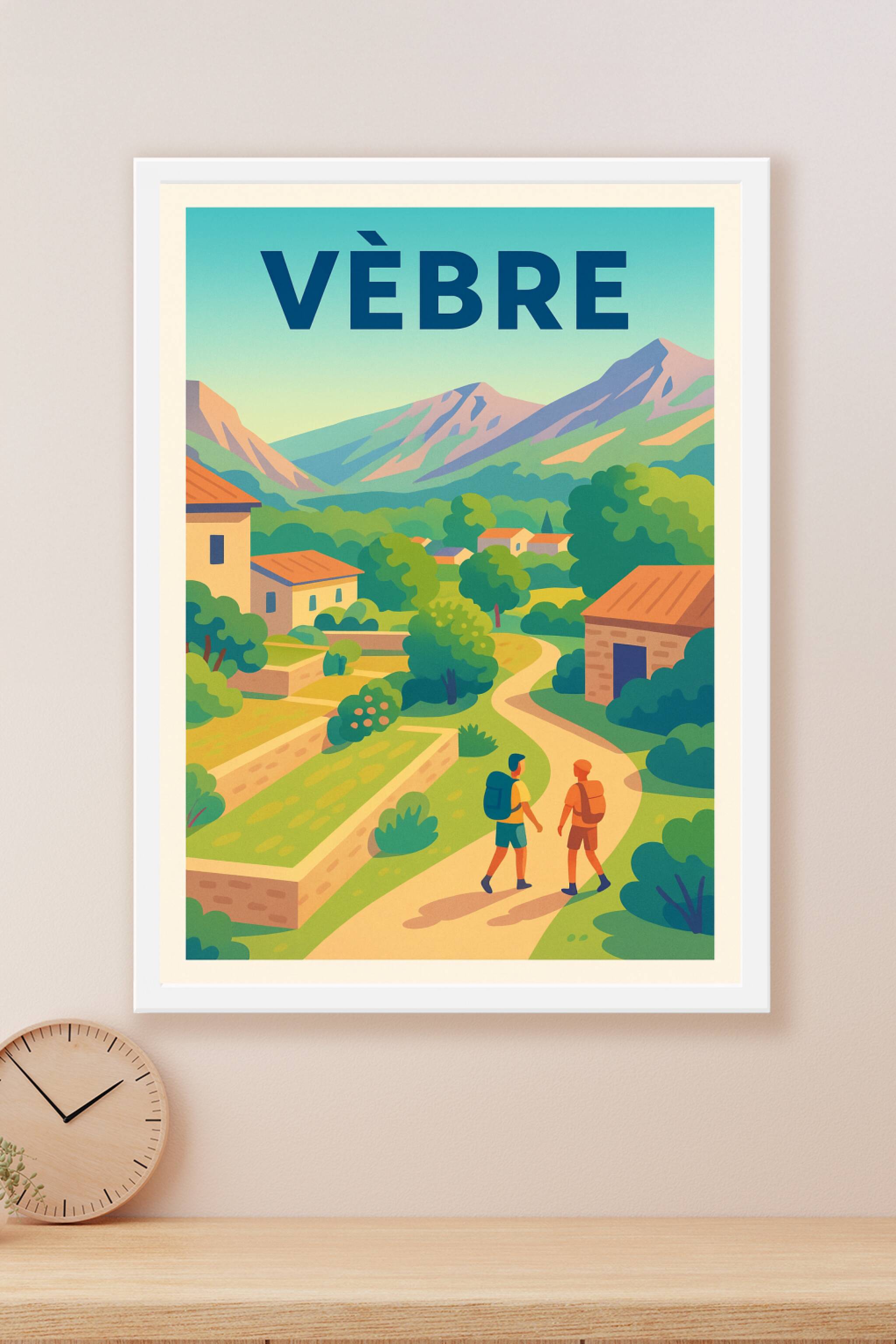 Découvrez la sérénité de Vèbre avec cette affiche illustrée, mettant en lumière un paysage bucolique où sentiers sinueux, maisons en pierres et mon...