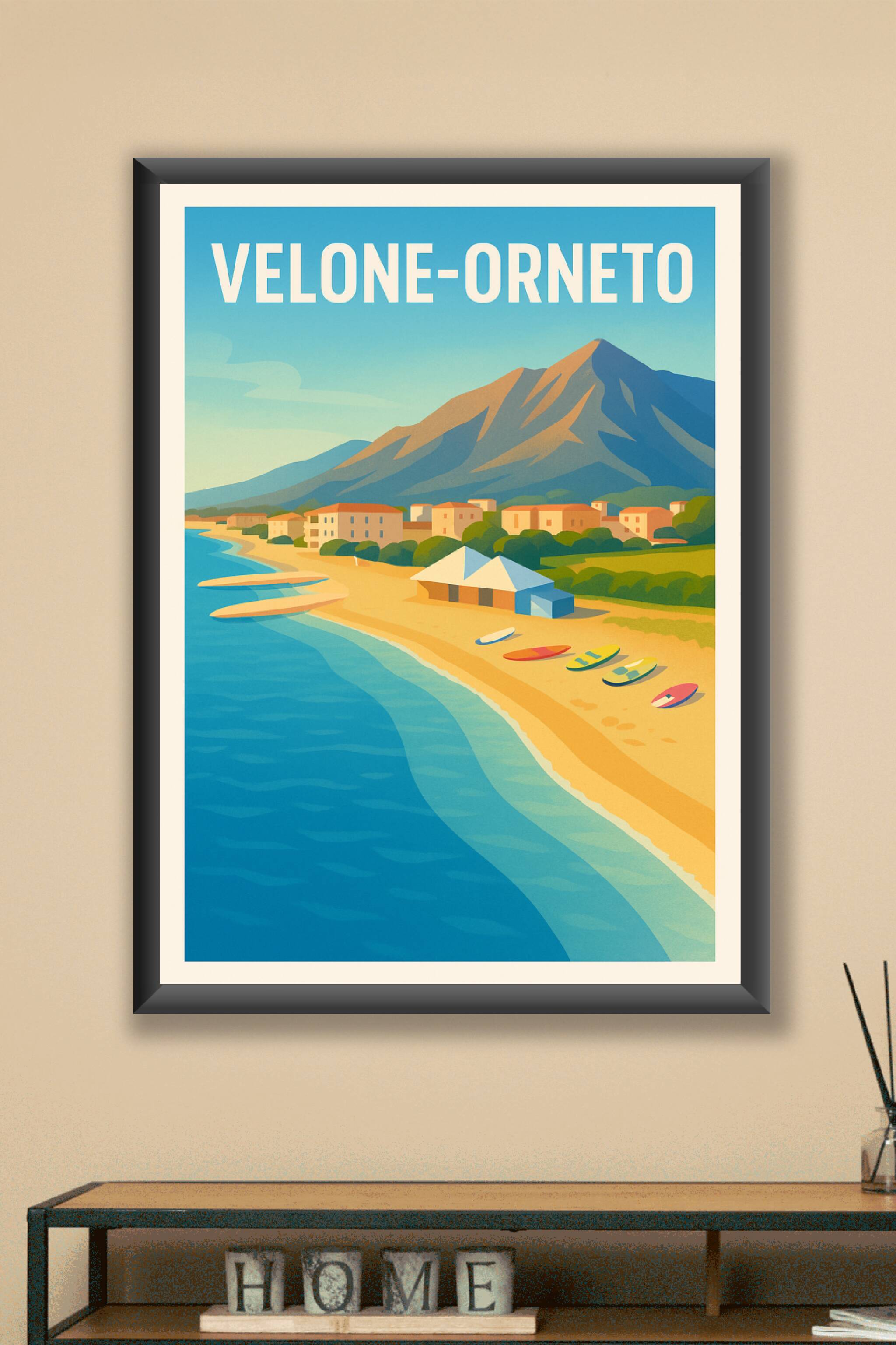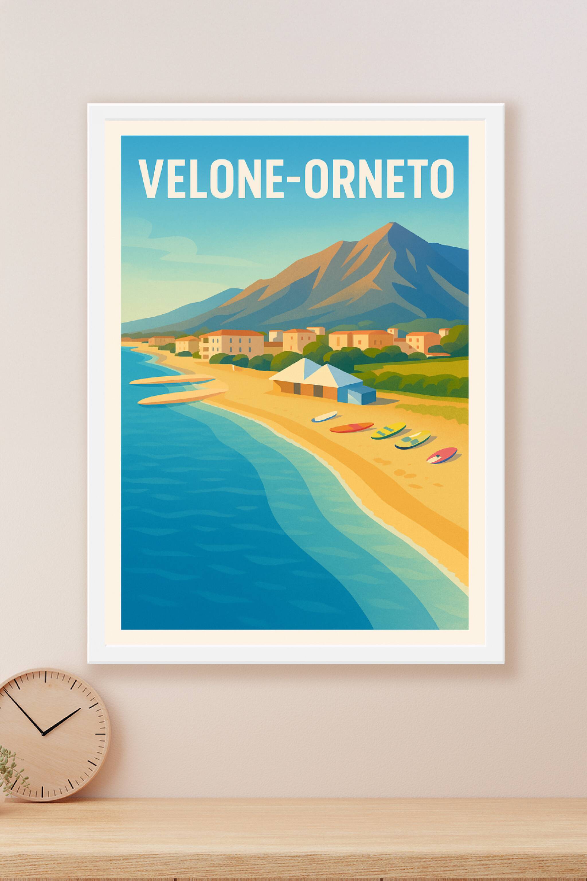 Découvrez la douceur de vivre méditerranéenne avec cette affiche dédiée à Vélone-Orneto, illustrant sa magnifique plage dorée et ses eaux limpides,...