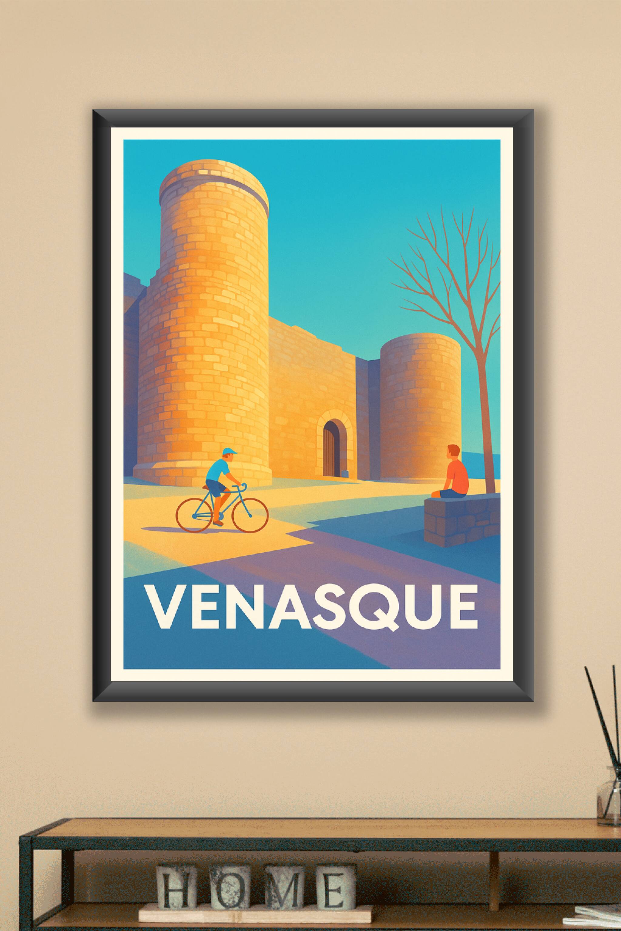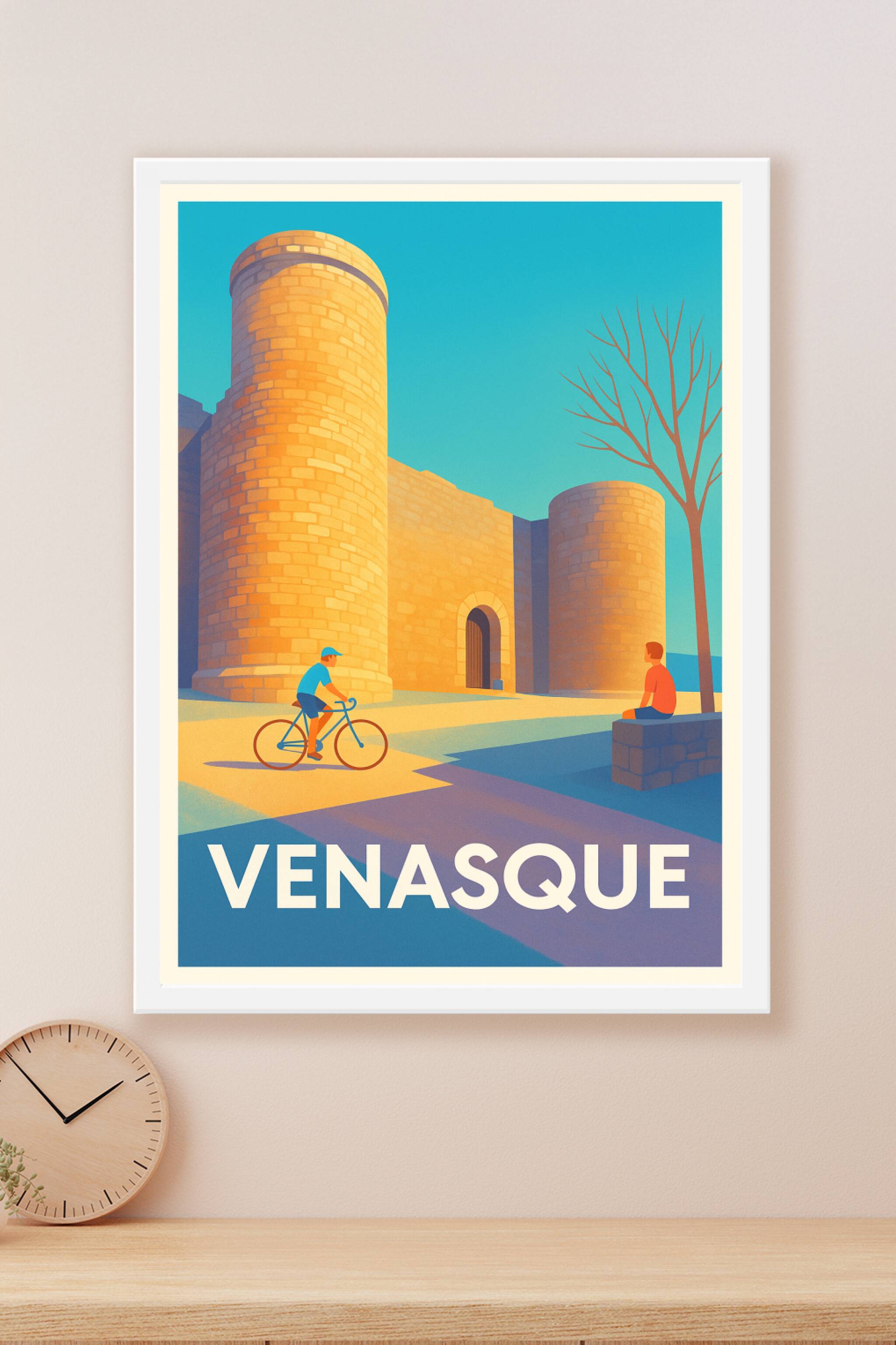 Découvrez l'ambiance paisible et lumineuse de Venasque à travers cette affiche illustrée mettant en avant ses remparts médiévaux baignés par la dou...