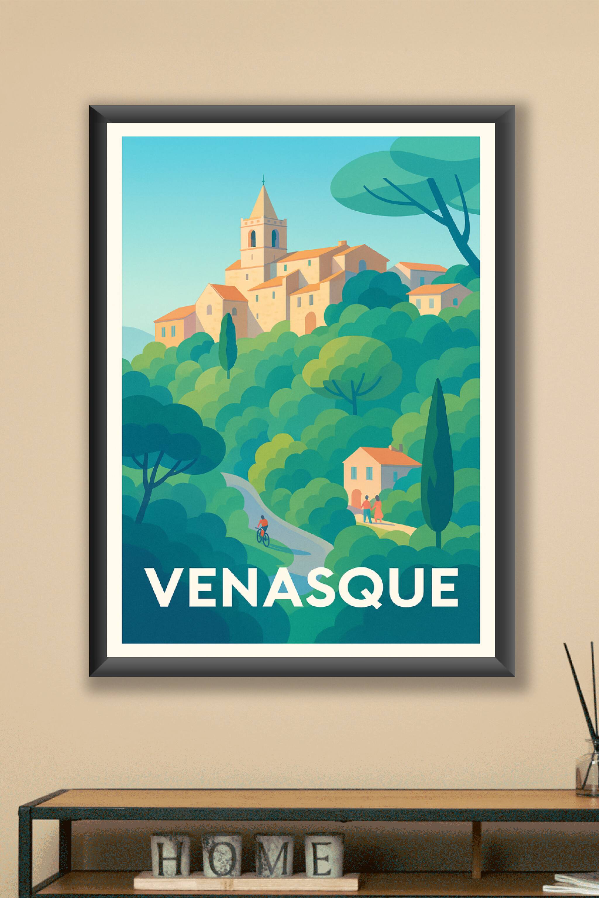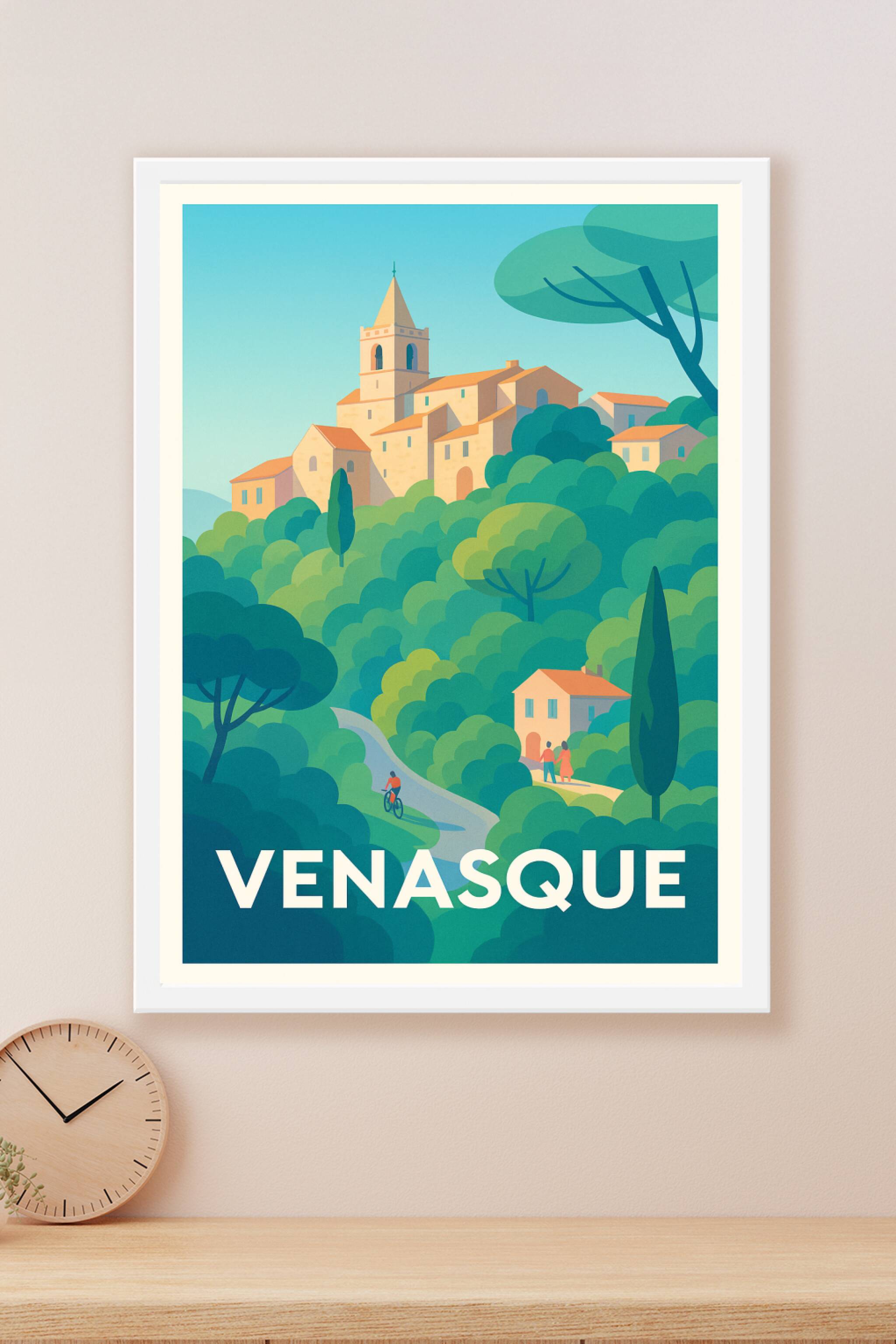 Découvrez le charme authentique de Venasque avec cette affiche illustrée au style moderne et épuré. Niché au sommet de collines verdoyantes, ce vil...