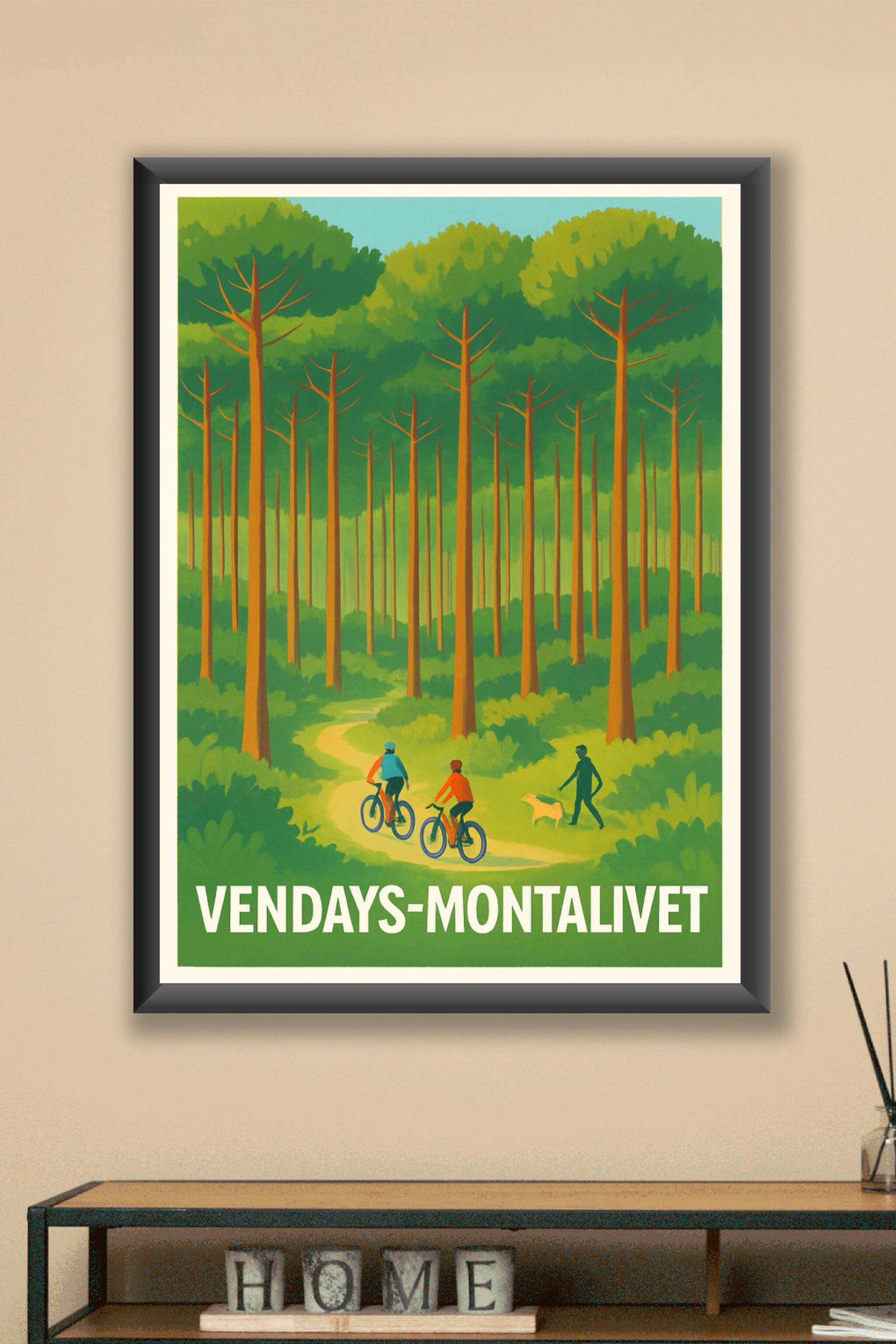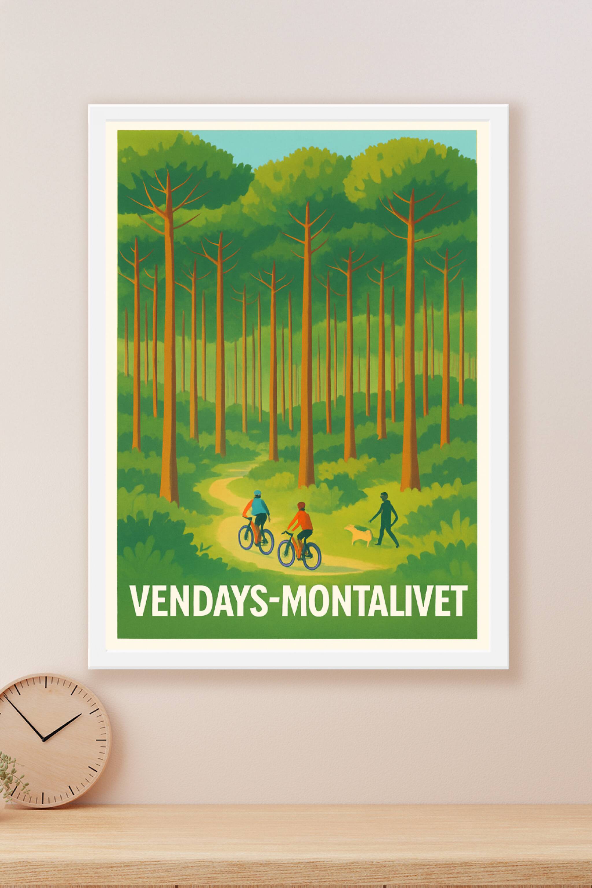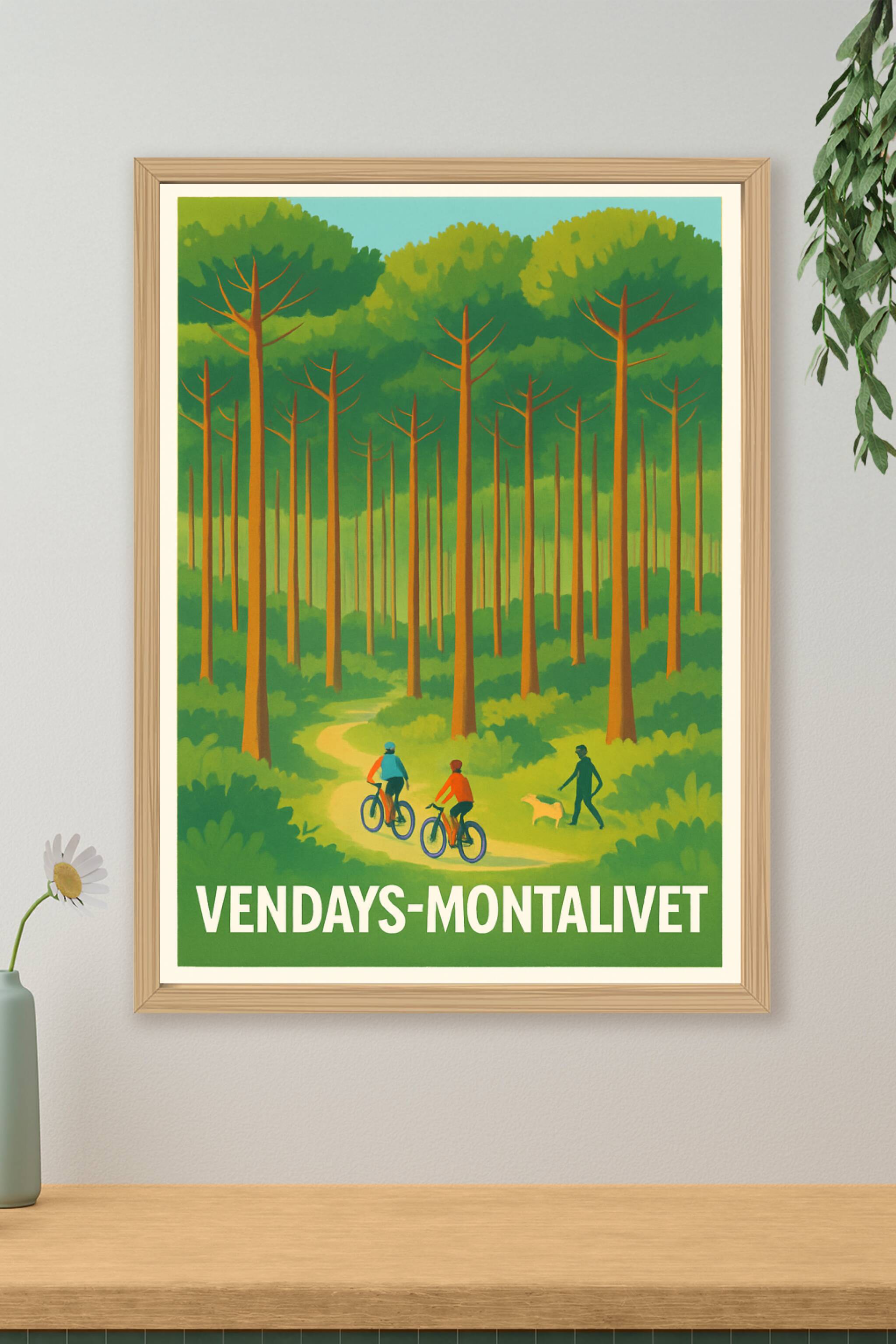 Découvrez la sérénité des paysages boisés de Vendays-Montalivet avec cette affiche illustrée mettant en scène une promenade paisible à vélo et à pi...