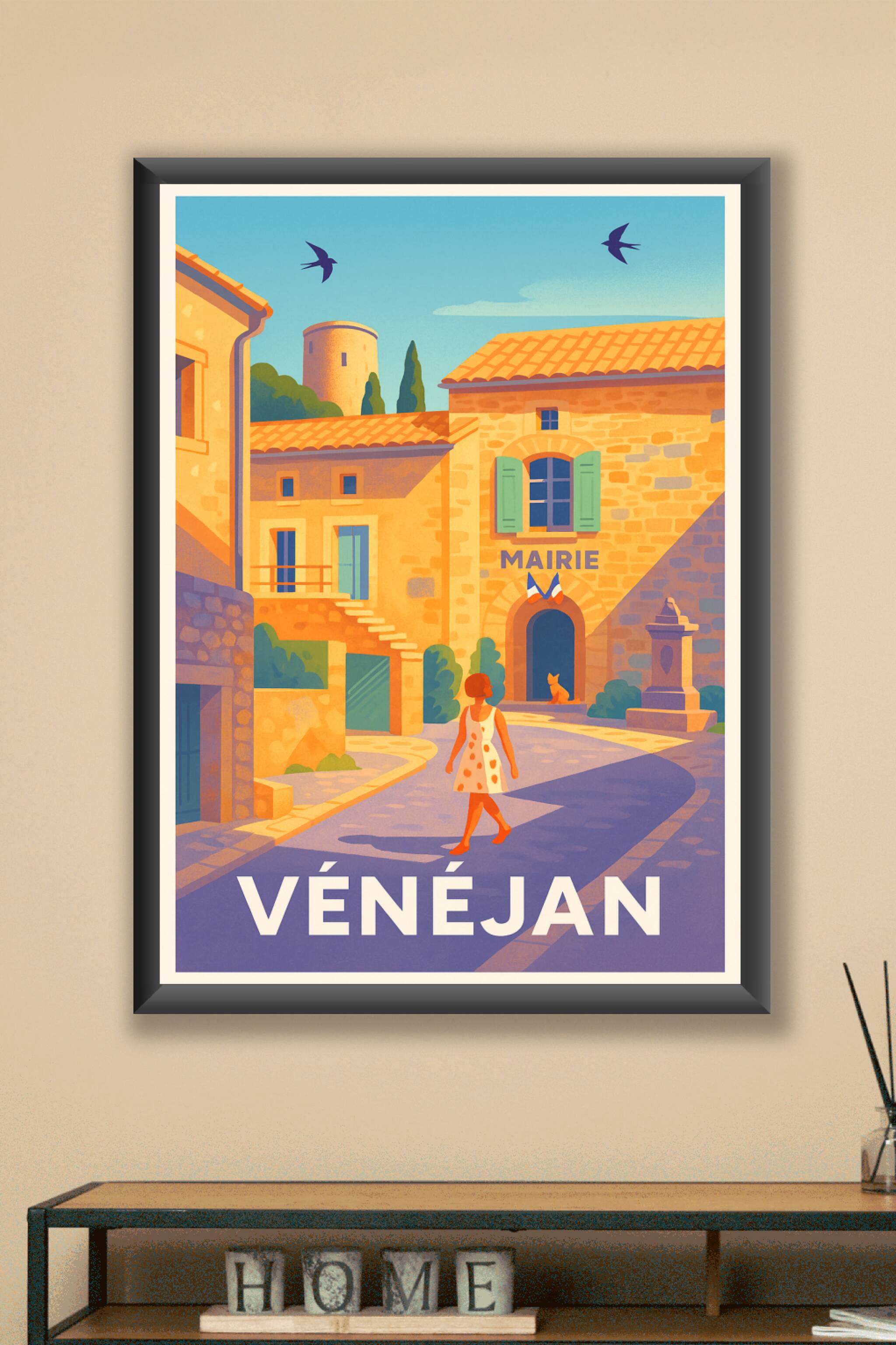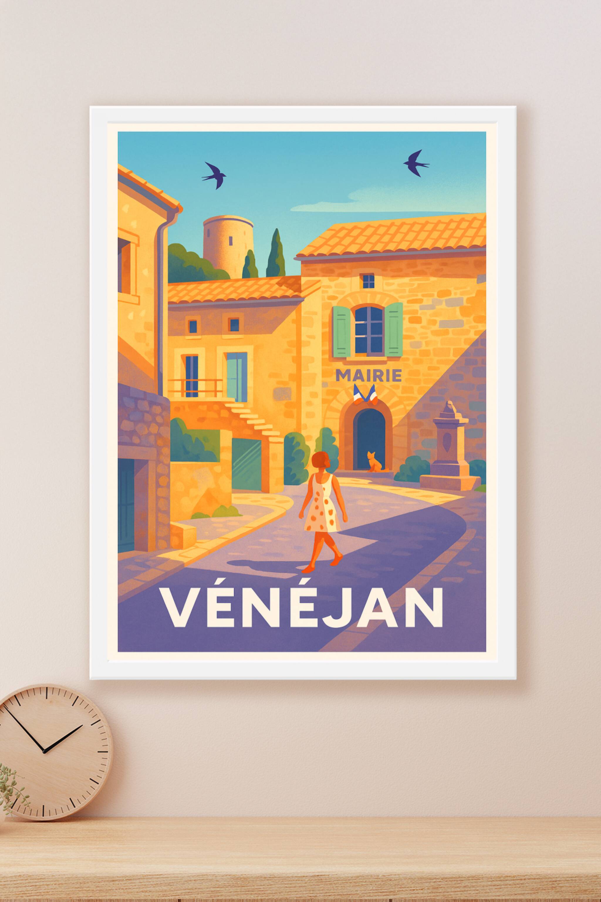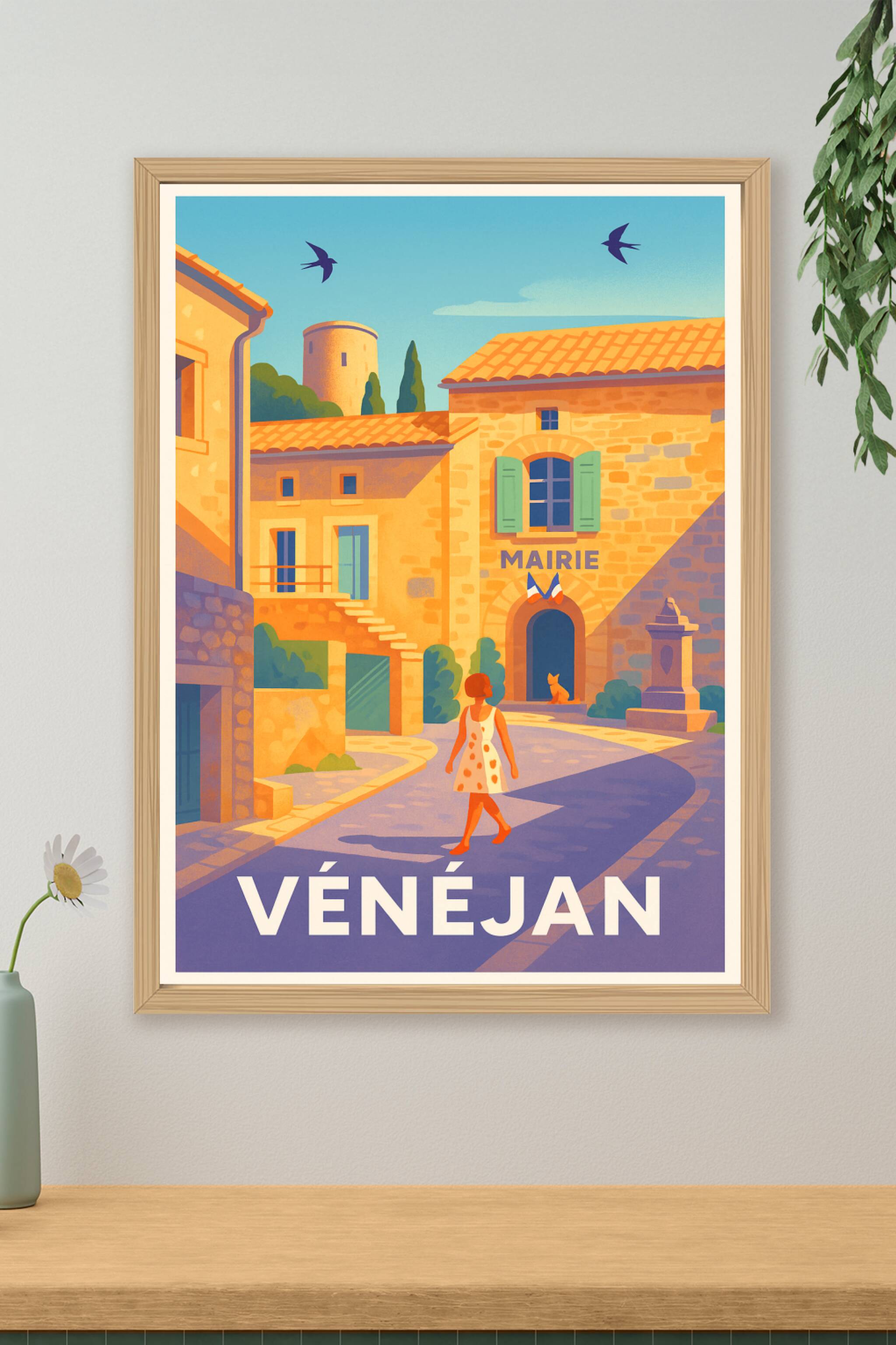 Découvrez le charme accolé de Vénéjan à travers cette affiche illustrée aux teintes chaudes et lumineuses, mettant en scène les ruelles ensoleillée...