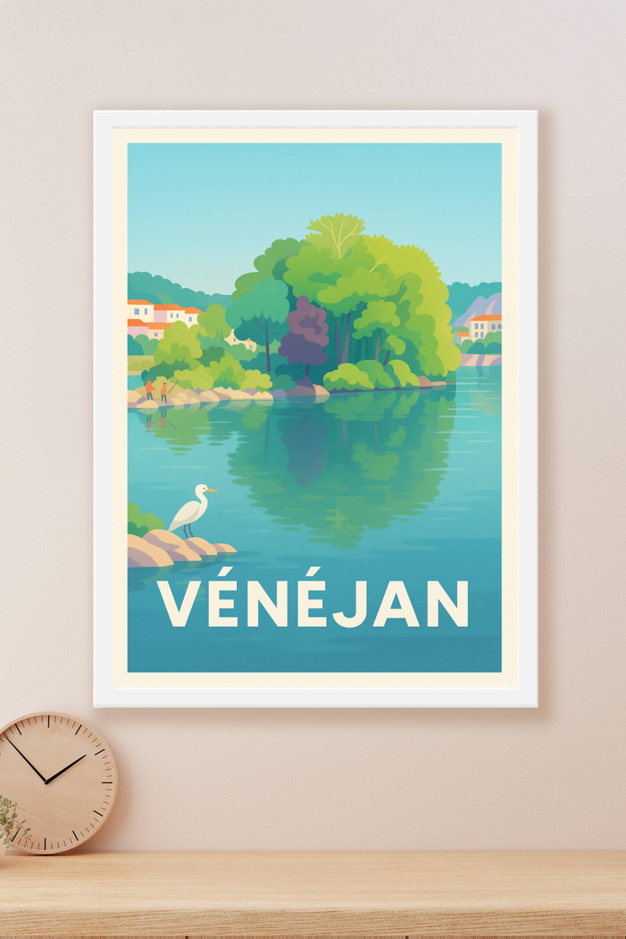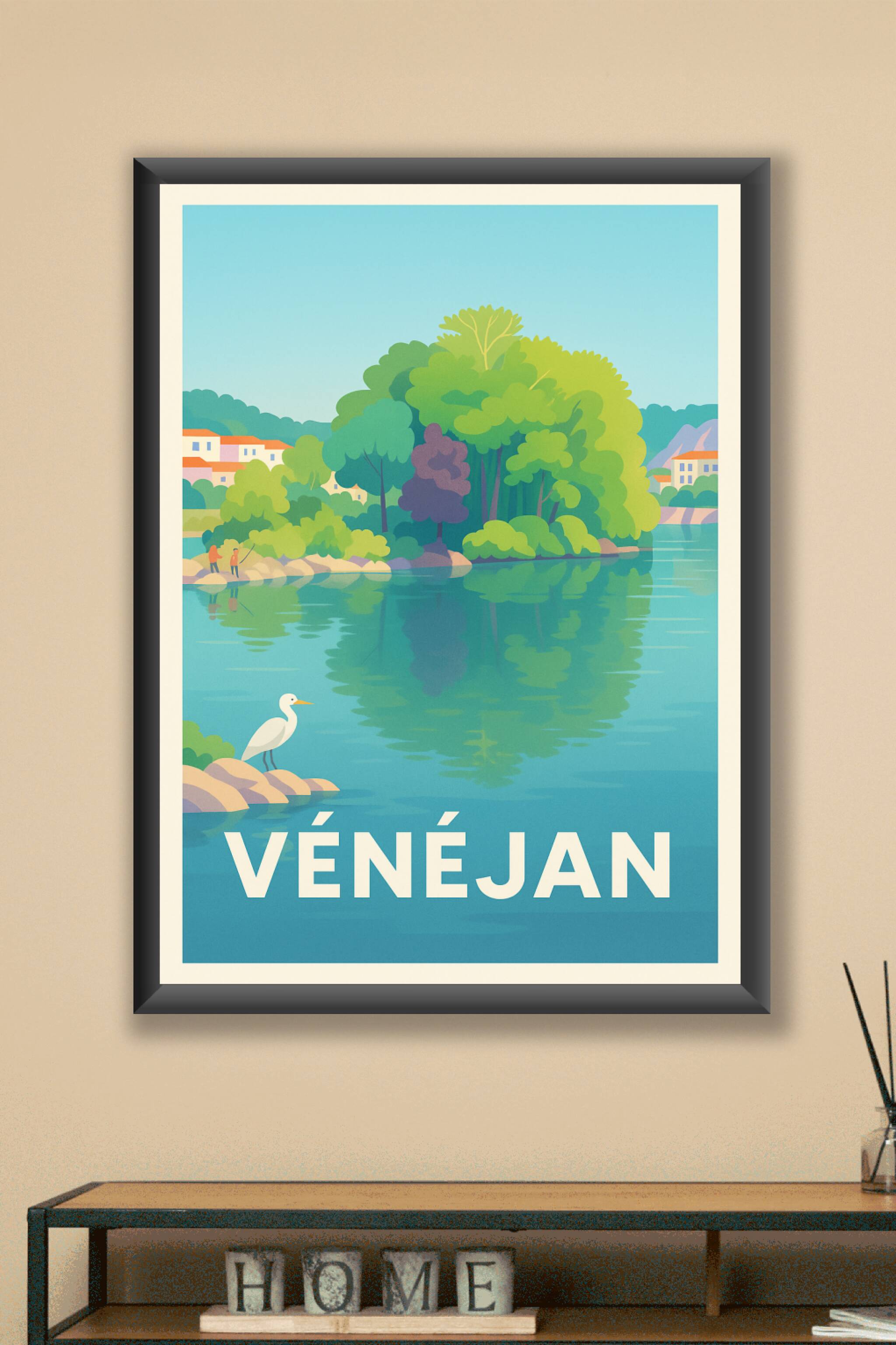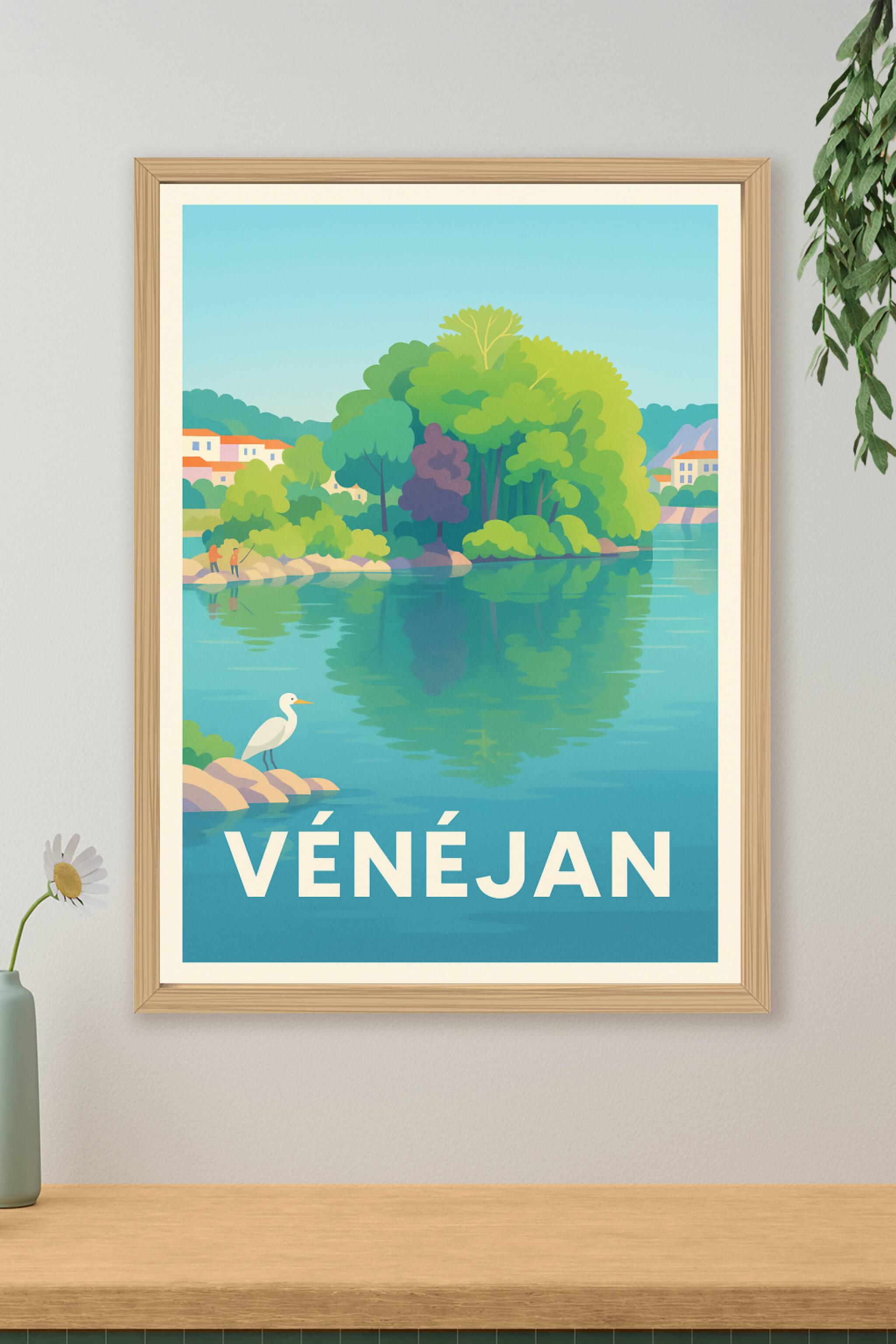 Apportez une touche de calme et de nature dans votre intérieur avec cette affiche illustrée représentant les paisibles rives de Vénéjan, ville au c...