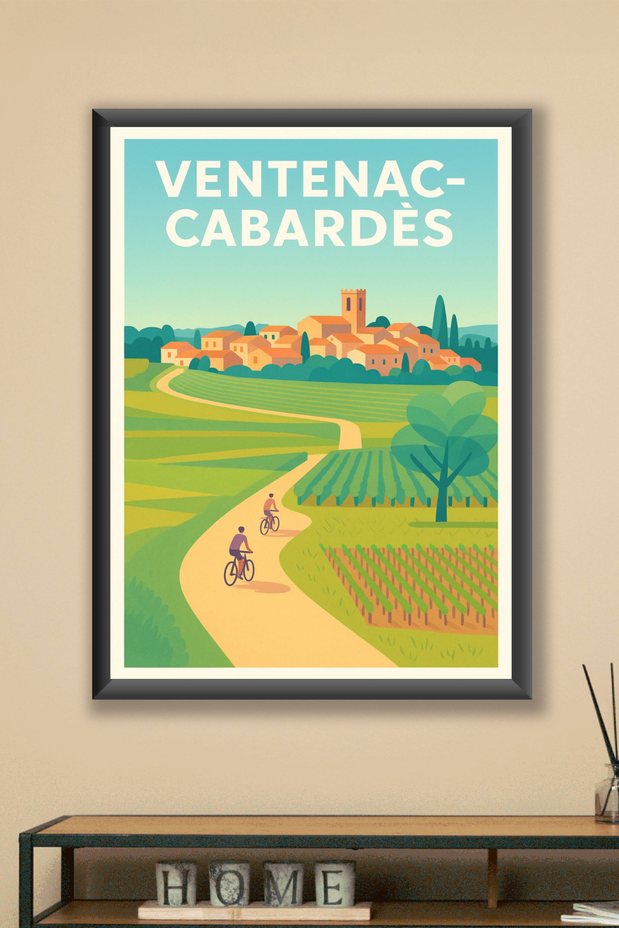 Découvrez la douce atmosphère de Ventenac-Cabardès à travers cette affiche illustrée qui sublime ses paysages verdoyants et ses ruelles typiques. Le poster met en scène une balade à vélo, invitant à l'évasion et à la découverte de ce charmant village. Imprimée en tirage "Fine Art" sur papier 305g coton pour une qualité d'impression exceptionnelle, cette affiche est disponible en formats A1 à A4, avec ou sans cadre. Parfaite pour décorer votre intérieur ou offrir un souvenir unique, elle apporte une touche d'authenticité et de sérénité à votre décoration. Profitez d'un produit 100% fabriqué en France qui célèbre l'art de vivre à la française.
