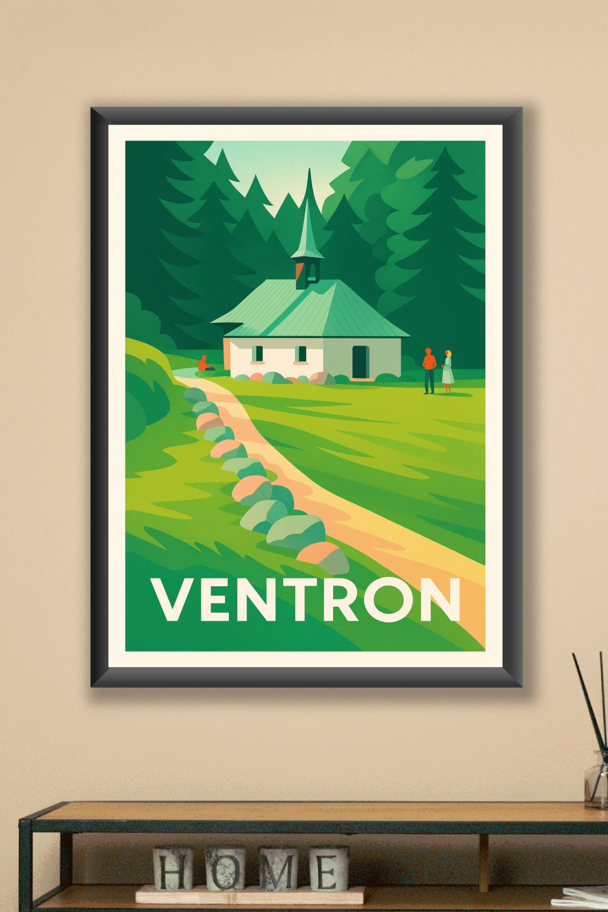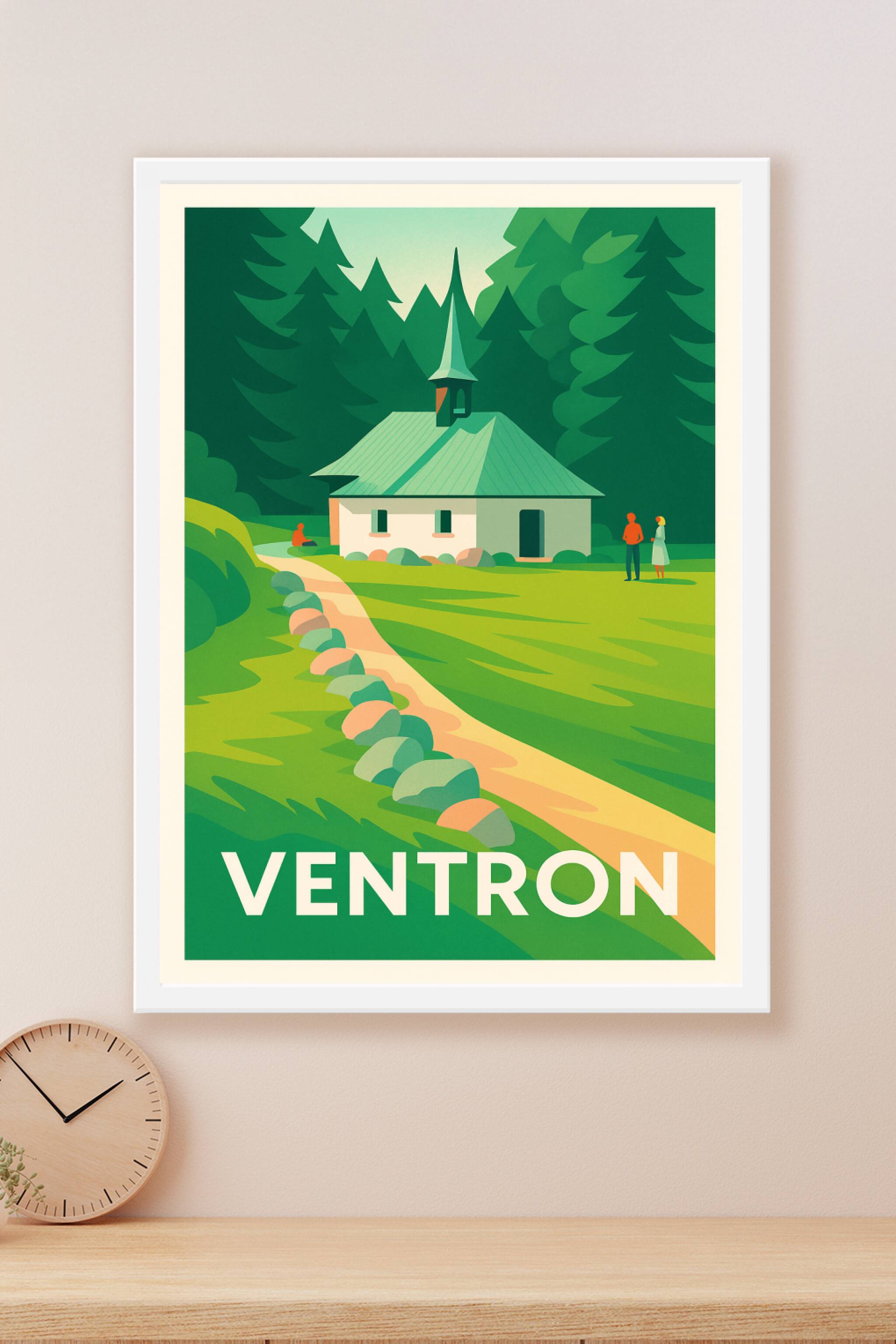 Découvrez la sérénité et la beauté naturelle de Ventron avec cette affiche au style vintage épuré qui met en avant une charmante chapelle nichée au...
