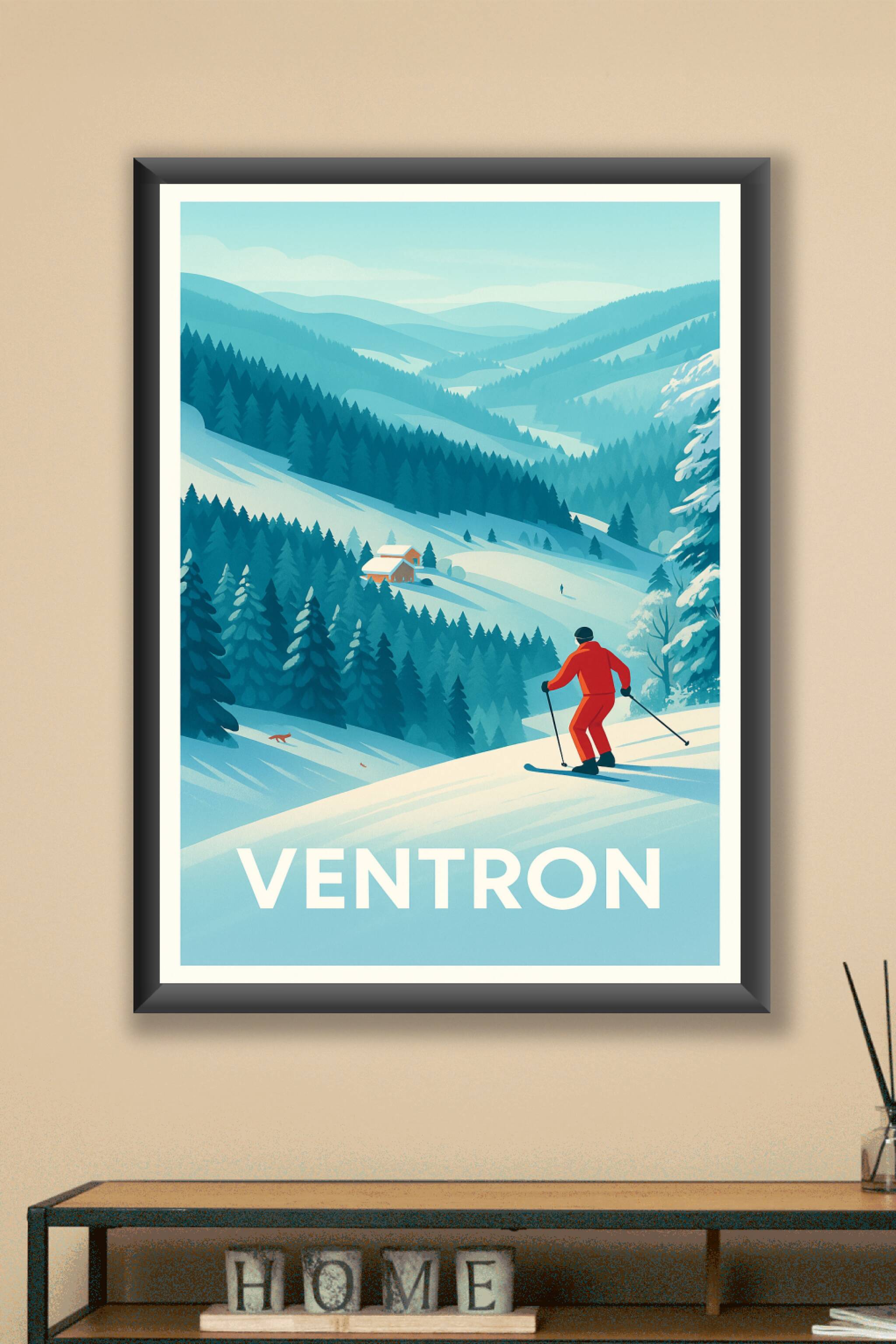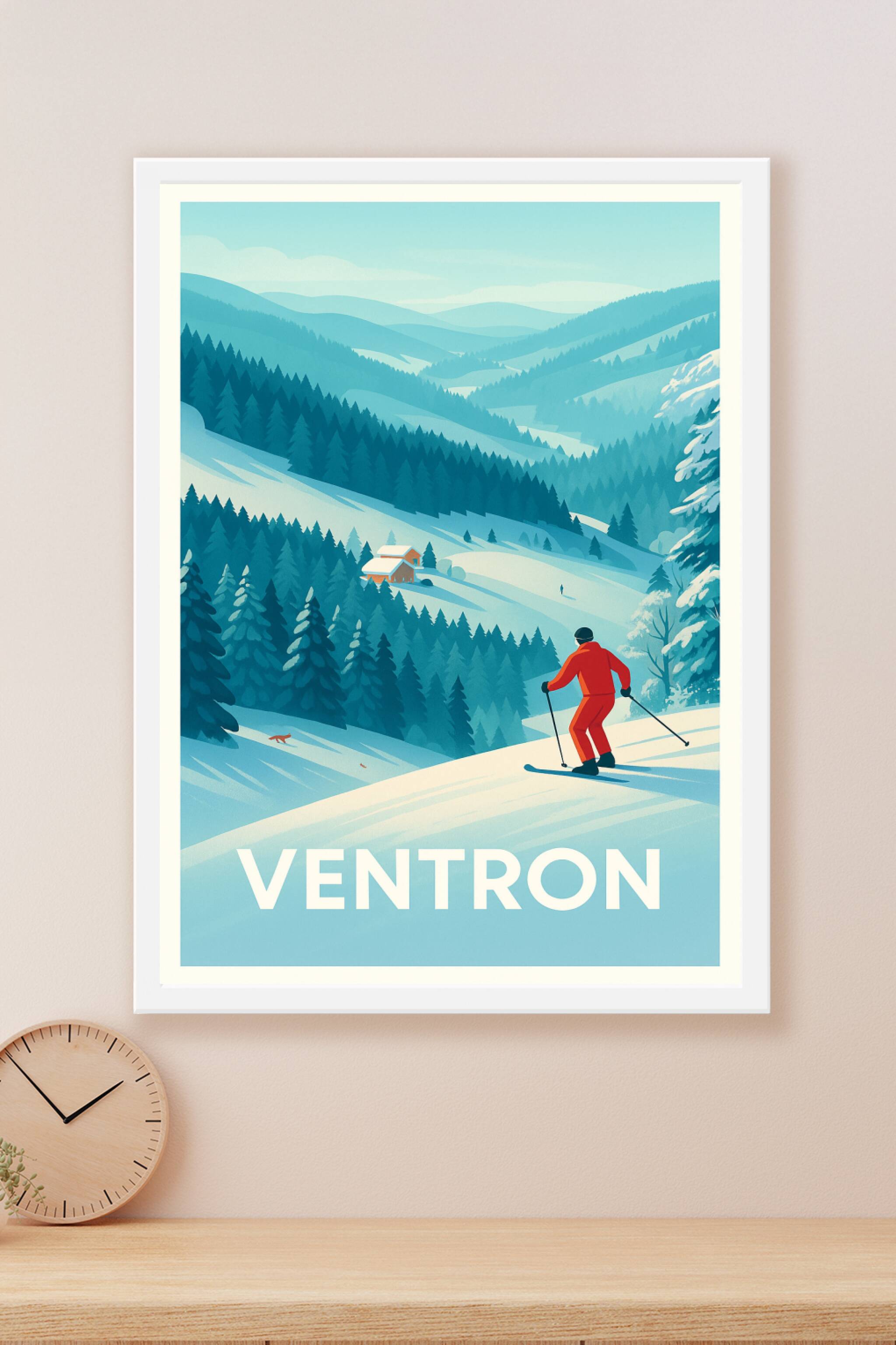 Découvrez l'ambiance paisible et authentique de Ventron avec cette affiche illustrée mettant en scène un skieur rouge se frayant un chemin au milie...