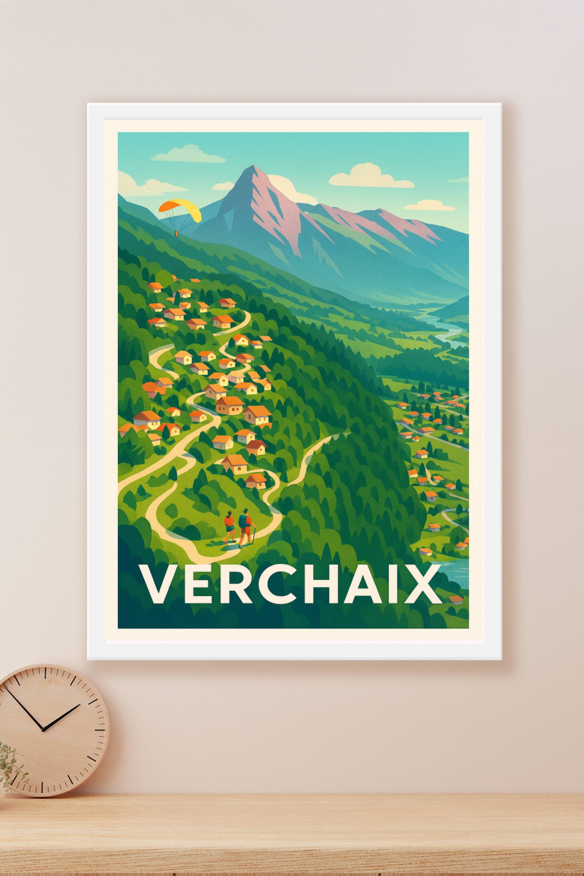 Découvrez la beauté sereine de Verchaix avec cette affiche vintage représentant un paysage de montagne pittoresque, entre vallées verdoyantes et se...