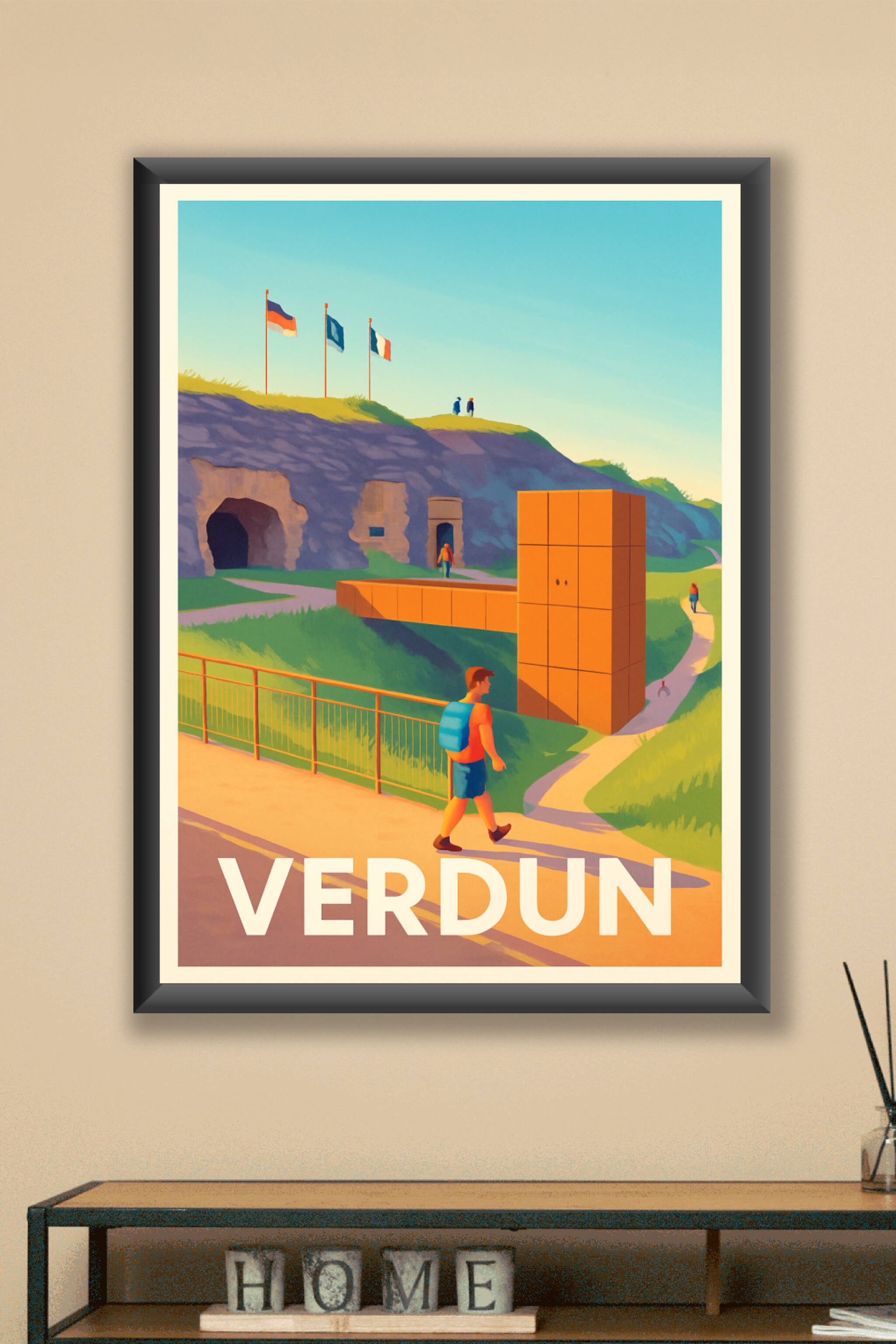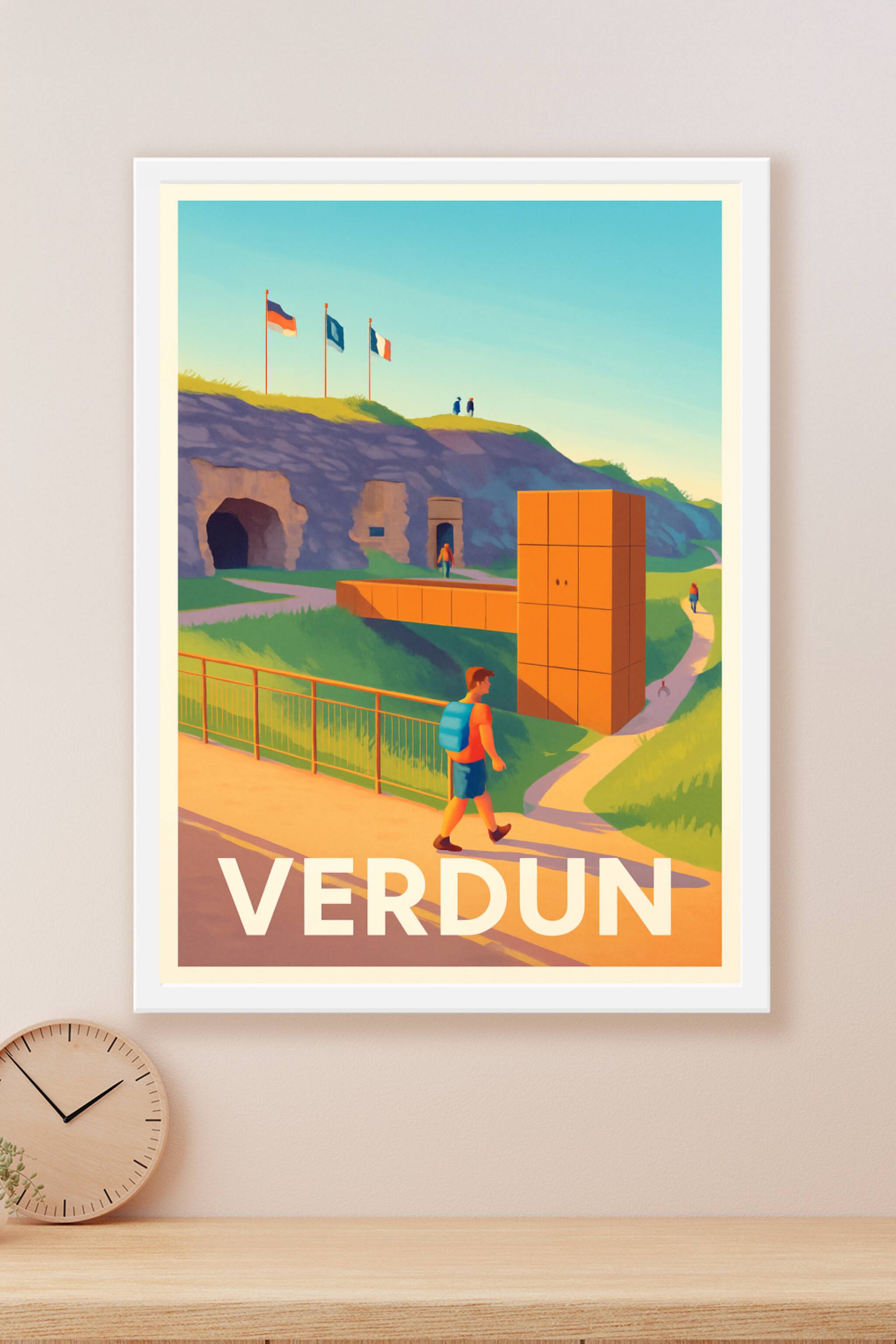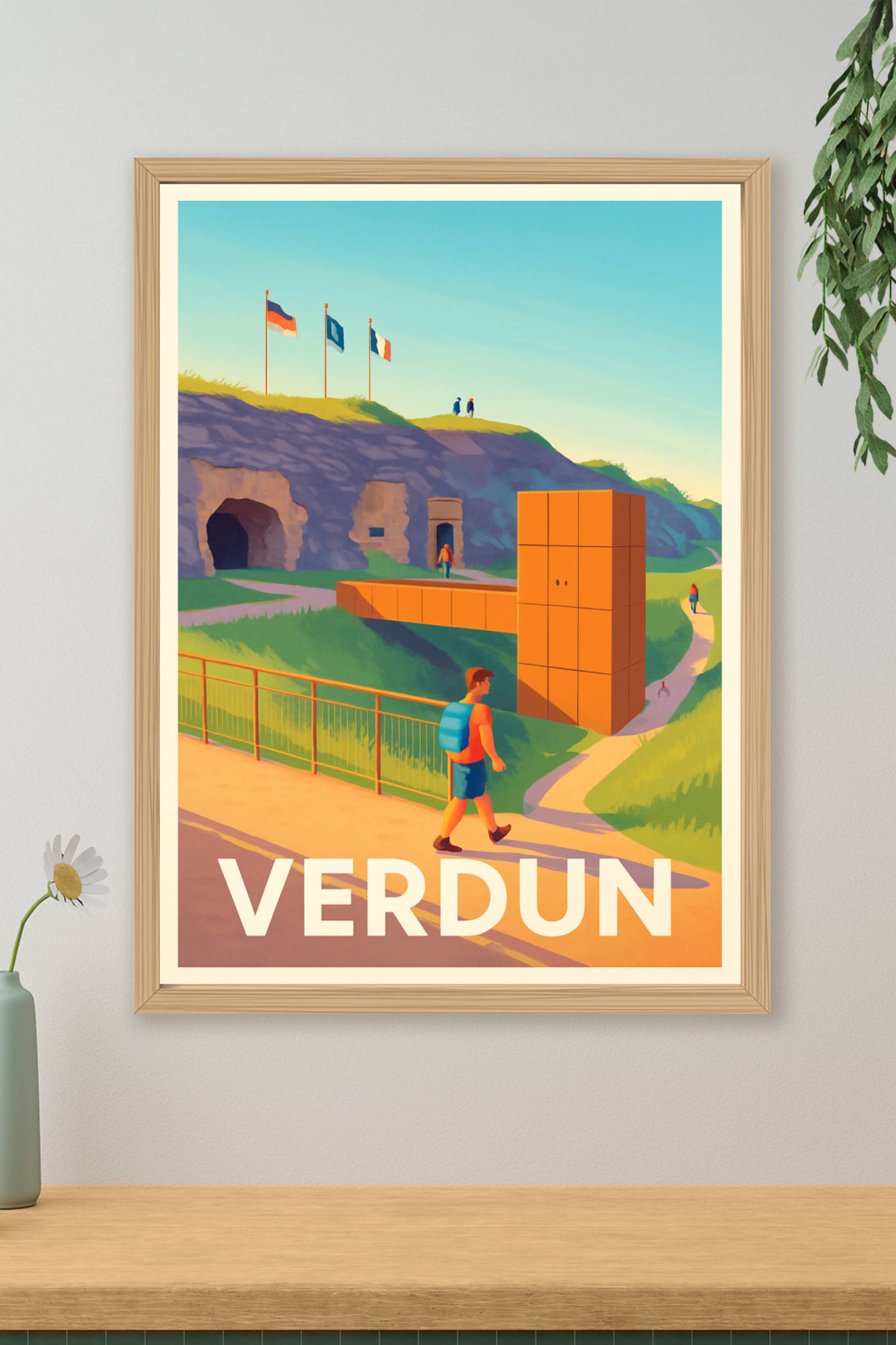 Découvrez Verdun, ville emblématique chargée d'histoire, avec cette affiche au style vintage captivant. Le poster met en avant les bunkers et le pa...