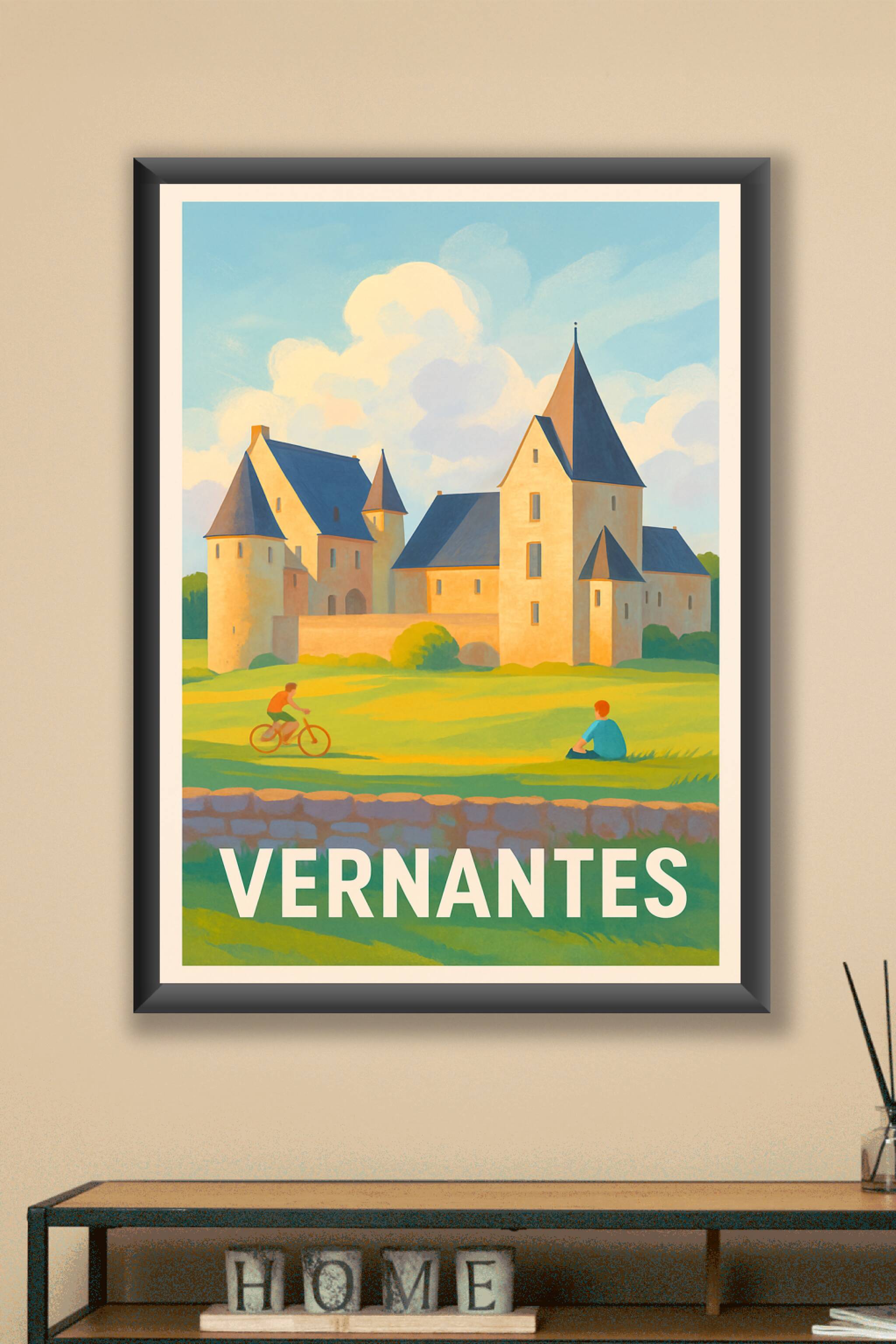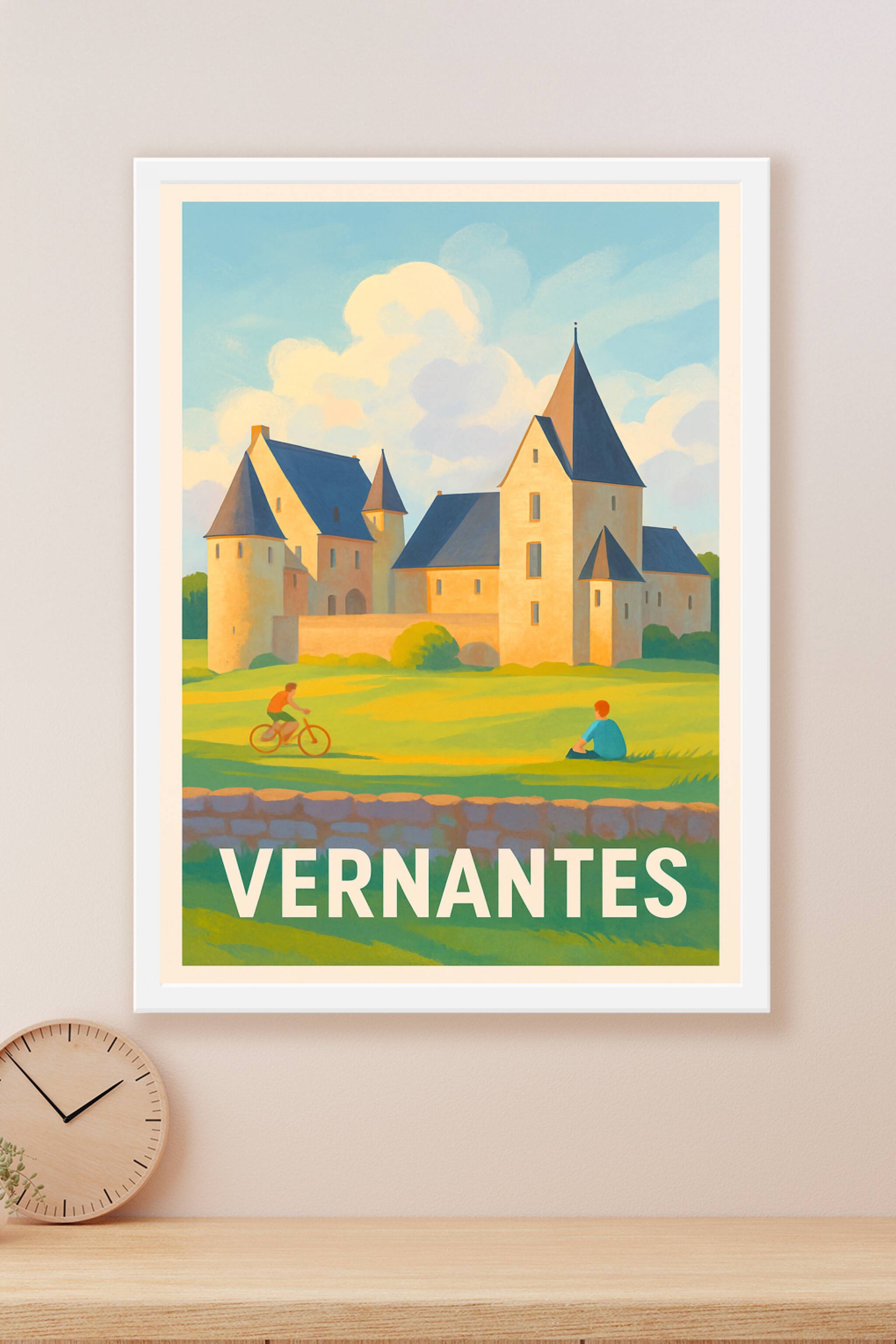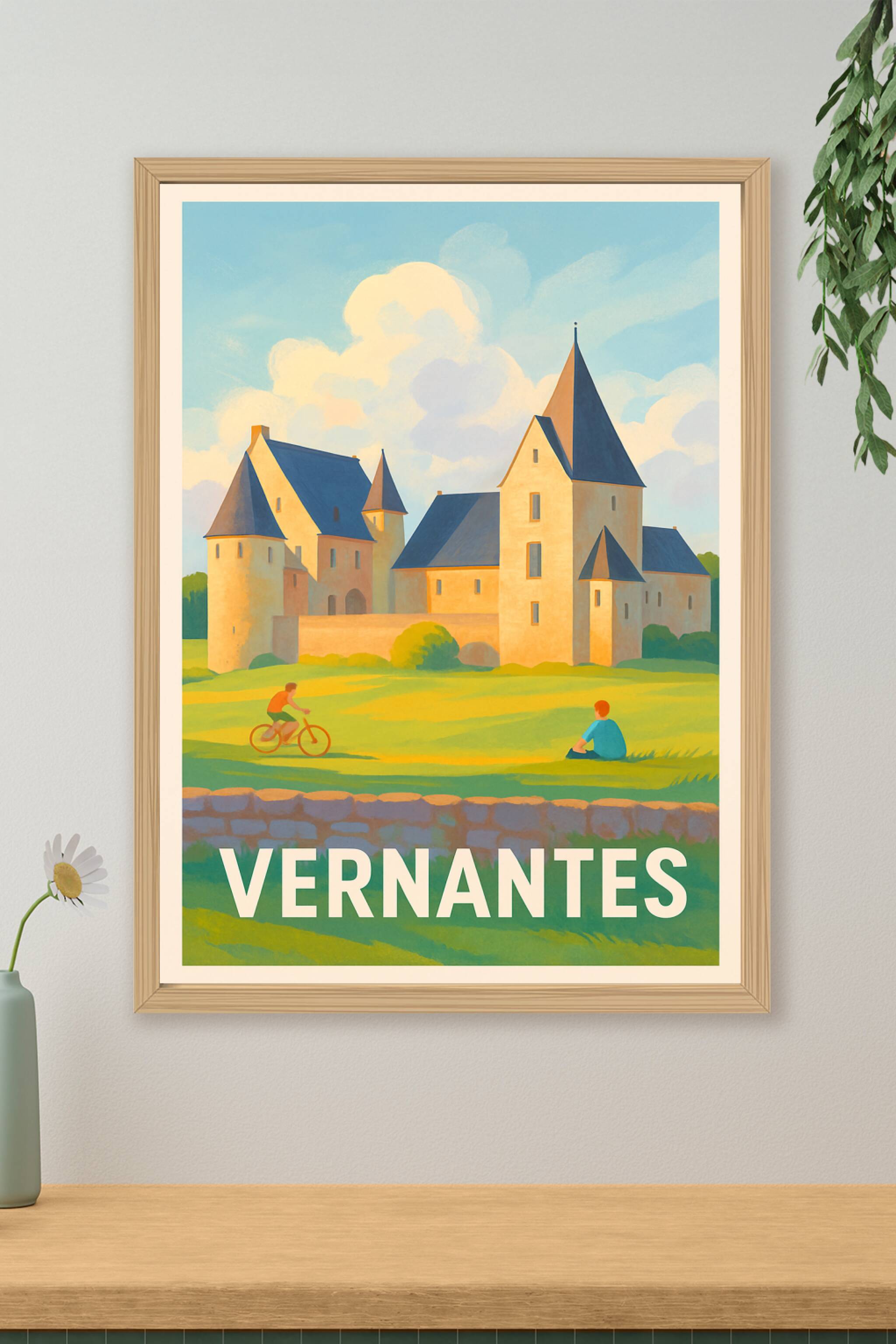 Découvrez l'élégance bucolique de Vernantes avec cette affiche illustrée mettant en scène un magnifique château baigné de lumière douce, sous un ci...