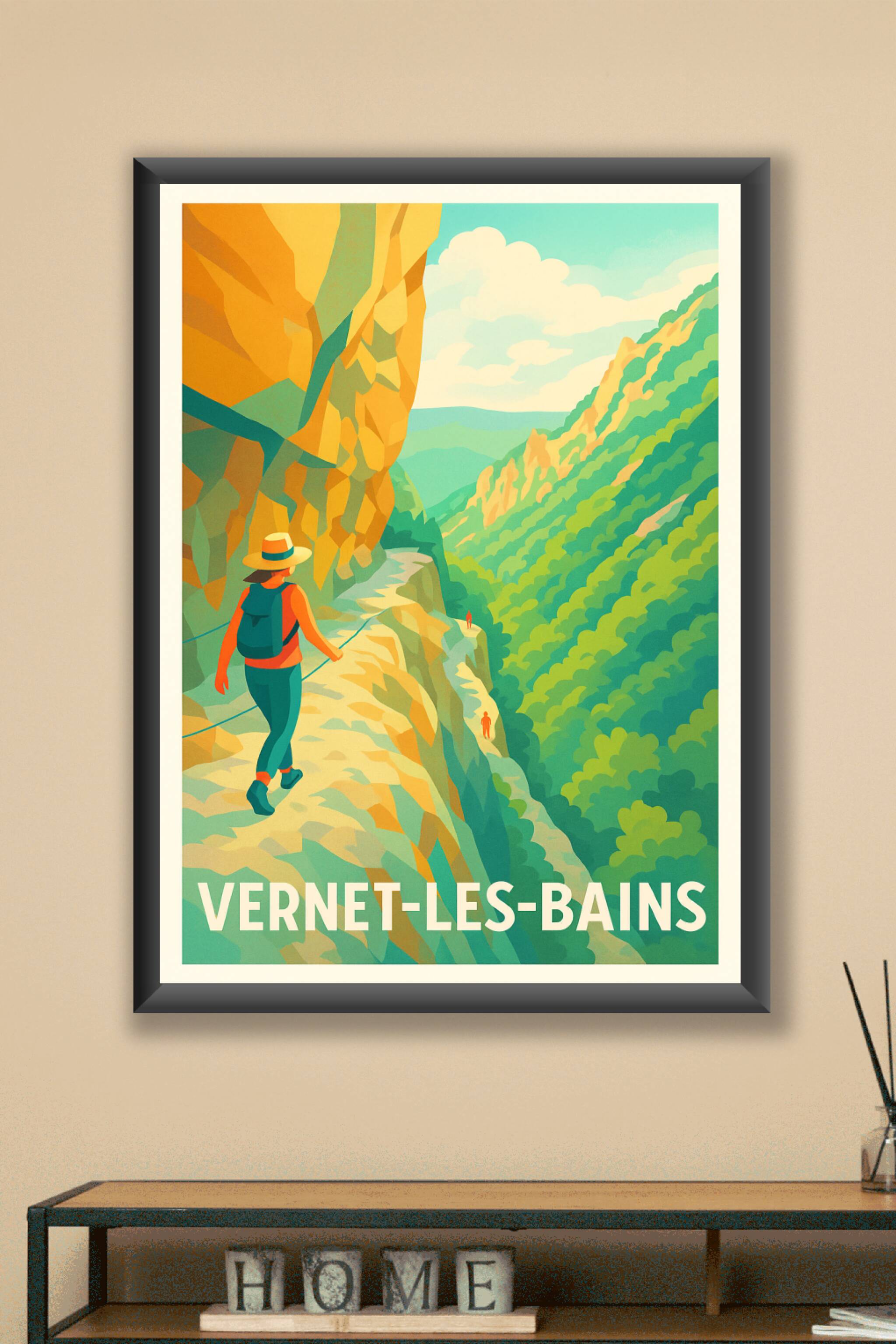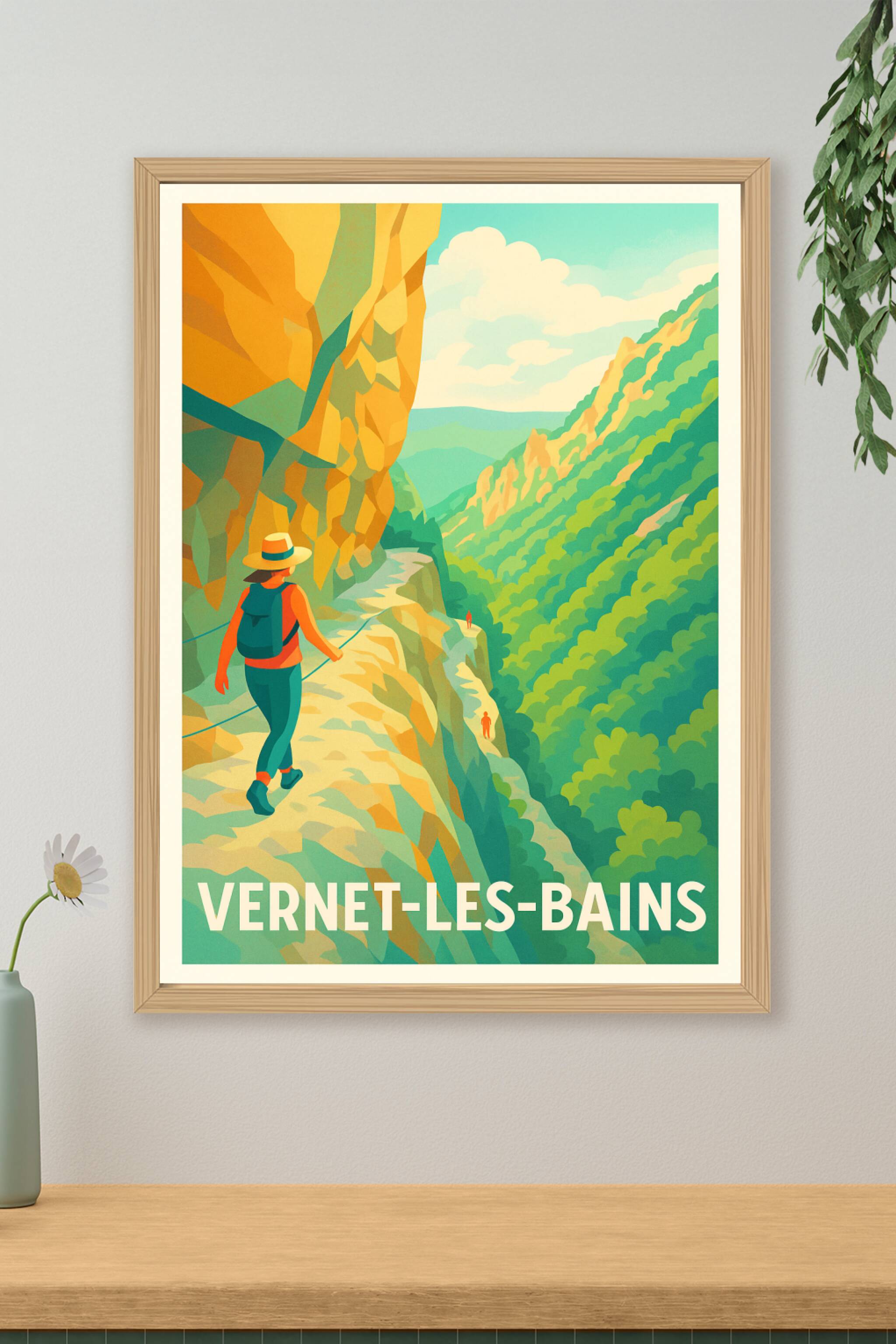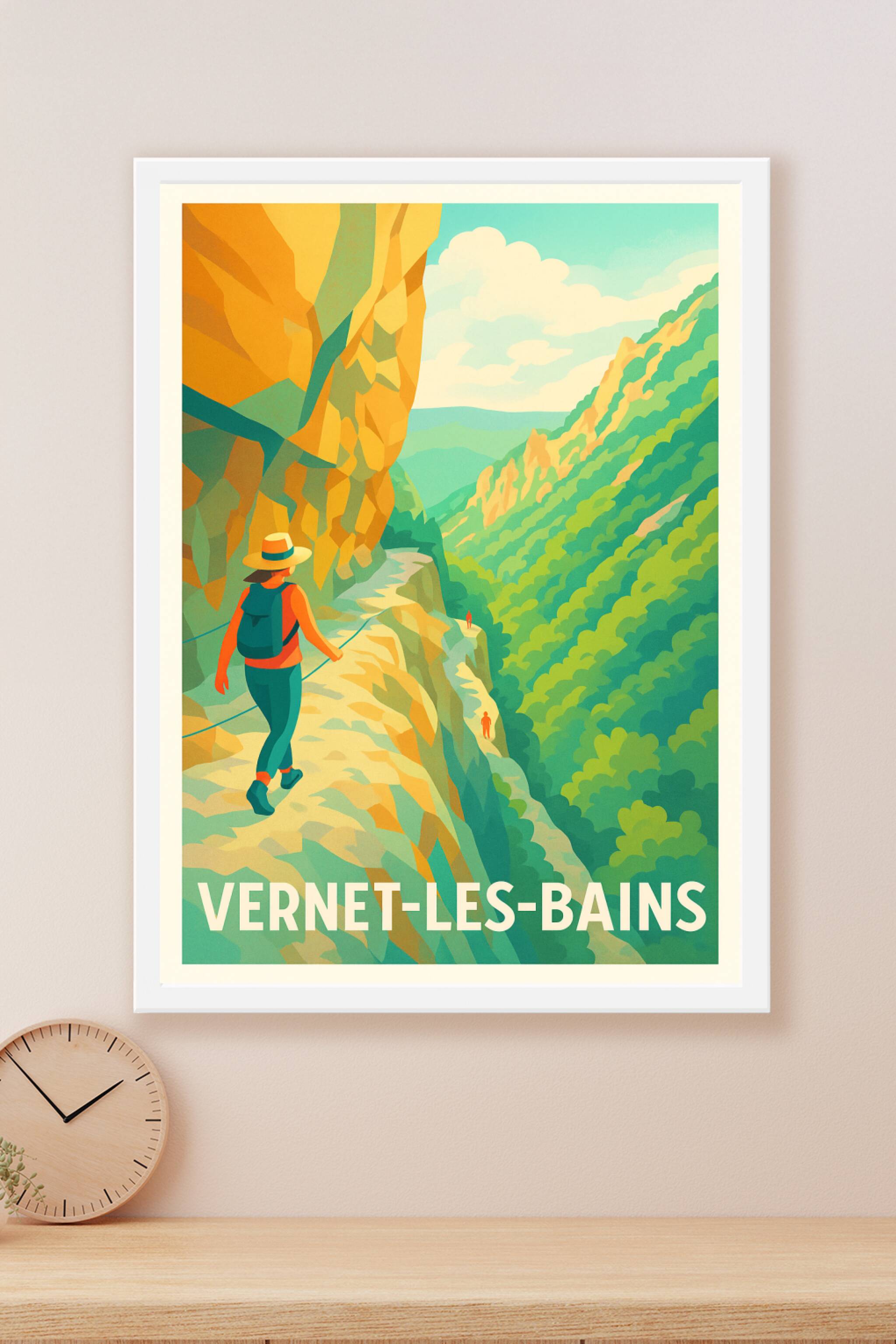 Découvrez la beauté sauvage de Vernet-les-Bains avec cette affiche illustrée qui capture l'essence des sentiers escarpés et des paysages montagneux...
