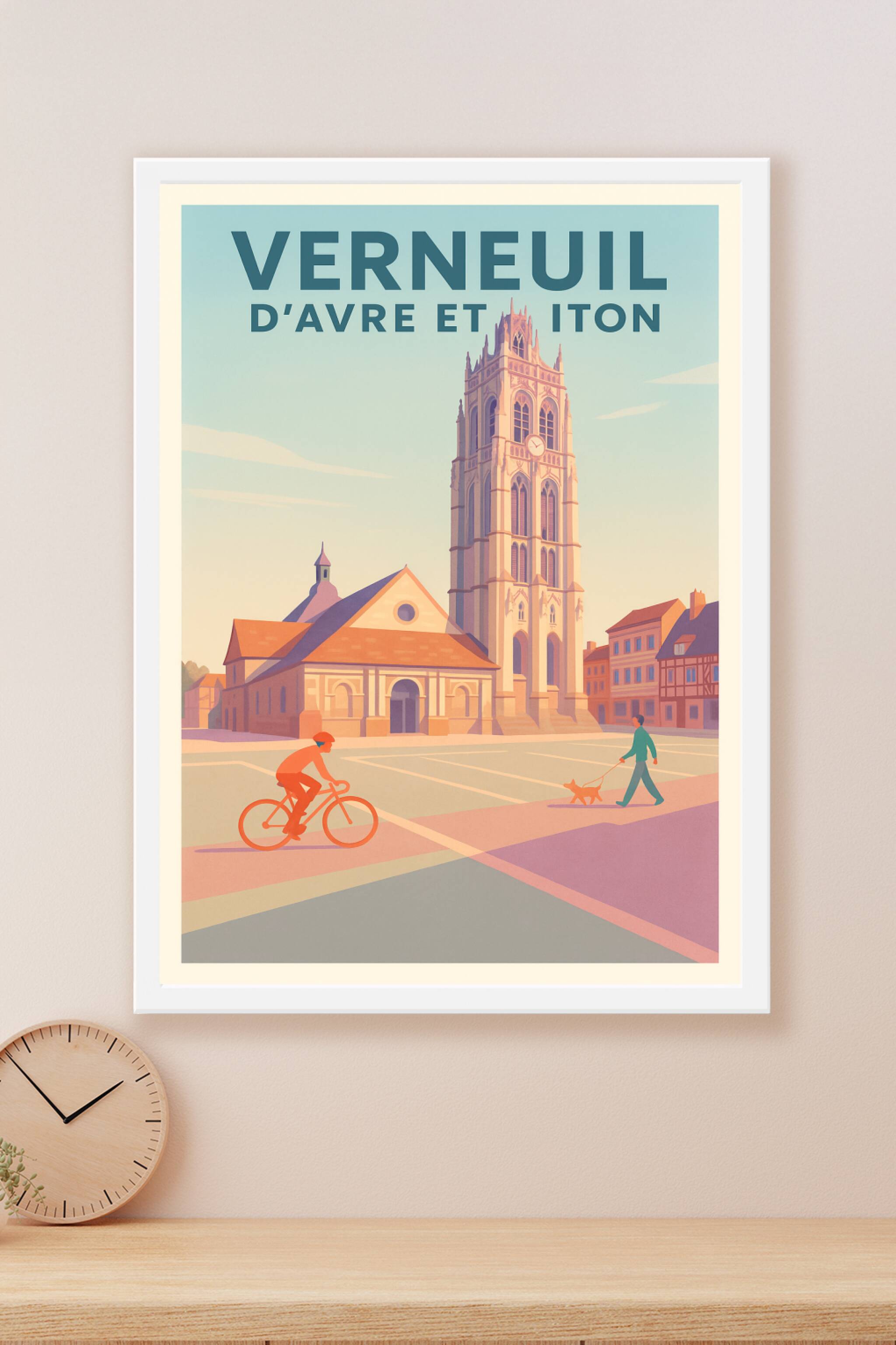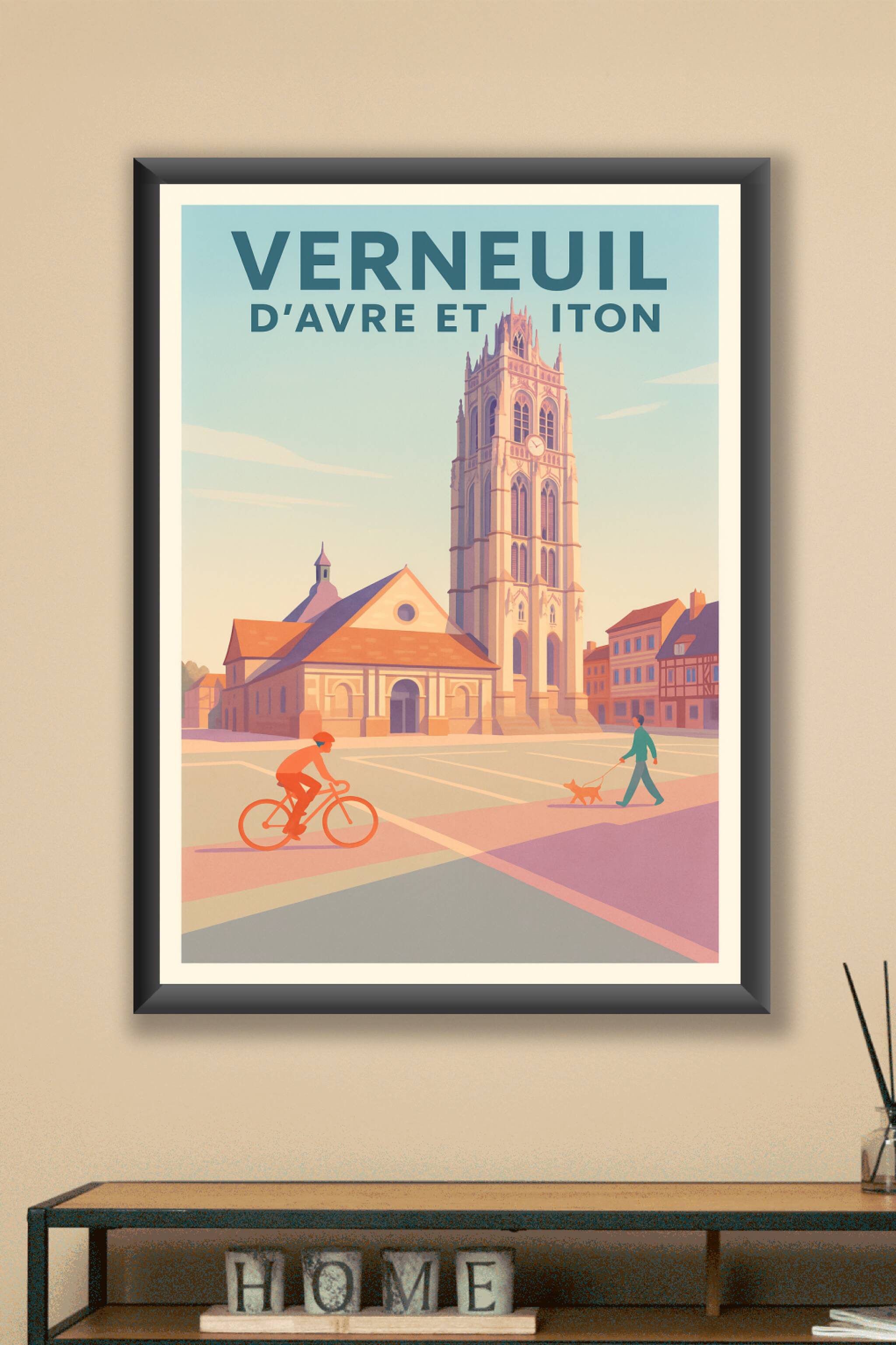 Découvrez le charme unique de Verneuil d'Avre et d'Iton à travers cette affiche élégante illustrant la majestueuse architecture locale sous une lum...