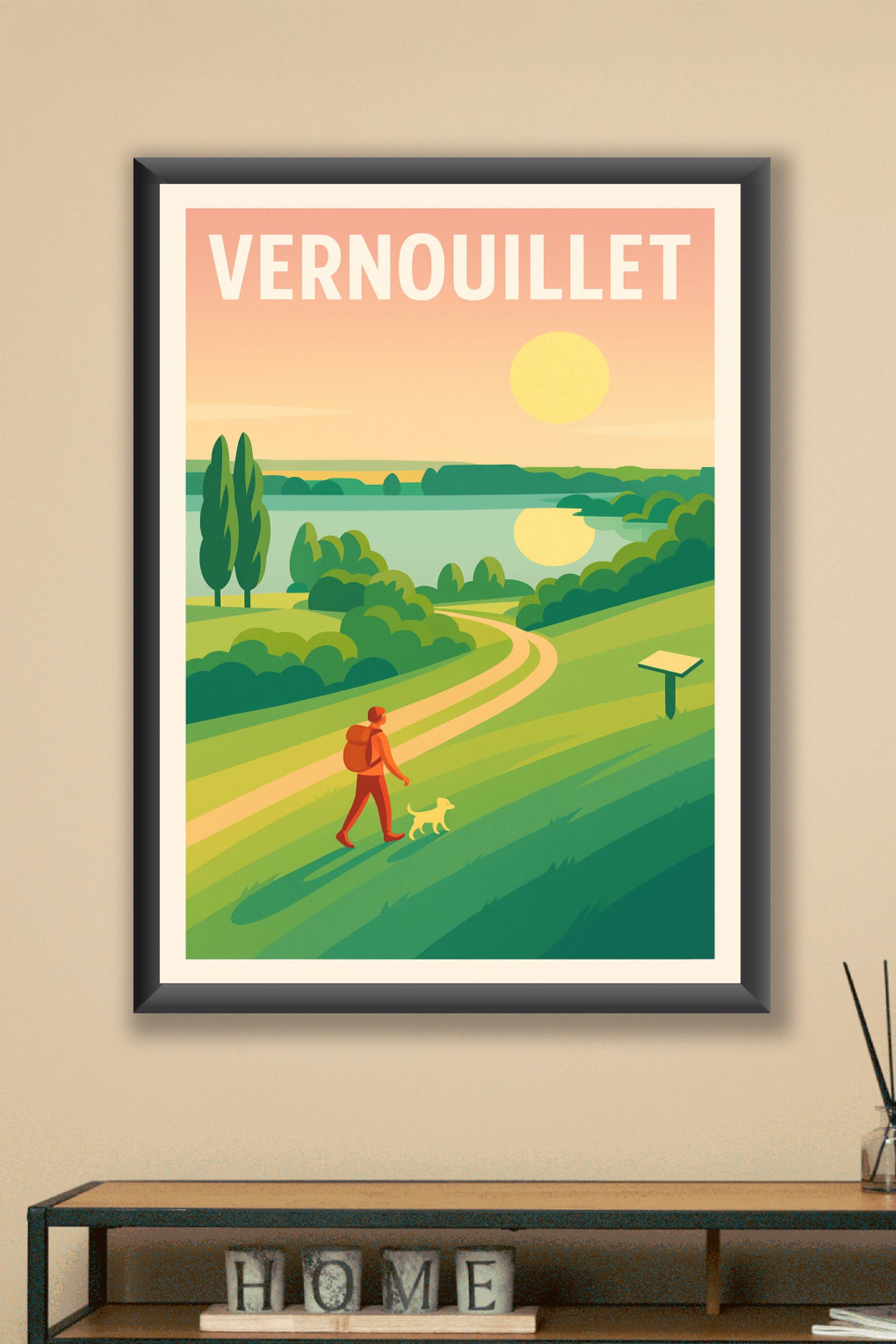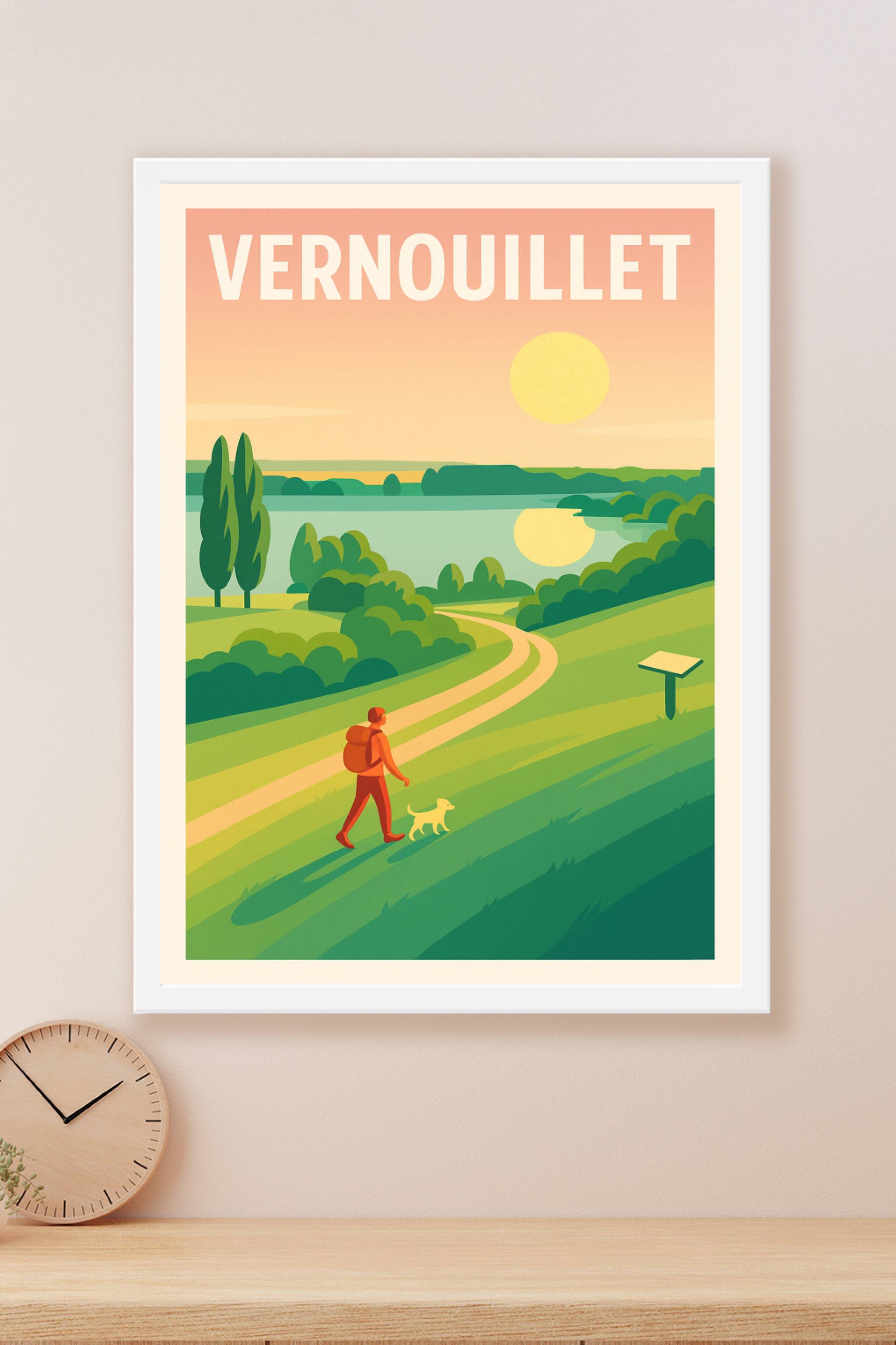 Découvrez la douceur de vivre à Vernouillet avec cette affiche illustrée qui capture une balade paisible au coucher du soleil, où la nature se mêle...