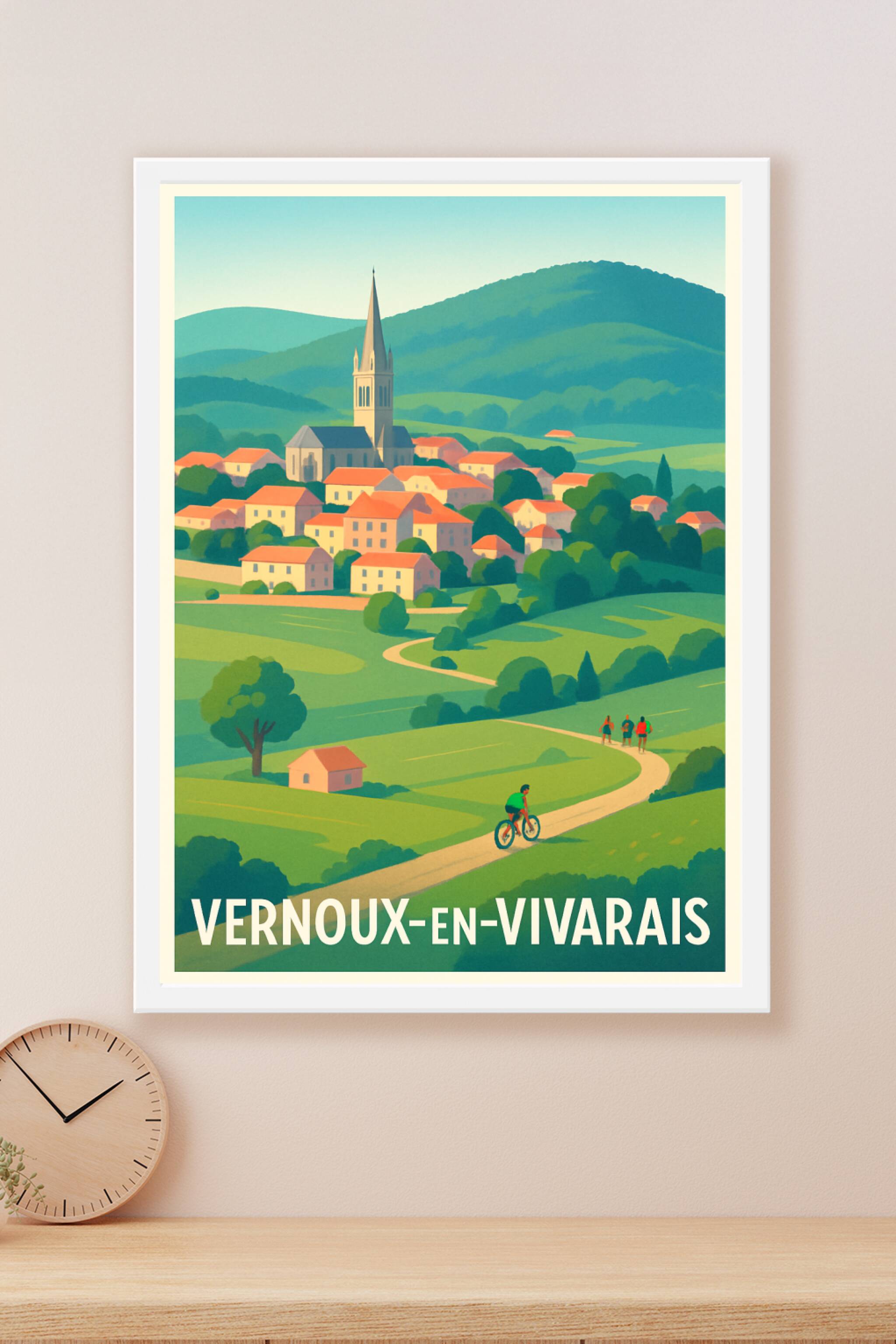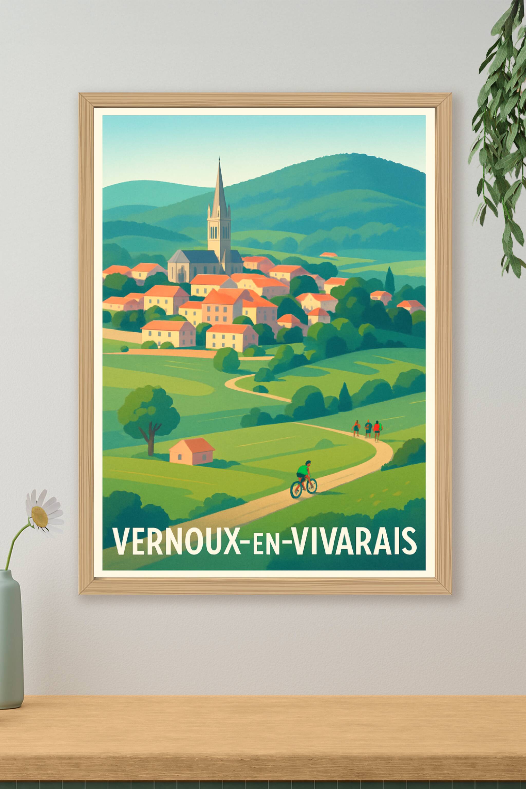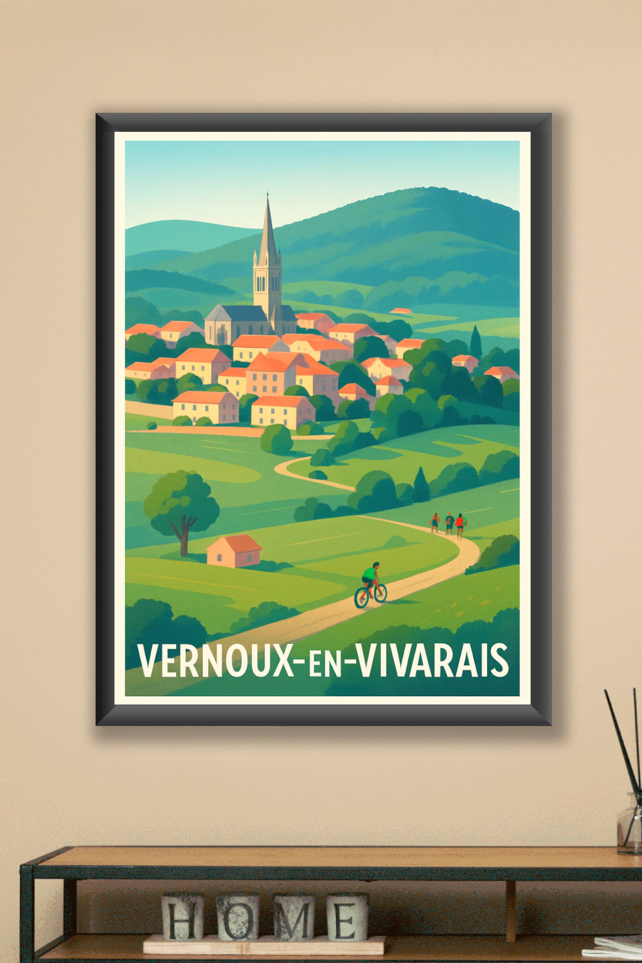 Découvrez la beauté paisible et authentique de Vernoux-en-Vivarais à travers cette affiche illustrée, évoquant les paysages verdoyants et les charm...