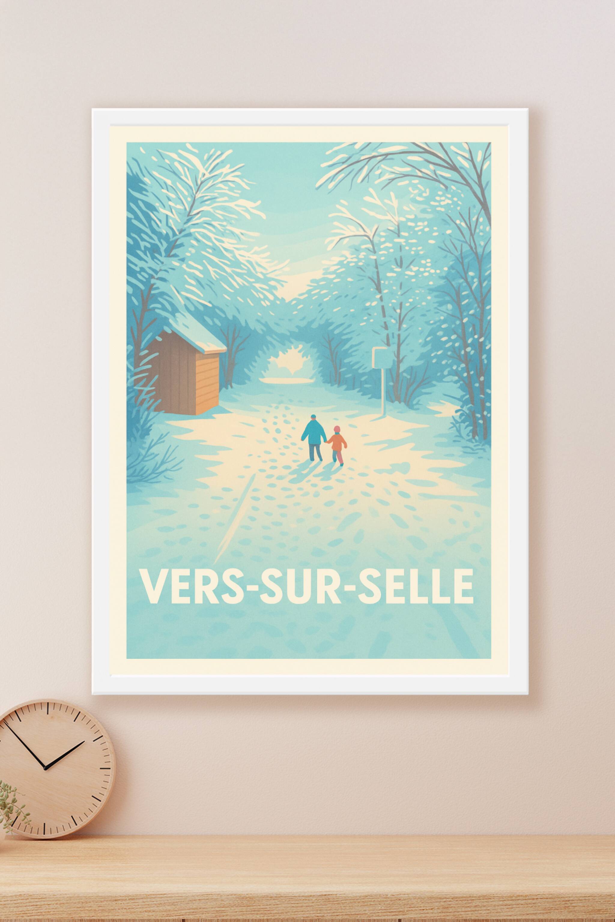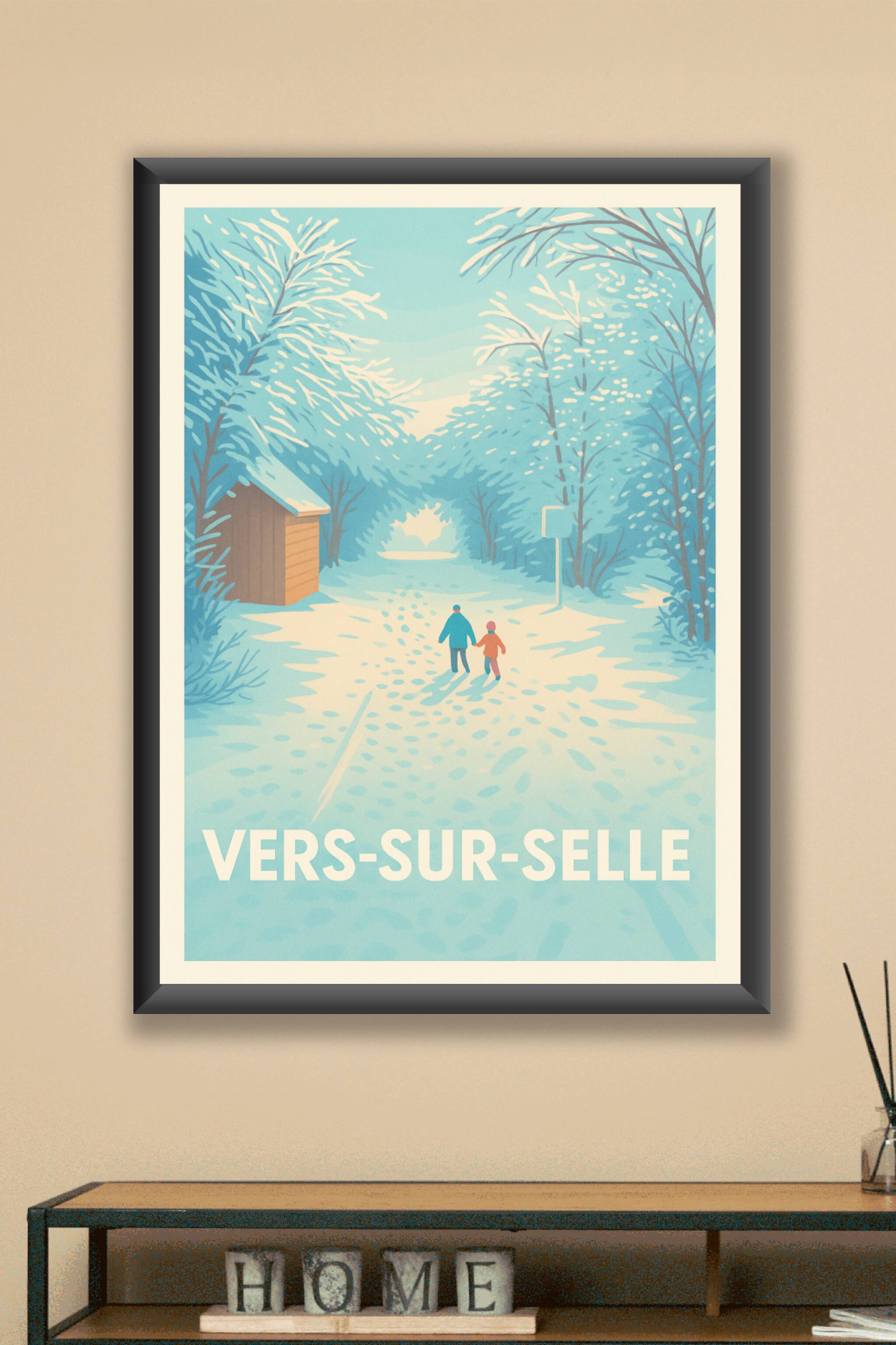 Découvrez l'atmosphère paisible et féérique de Vers-sur-Selle en hiver avec cette affiche illustrée où deux silhouettes marchent main dans la main ...