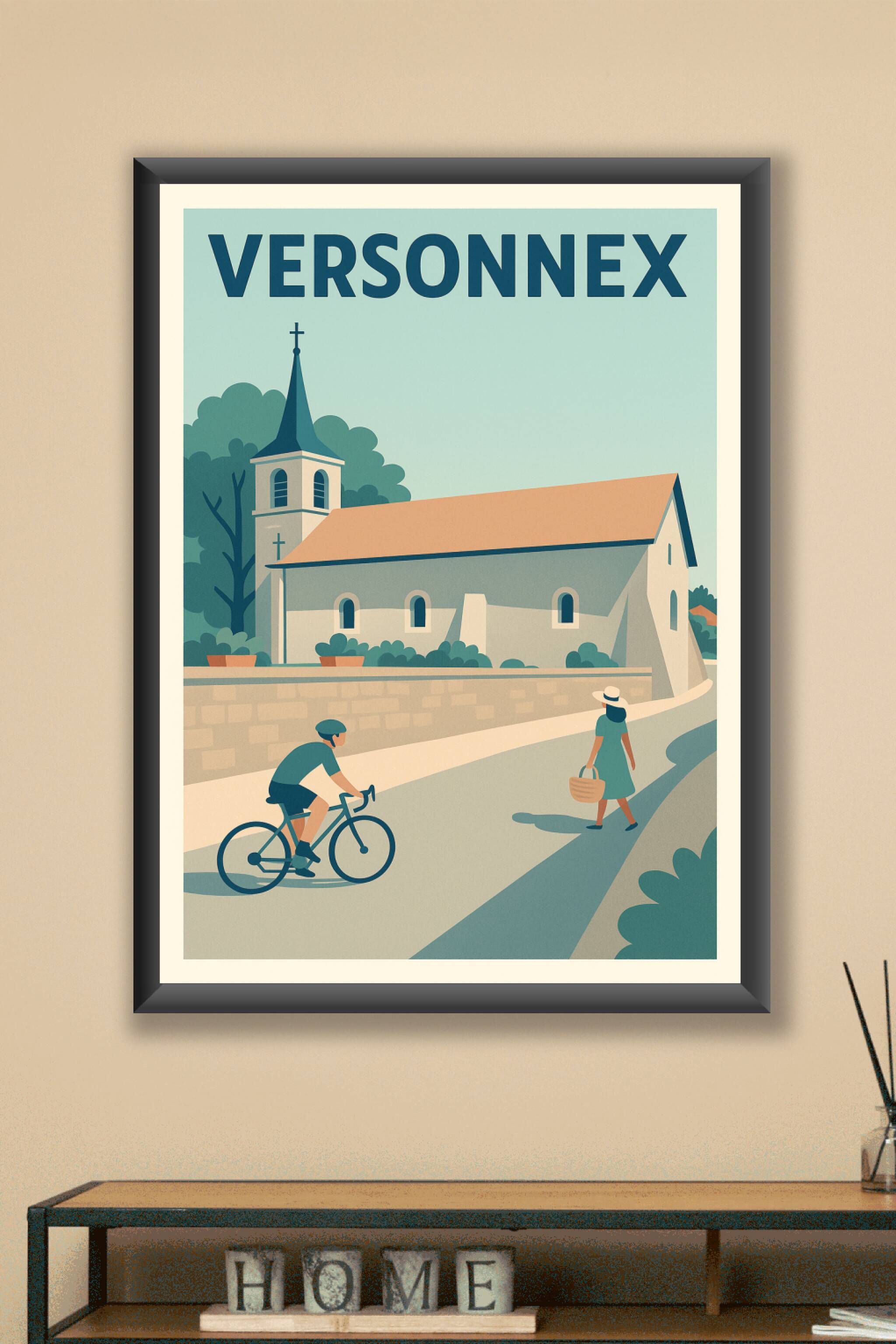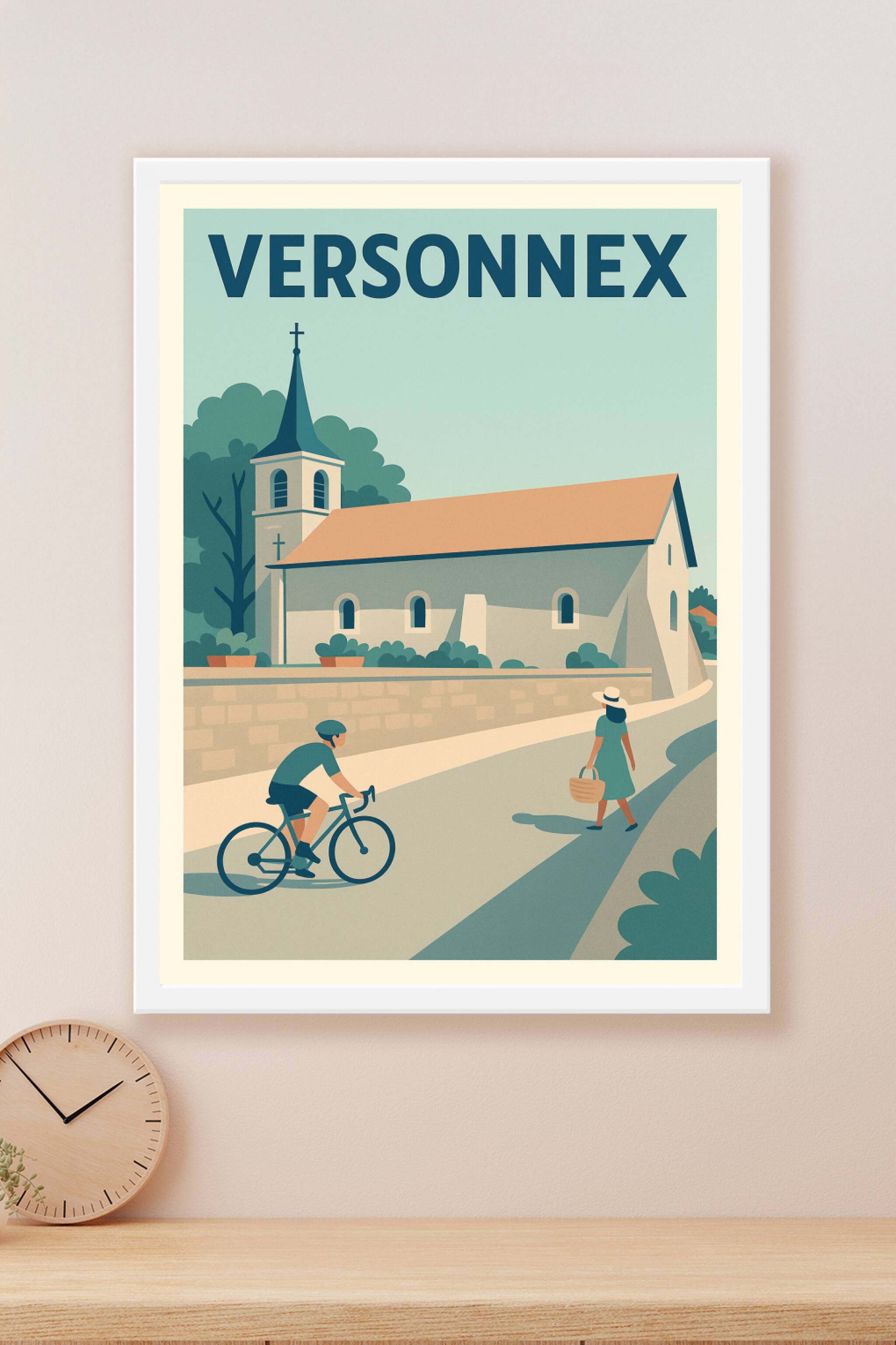 Découvrez la sérénité de Versonnex avec cette affiche illustrée mettant en scène un charmant village au style épuré et coloré. La représentation d'une église au clocher sobre, entourée de verdure, accompagne harmonieusement les silhouettes d'un cycliste et d'une promeneuse, illustrant un moment de calme et de douceur de vivre.Ce poster est imprimé en tirage "Fine Art" sur papier 305g coton, garantissant une qualité d'impression exceptionnelle et une tenue durable dans le temps. Disponible en formats A1 à A4, avec ou sans cadre, il saura sublimer tous les intérieurs, du plus moderne au plus traditionnel.Offrez-vous ou offrez à vos proches une touche d'élégance et d'authenticité avec cette affiche premium, 100% fabriquée en France, qui célèbre la beauté discrète de Versonnex.