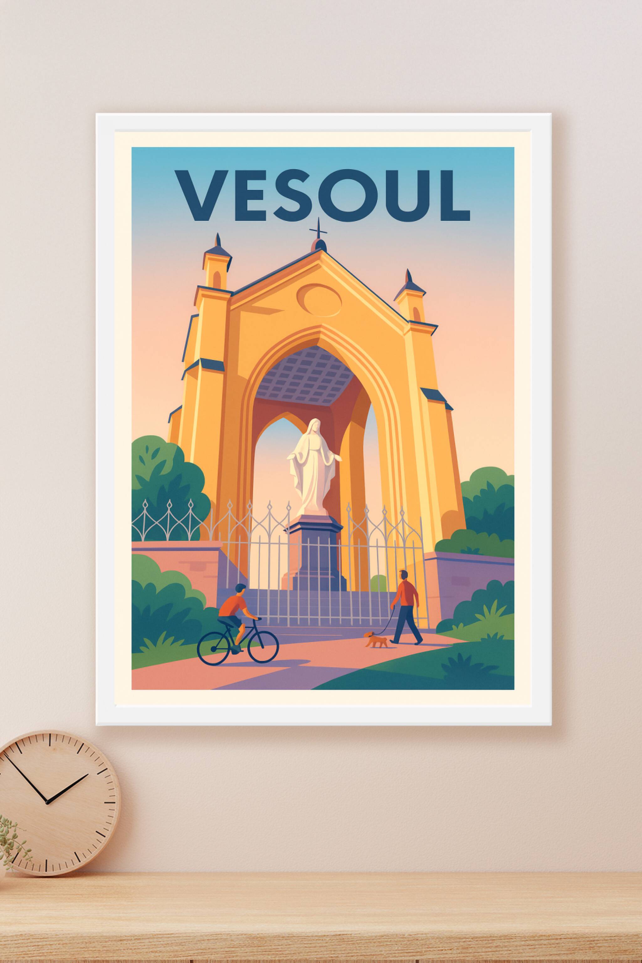 Découvrez la douceur et le calme de Vesoul avec cette affiche représentant une scène emblématique de la ville, où l'architecture religieuse se mêle...