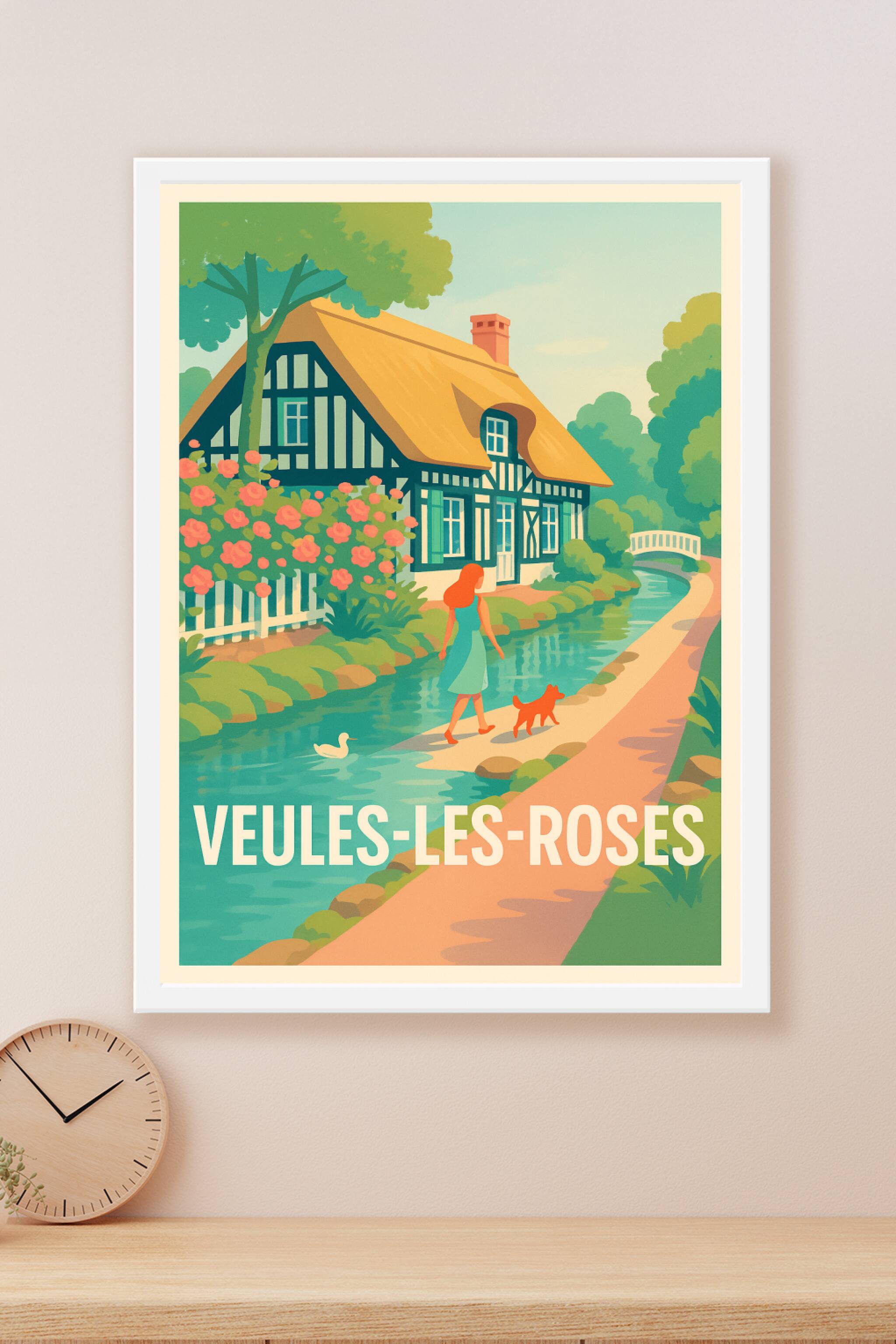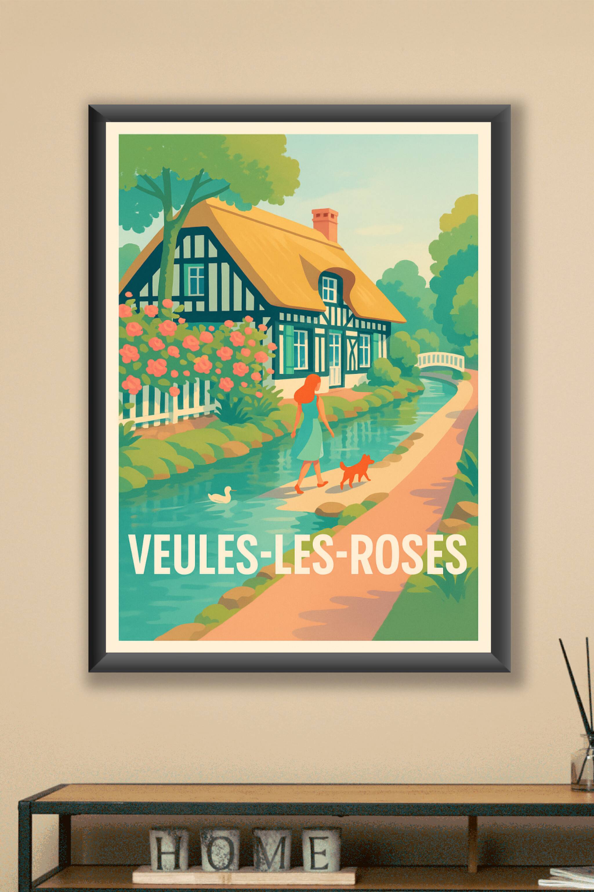 Découvrez le charme bucolique de Veules-les-Roses avec cette affiche illustrée qui met en scène une maison à colombages typique, un paisible ruisse...