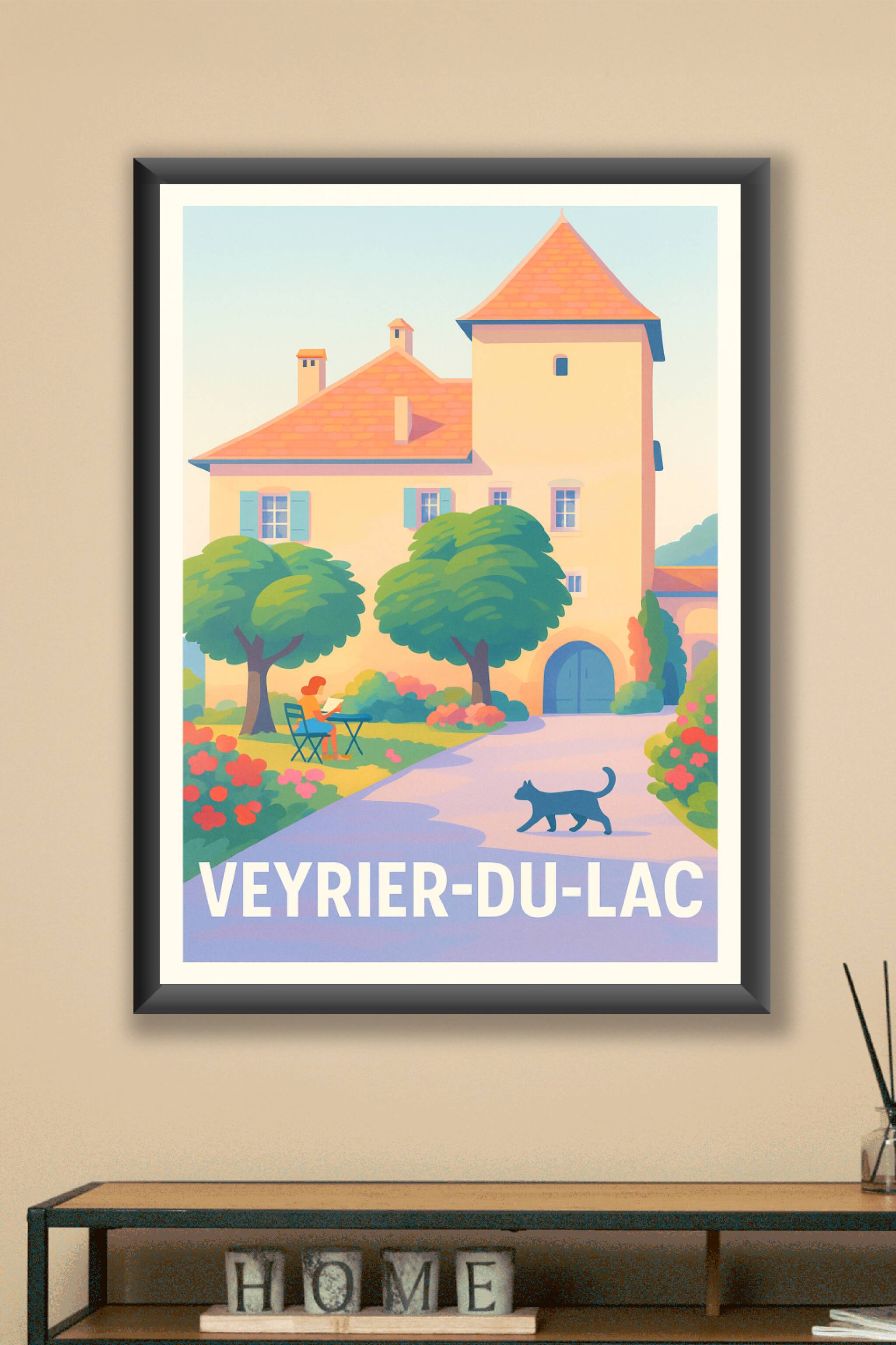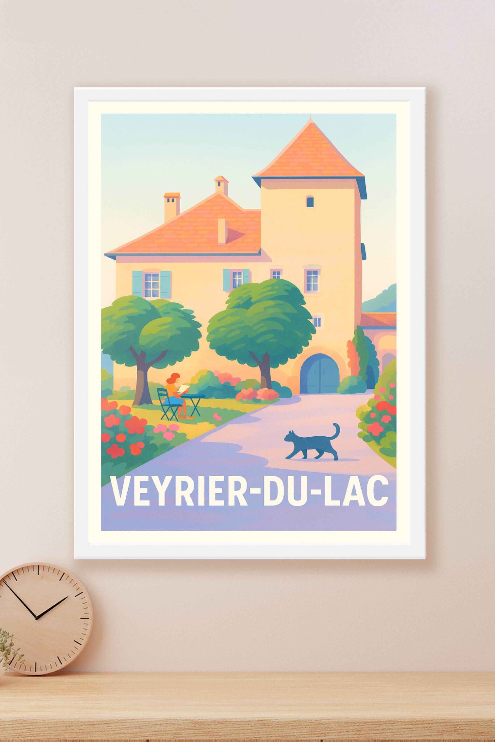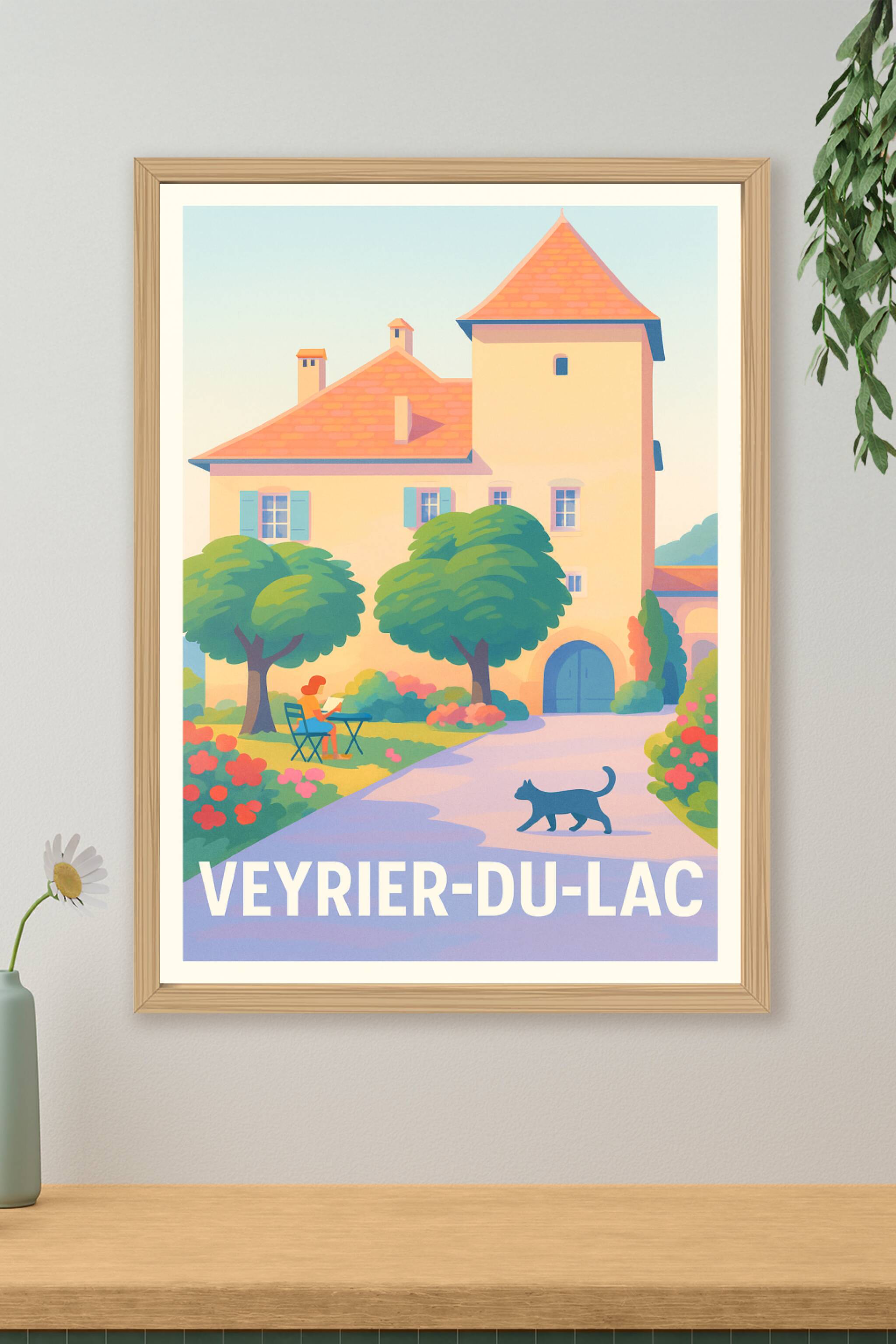 Découvrez la douceur et le charme bucolique de Veyrier-du-Lac avec cette affiche illustrée qui capture un moment paisible dans un jardin ensoleillé...